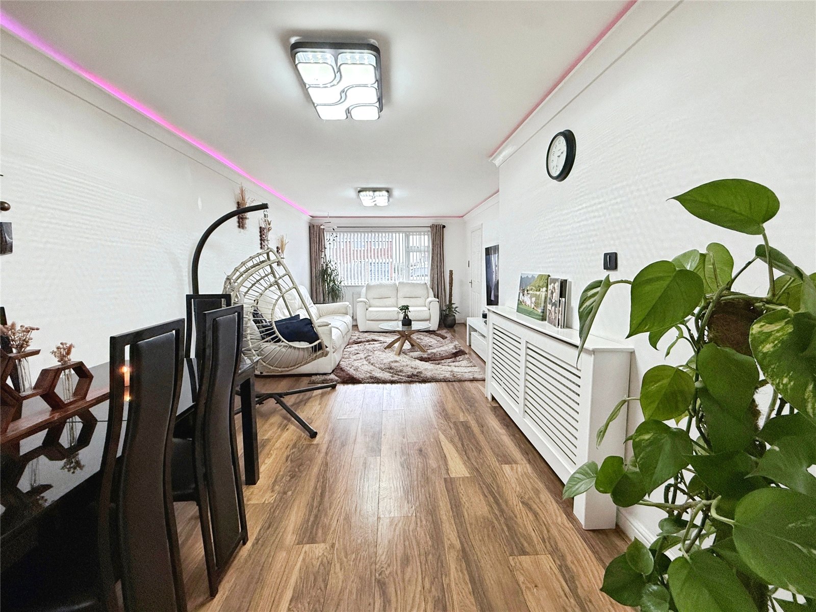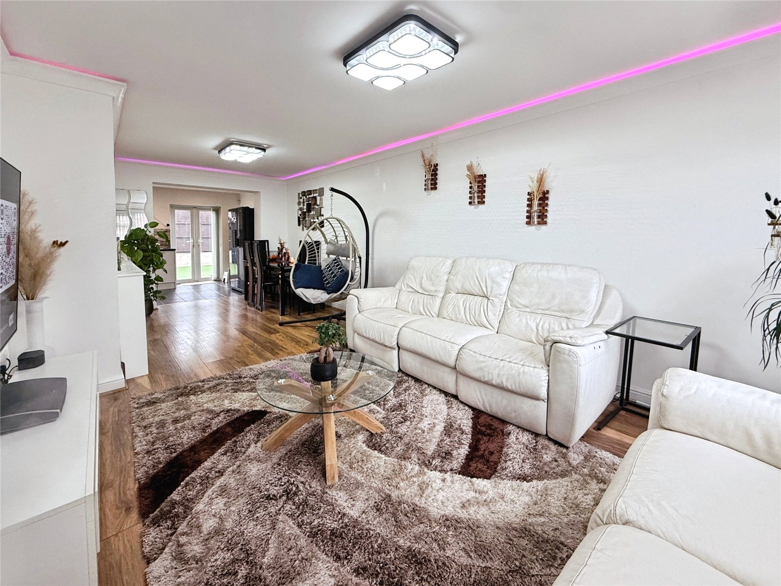 The property is entered via a porch which leads into a welcoming hallway, providing access to the ground floor accommodation and stairs rising to the first floor. The main living space is a spacious and light-filled open-plan lounge and dining area, offering plenty of room for both relaxing and entertaining. The layout allows for flexible furniture arrangements, with natural light enhancing the sense of space throughout.