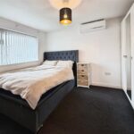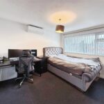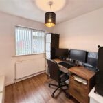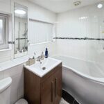 To the first floor, the landing provides access to all three bedrooms and the family bathroom. The main bedroom is a well-proportioned double room with space for wardrobes and additional furniture, while the second bedroom is another comfortable double. The third bedroom is a good-sized single, making it ideal for a child’s bedroom, home office or study. The family bathroom is fitted with a modern white suite including a panelled bath with shower over, wash basin and WC, complemented by tiled walls and flooring.