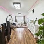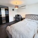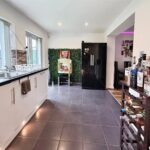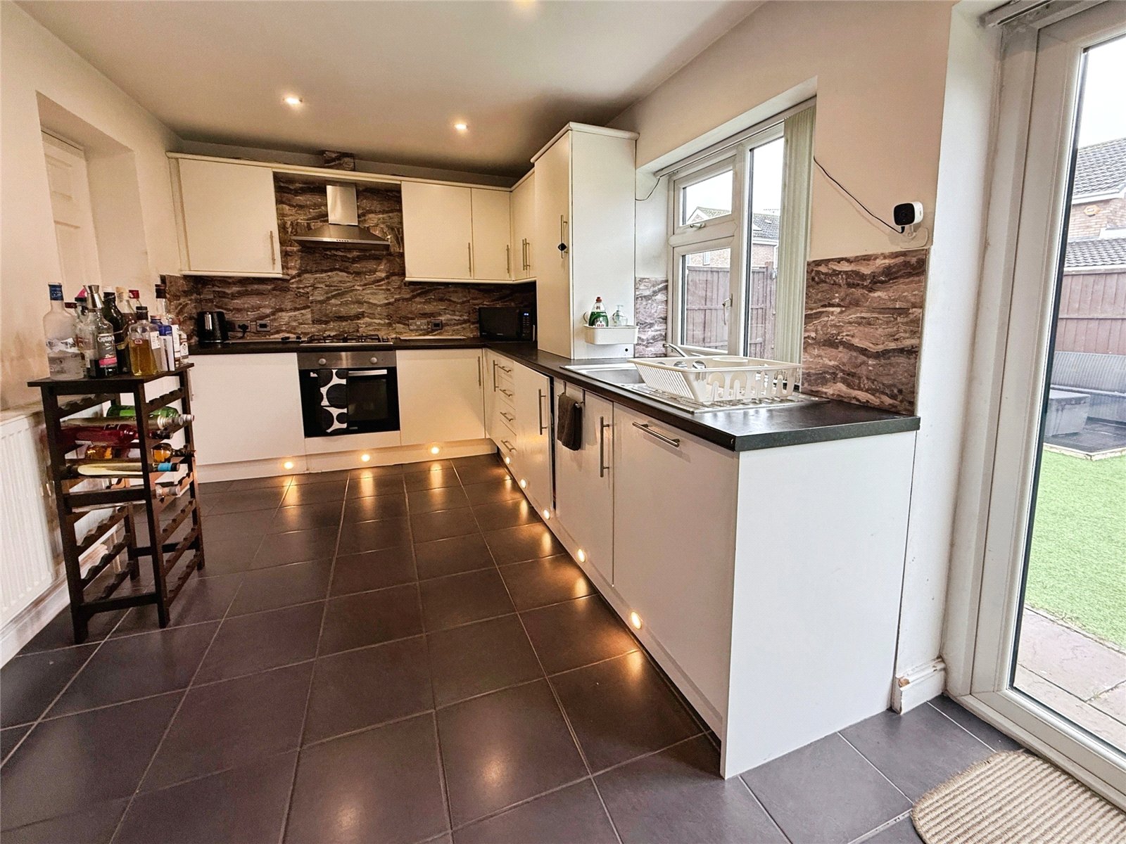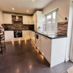 To the rear of the property is a modern fitted kitchen, finished with a range of wall and base units, contrasting work surfaces and integrated appliances including an oven and hob. The kitchen also benefits from contemporary lighting and French doors that open directly onto the rear garden, creating a seamless connection between indoor and outdoor living.