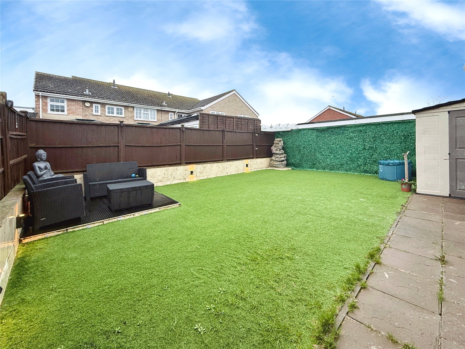 Externally, the property benefits from a low-maintenance frontage, while to the rear there is a private and enclosed garden designed for ease of upkeep. The garden features artificial lawn and patio seating areas, making it ideal for outdoor entertaining, with fenced boundaries and a garden shed providing useful storage.