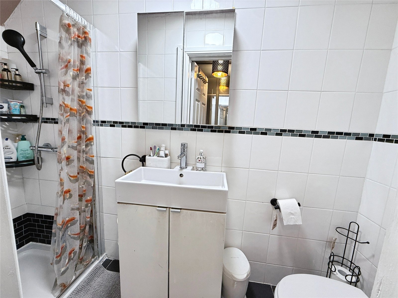 A useful ground floor shower room is fitted with a walk-in shower, wash basin and WC, finished with clean, modern tiling.
