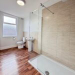 The property further benefits from a modern and well-presented bathroom, fitted with a white three-piece suite comprising a low-level WC, pedestal wash hand basin, and a walk-in shower enclosure with glazed screen. The shower area is fully tiled in neutral tones, complementing the contemporary finish, while the remainder of the room is tastefully decorated to maintain a bright and clean appearance. Additional features include wood-effect flooring and a chrome heated towel rail.