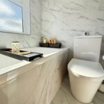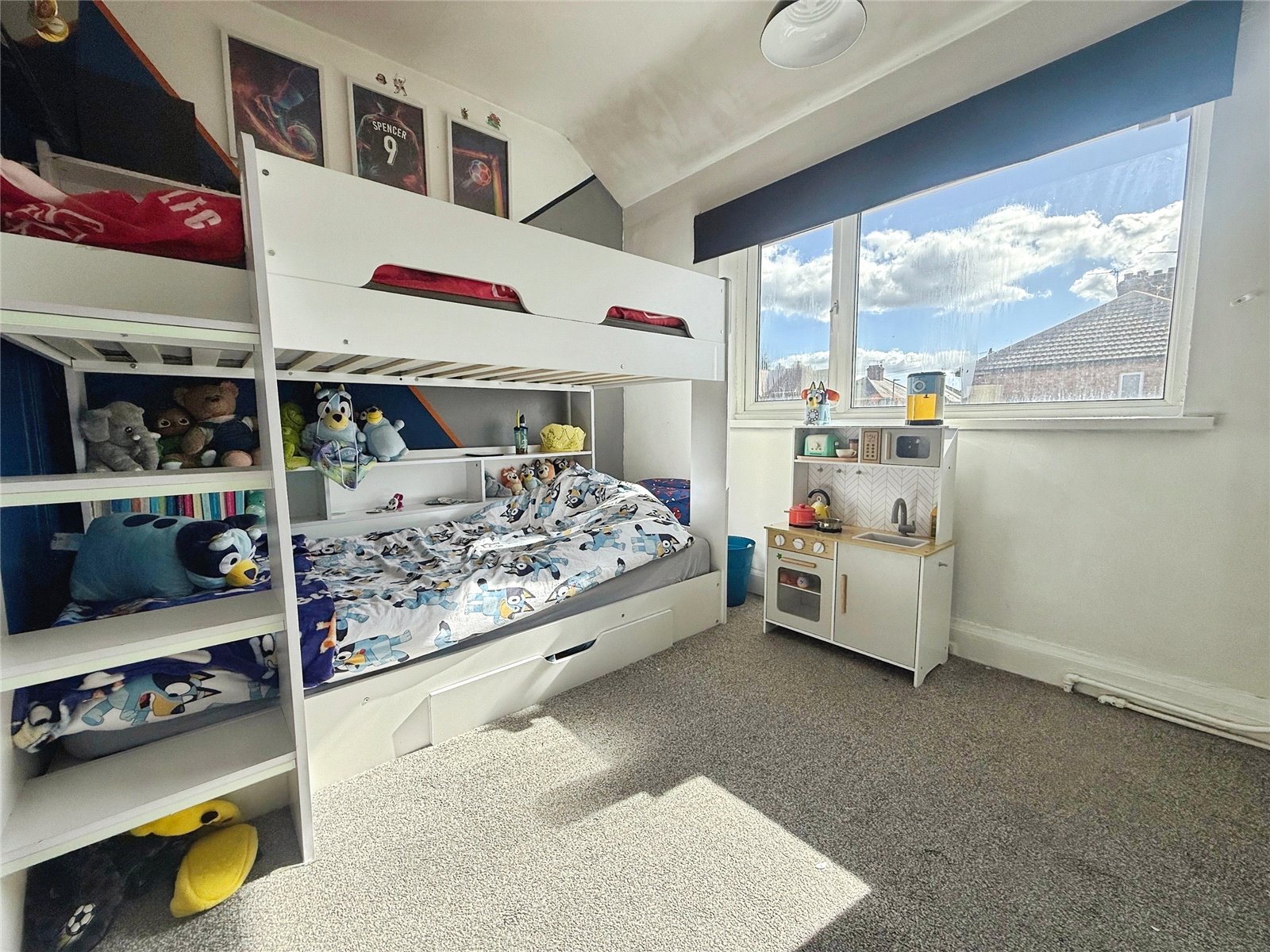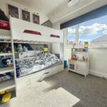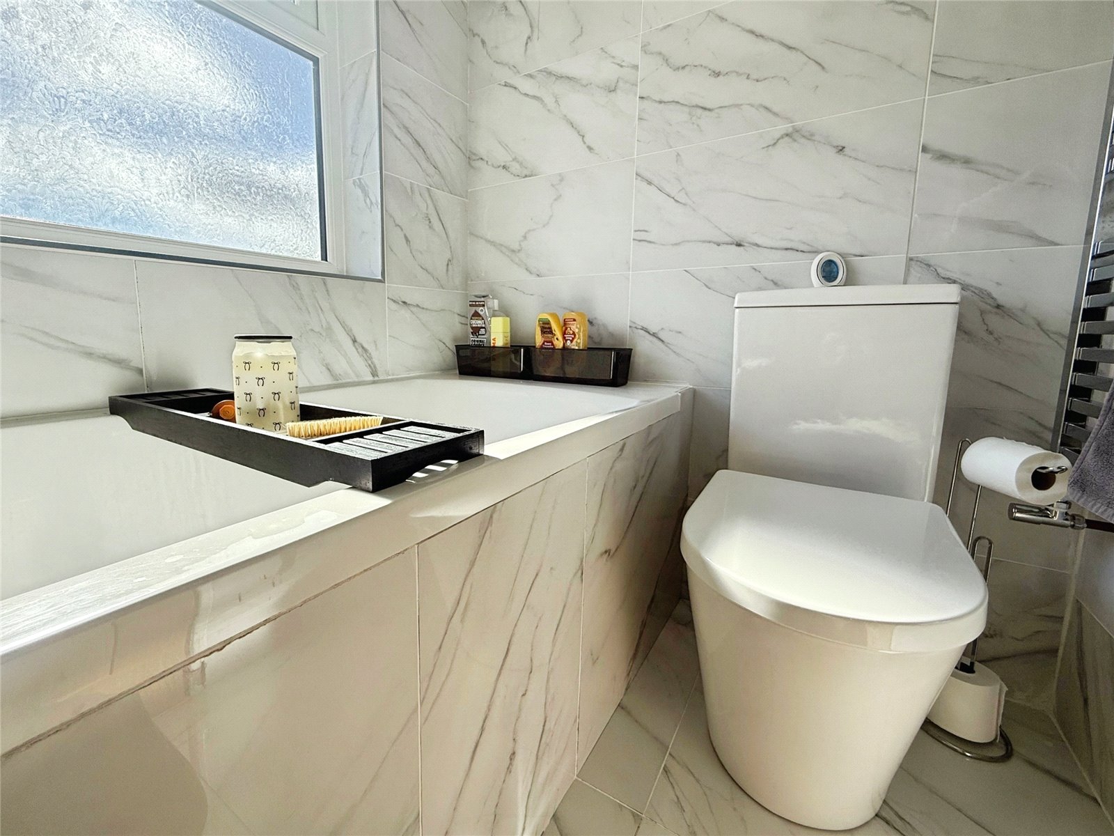 Upstairs, the property continues to impress with two generous double bedrooms and a well-proportioned single bedroom, ideal as a nursery, guest room, or home office. The bedrooms are served by a newly fitted family bathroom, featuring a bath with shower over, WC, wall-mounted basin with mixer tap, and attractive marble-effect tiling.