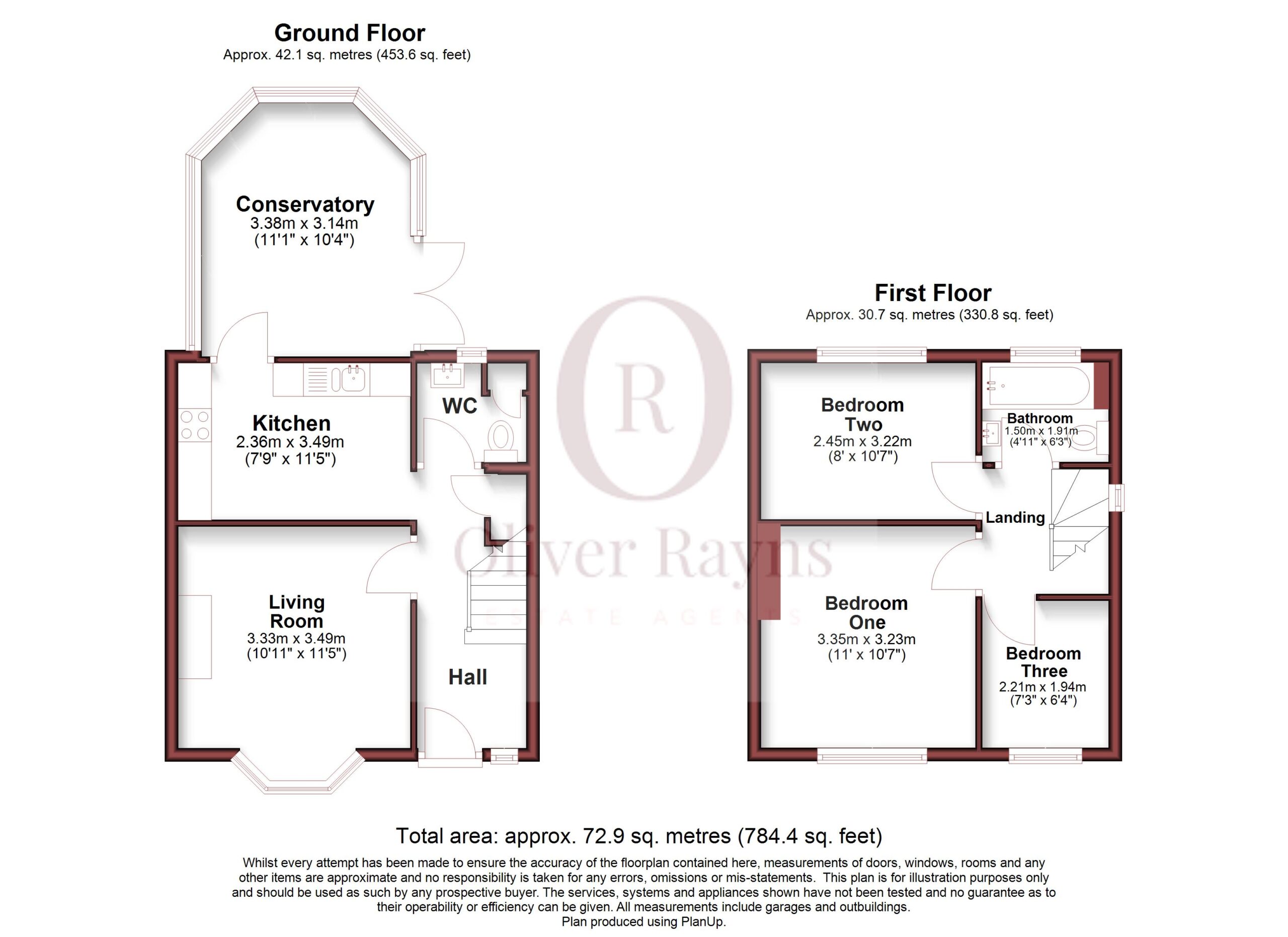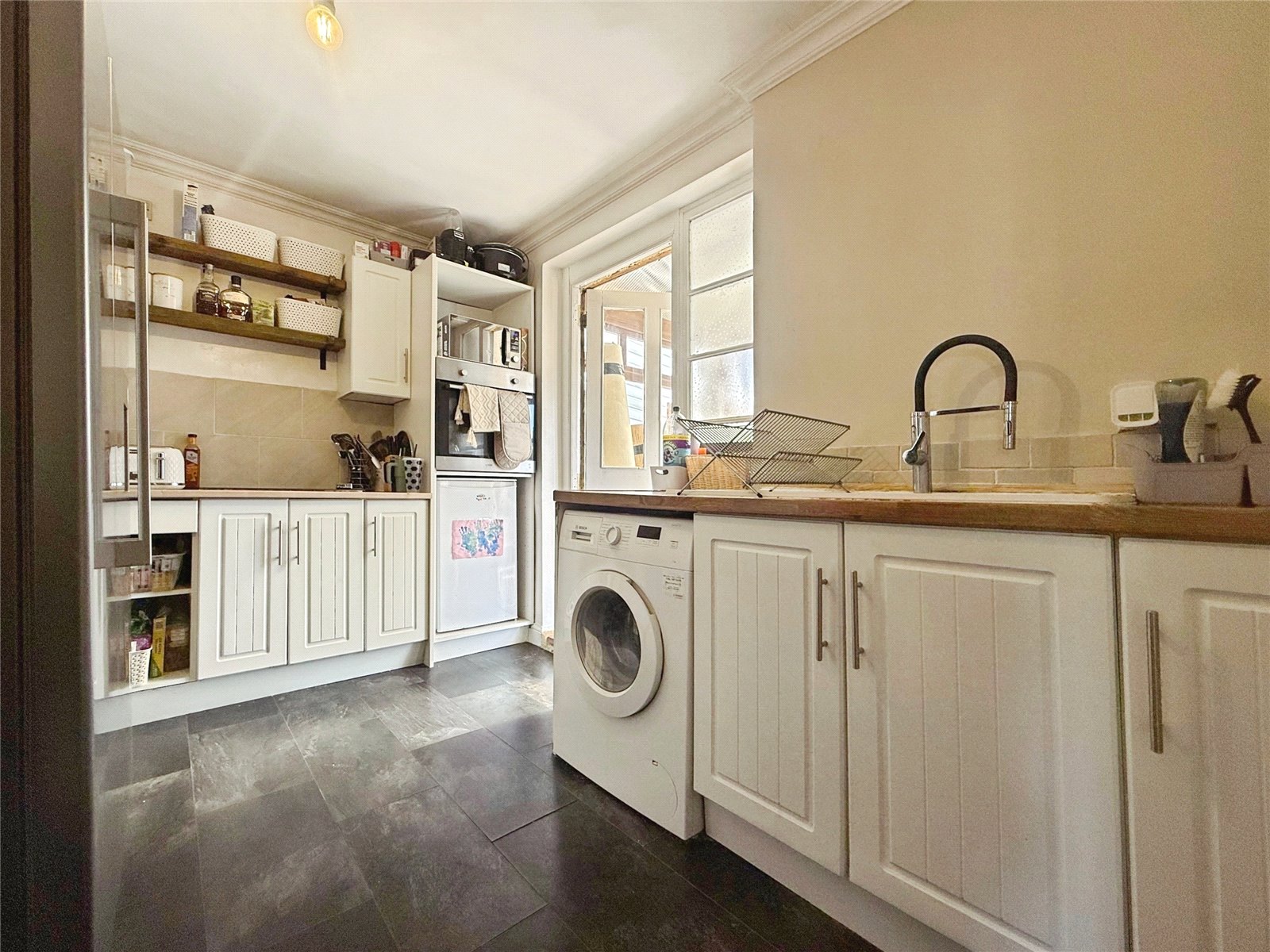 The property opens into a welcoming entrance hall leading through to a spacious living room, complete with a feature fireplace and a large bay window that floods the space with natural light. To the rear is a stylish refitted kitchen, offering a range of contemporary wall and base units with space for appliances and direct access into a versatile conservatory. This bright and airy additional reception space is perfect as a dining area, playroom, or home office, while enjoying views over the rear garden. A convenient downstairs WC completes the ground floor accommodation.