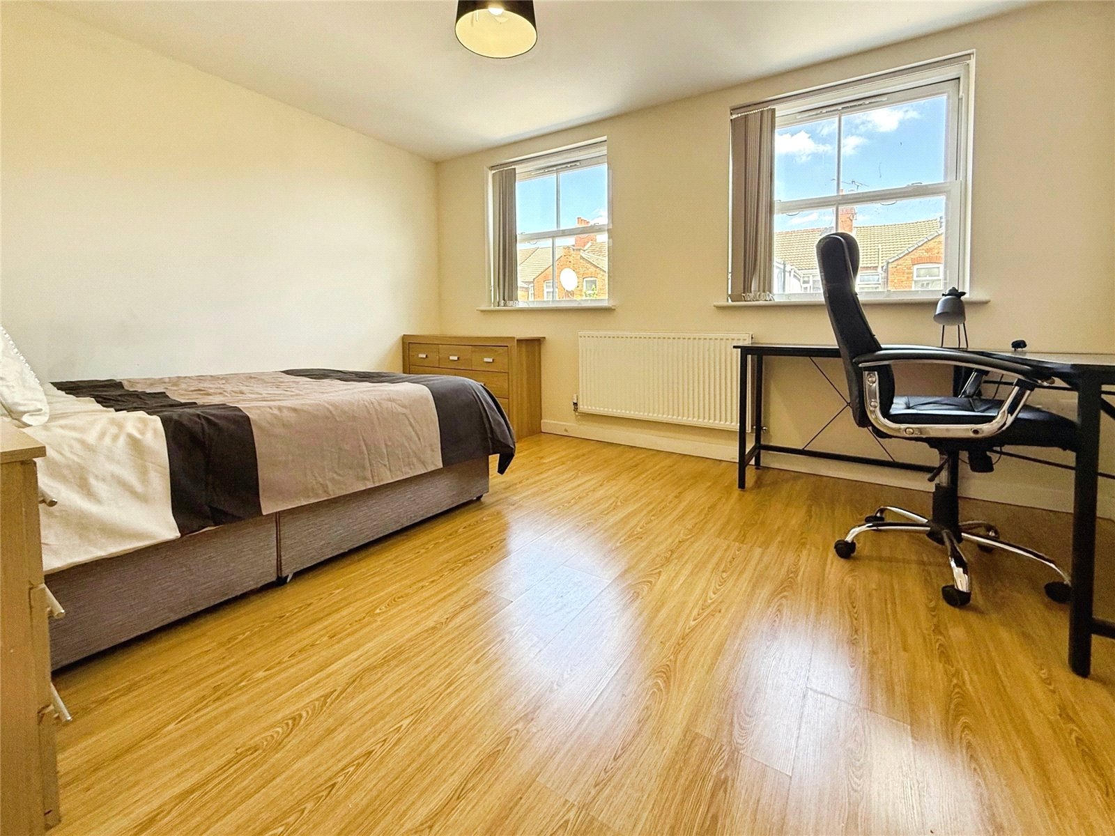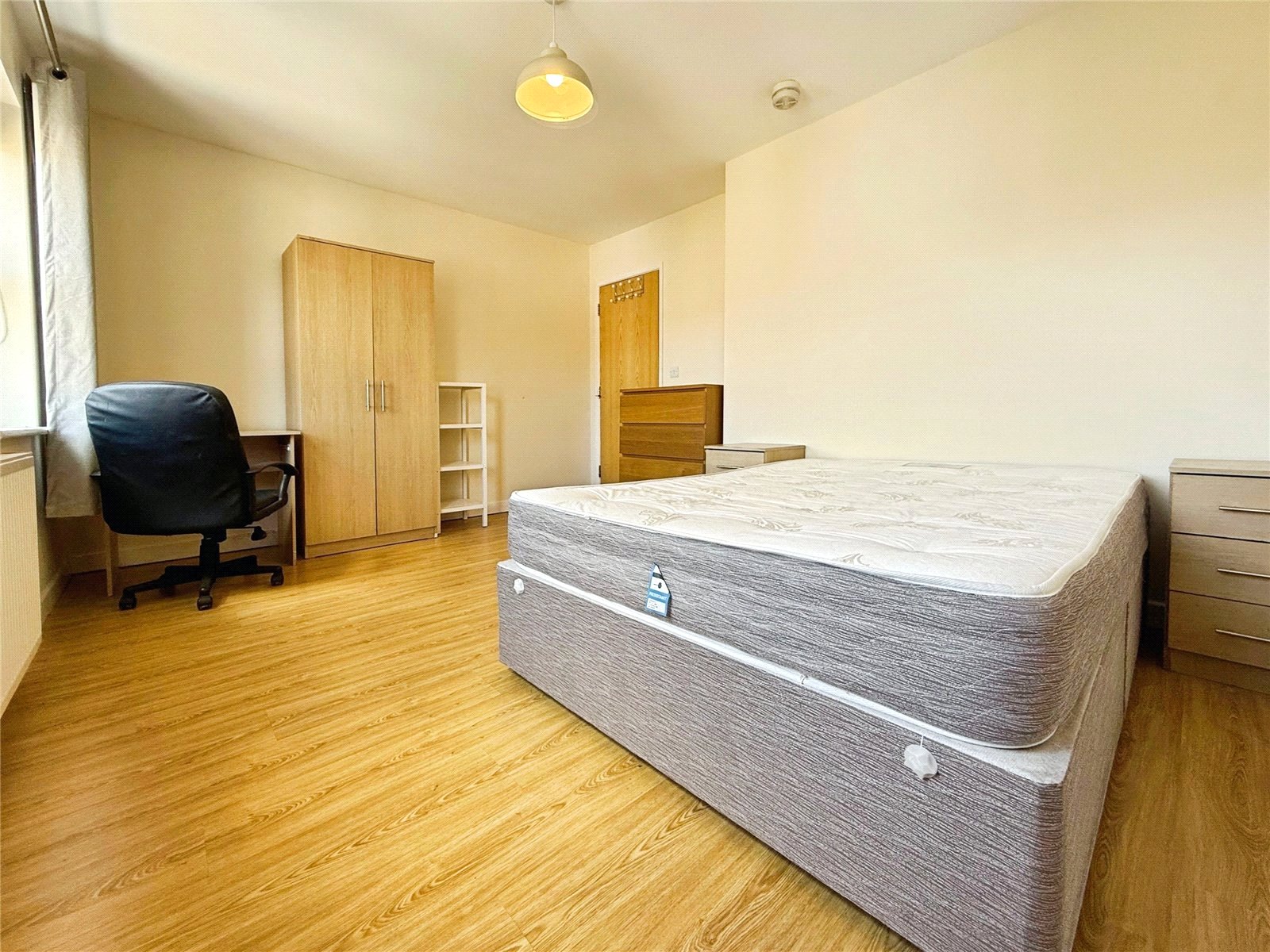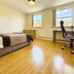 The home offers four spacious, fully furnished double bedrooms, each designed to provide a comfortable living and study space with bed, desk, chair and storage. The communal accommodation includes a large living kitchen lounge area.
