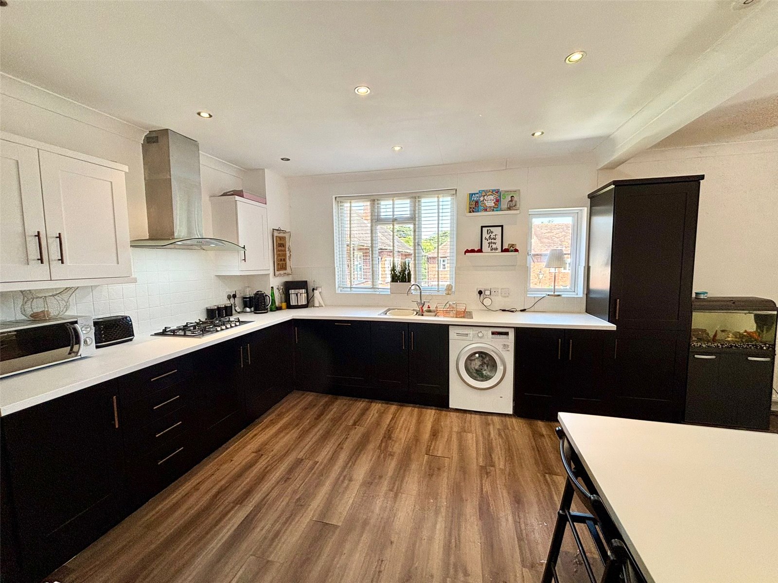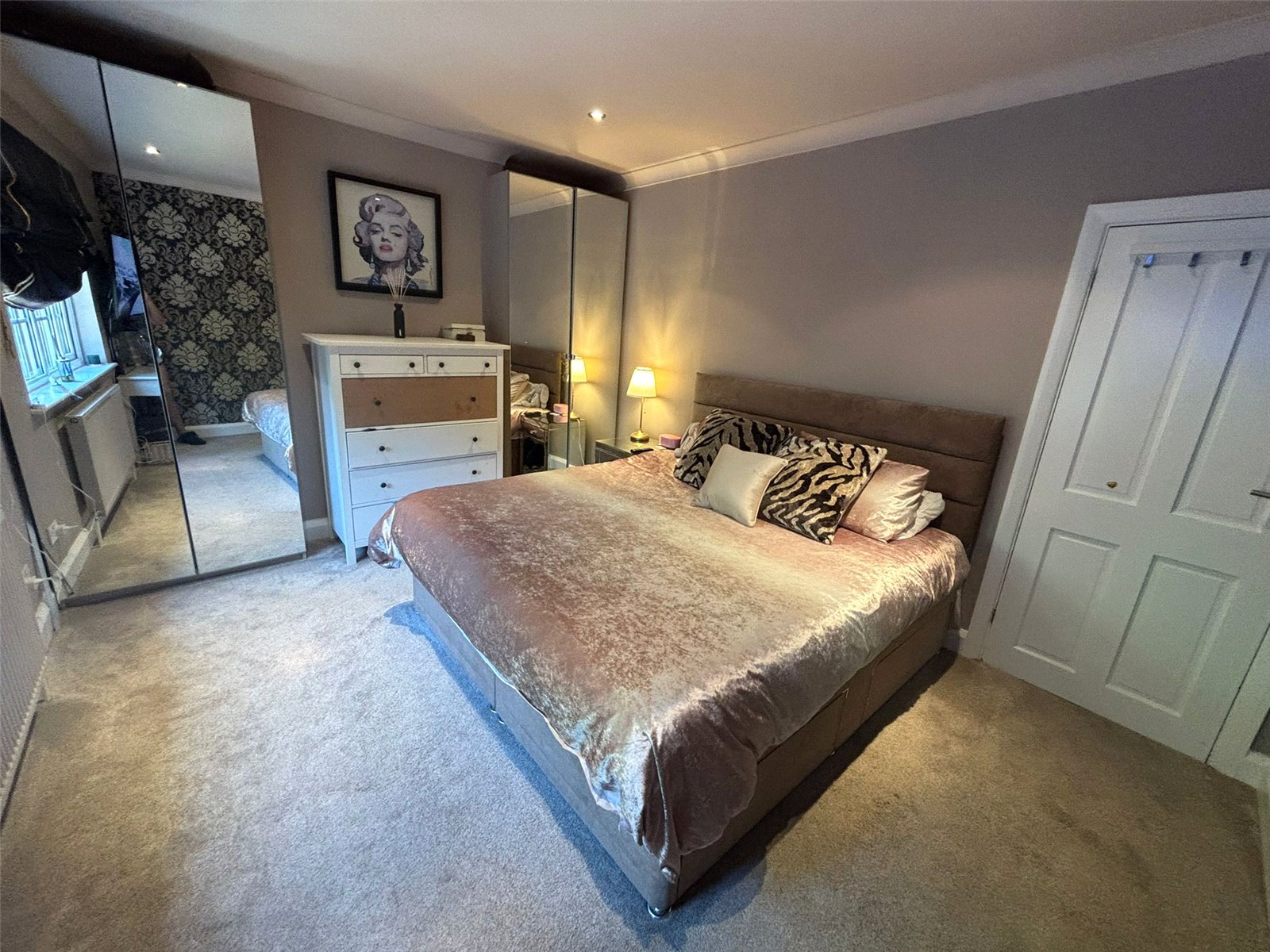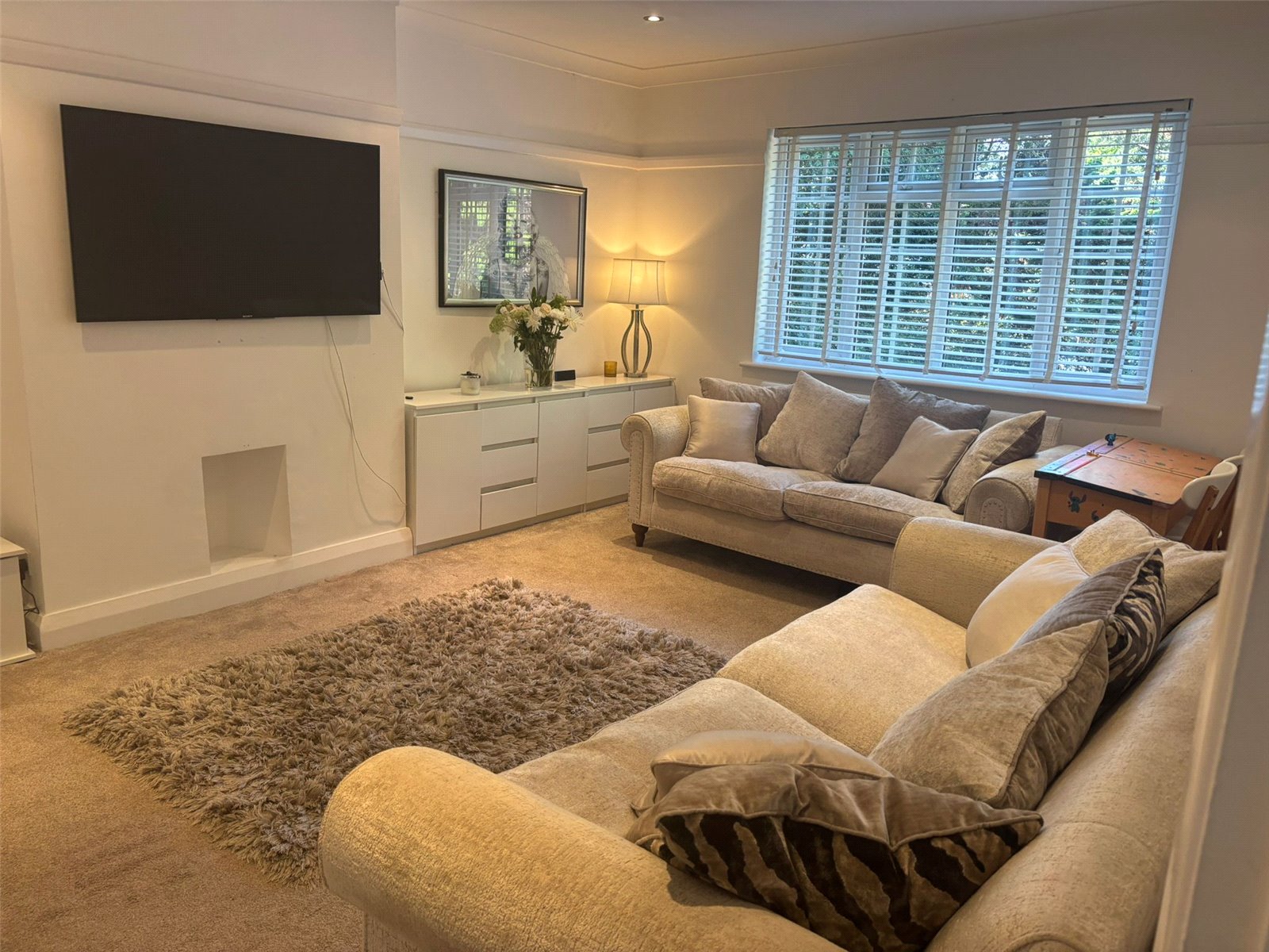 The apartment opens into a bright and inviting hallway that leads into a large, well-proportioned living room with neutral décor, plush carpeting and plenty of natural light from the large bay window, creating a warm and welcoming space to relax or entertain. The contemporary kitchen is fitted with sleek cabinetry, generous worktop space and modern appliances, with ample room for dining, making it perfect for everyday living or hosting dinner with friends and family.