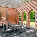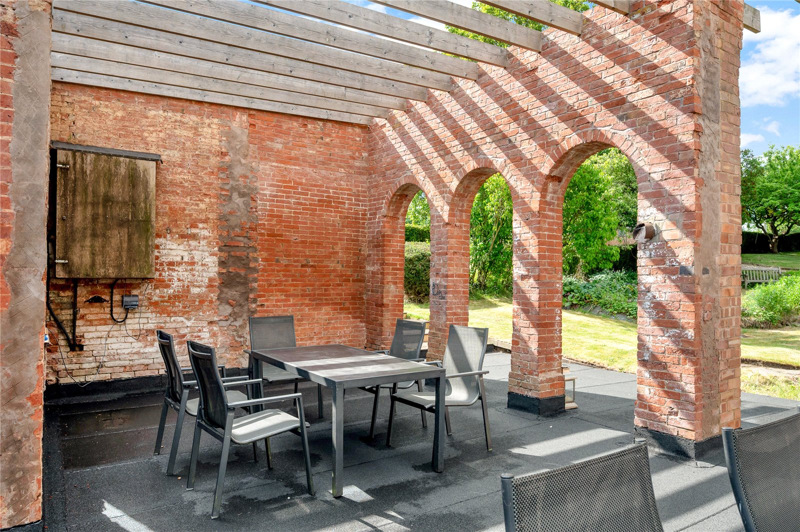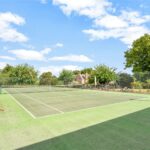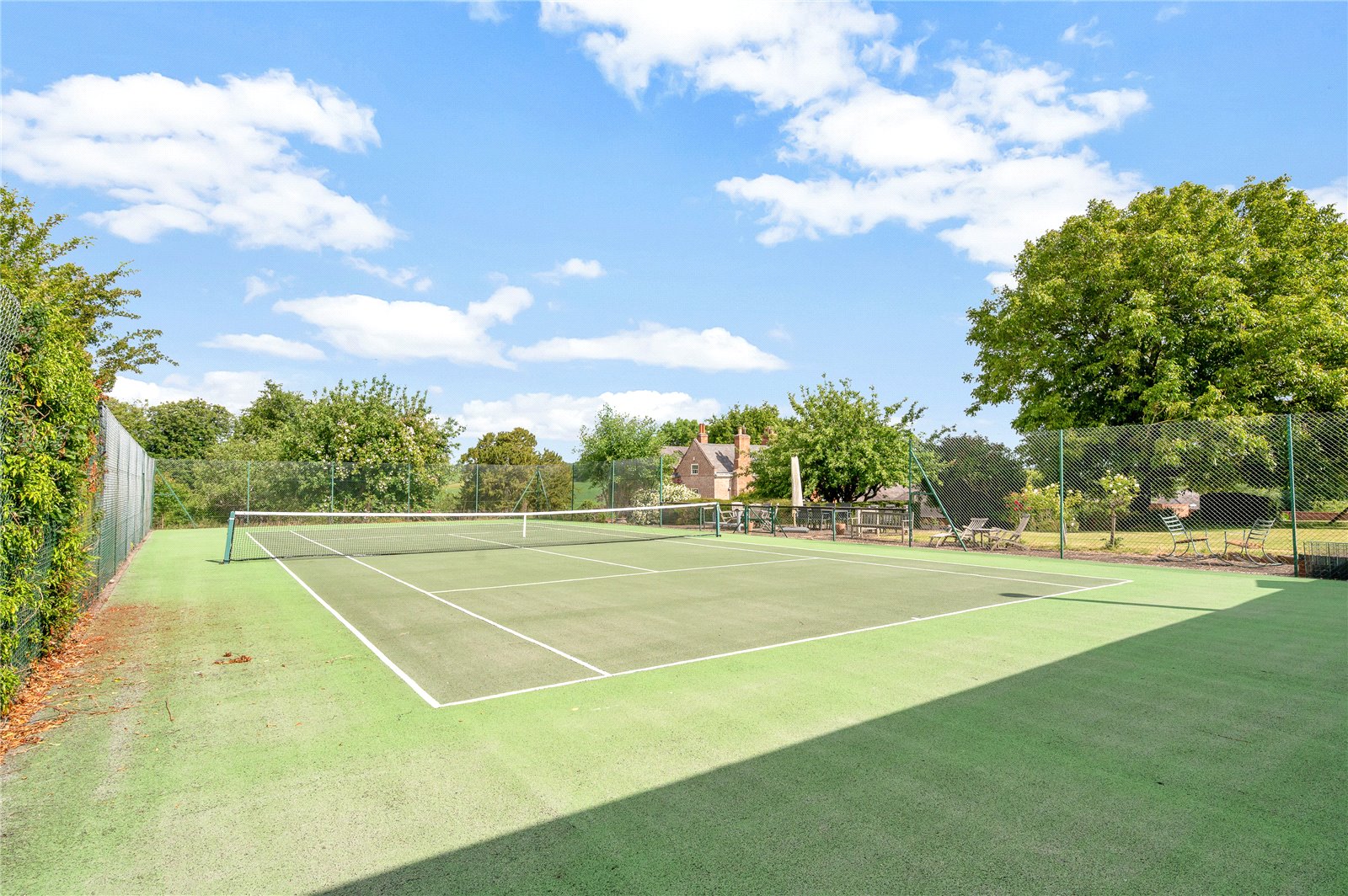 To the rear of the house, a covered loggia formed from the original brick arches of the former dairy provides a sheltered outdoor space of considerable character. Beyond lies a kitchen garden with raised beds, an all-weather tennis court positioned towards the upper part of the grounds, and a sun terrace arranged to take full advantage of the setting. A substantial range of traditional outbuildings provides useful storage and ancillary space, including two store rooms and a dedicated bar area, all fitted with power and lighting.