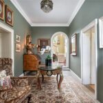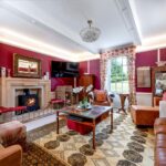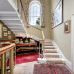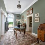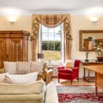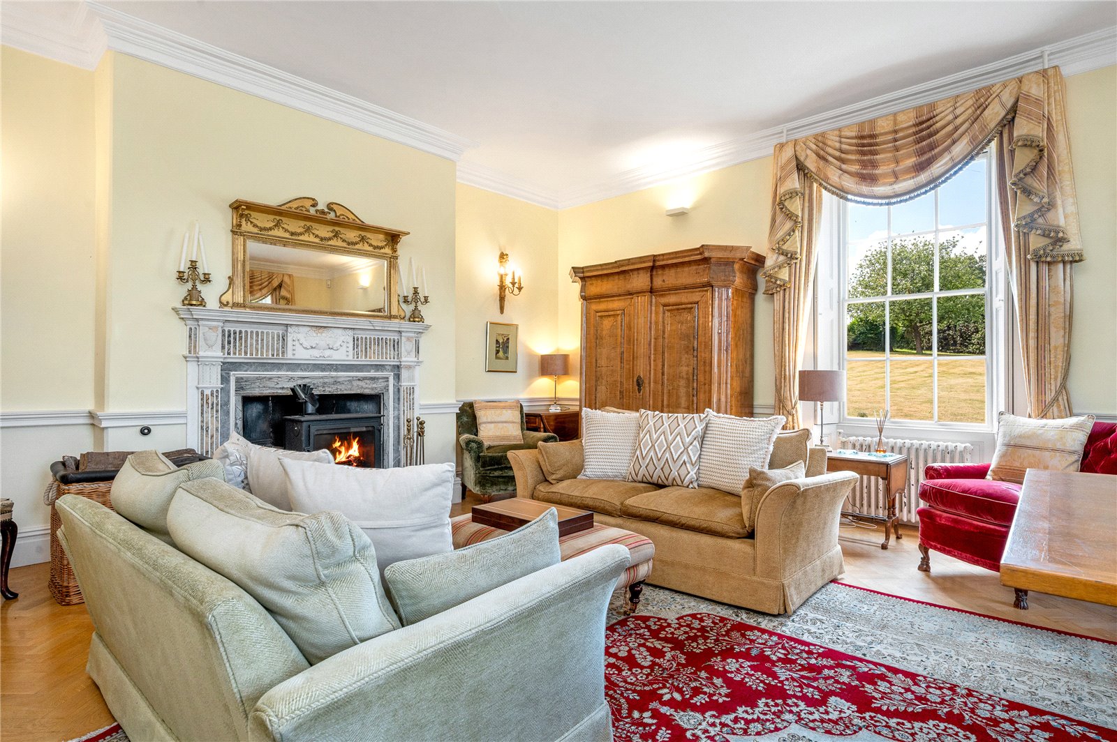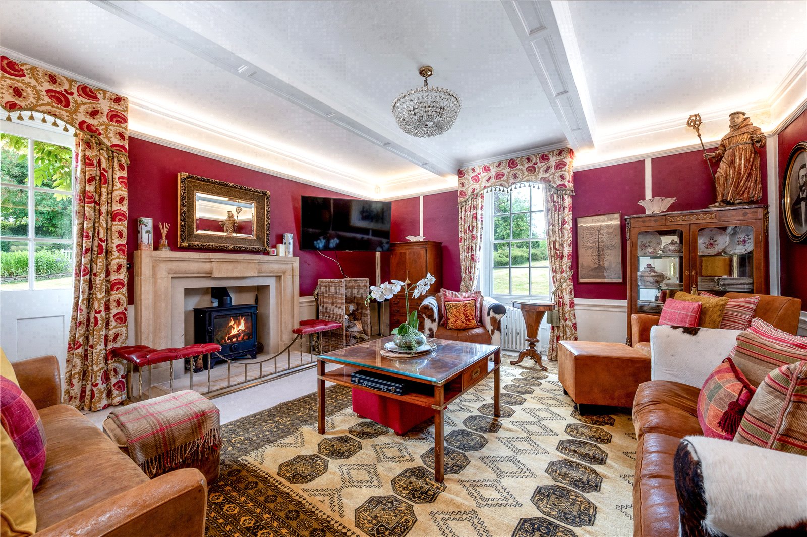 The principal rooms are arranged around a central entrance hall with flagstone flooring and a staircase rising through the house, establishing a clear and logical plan typical of its period. The drawing room is a refined, dual-aspect space with sash windows overlooking the gardens and countryside beyond, centred on a fireplace with marble surround. The adjoining dining room provides an elegant setting for formal entertaining, while a separate sitting room offers a more intimate reception space. All principal reception rooms enjoy strong visual connections with the surrounding grounds.