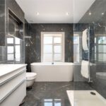 The bedroom layout is arranged across the first and second floors. On the first floor there are two principal suites, each with its own dressing area and en-suite — one positioned to the front of the house and the other to the rear. Two further bedrooms are also located on this level, creating an excellent balance between generous principal accommodation and additional family/guest space.