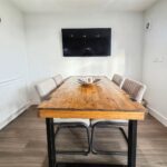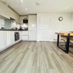 Stepping inside, you’re welcomed into a bright entrance hall leading through to a spacious living room featuring a bay window that fills the space with natural light. The layout flows seamlessly through to the contemporary kitchen and dining area, where sleek gloss cabinetry, integrated appliances, and ample worktop space make it ideal for both family life and entertaining. French doors open directly onto the rear garden, extending the living space outdoors. There’s also a convenient ground floor WC.