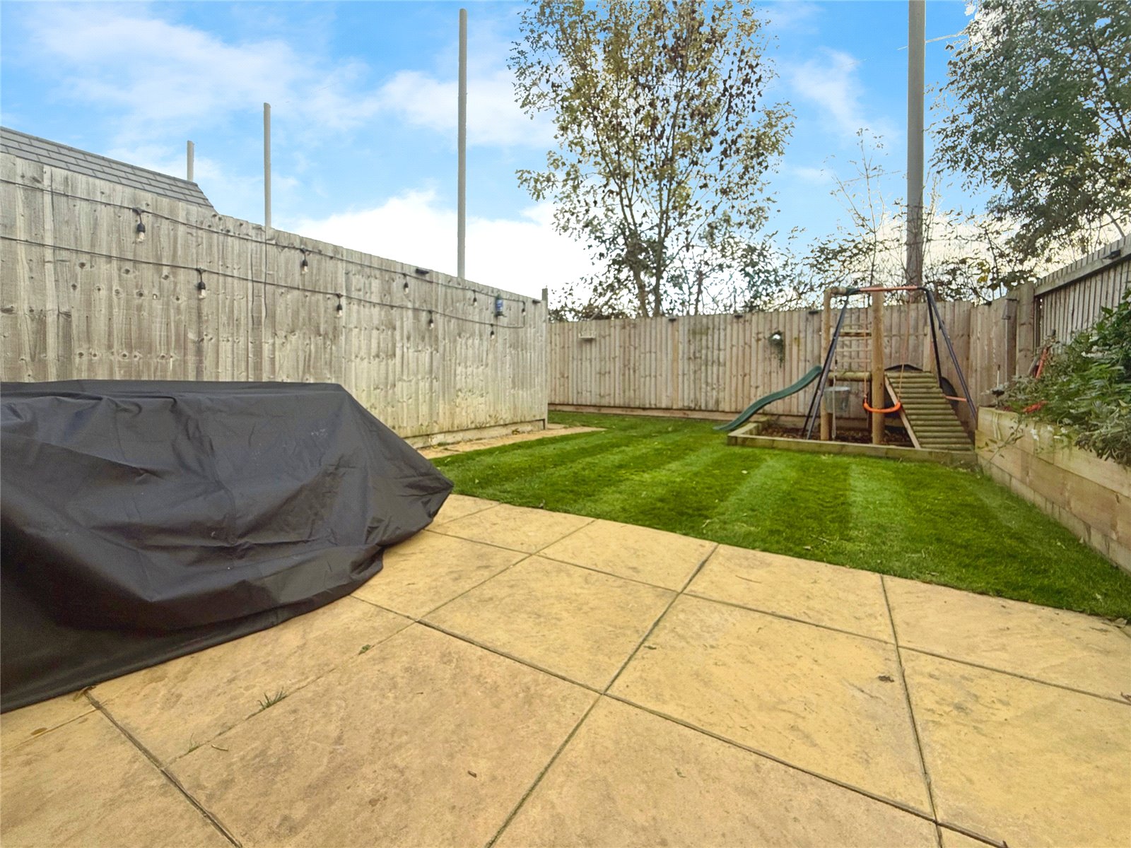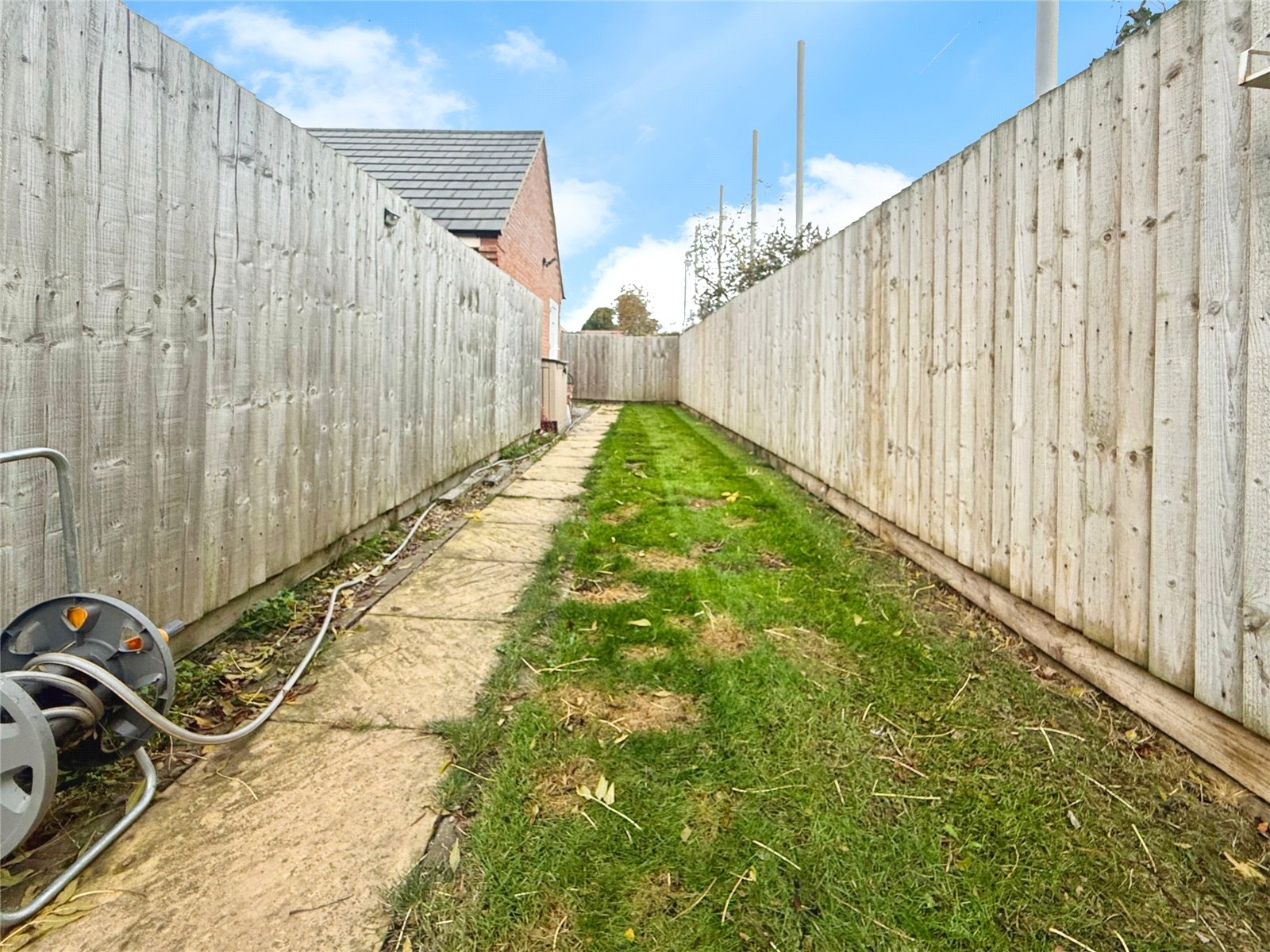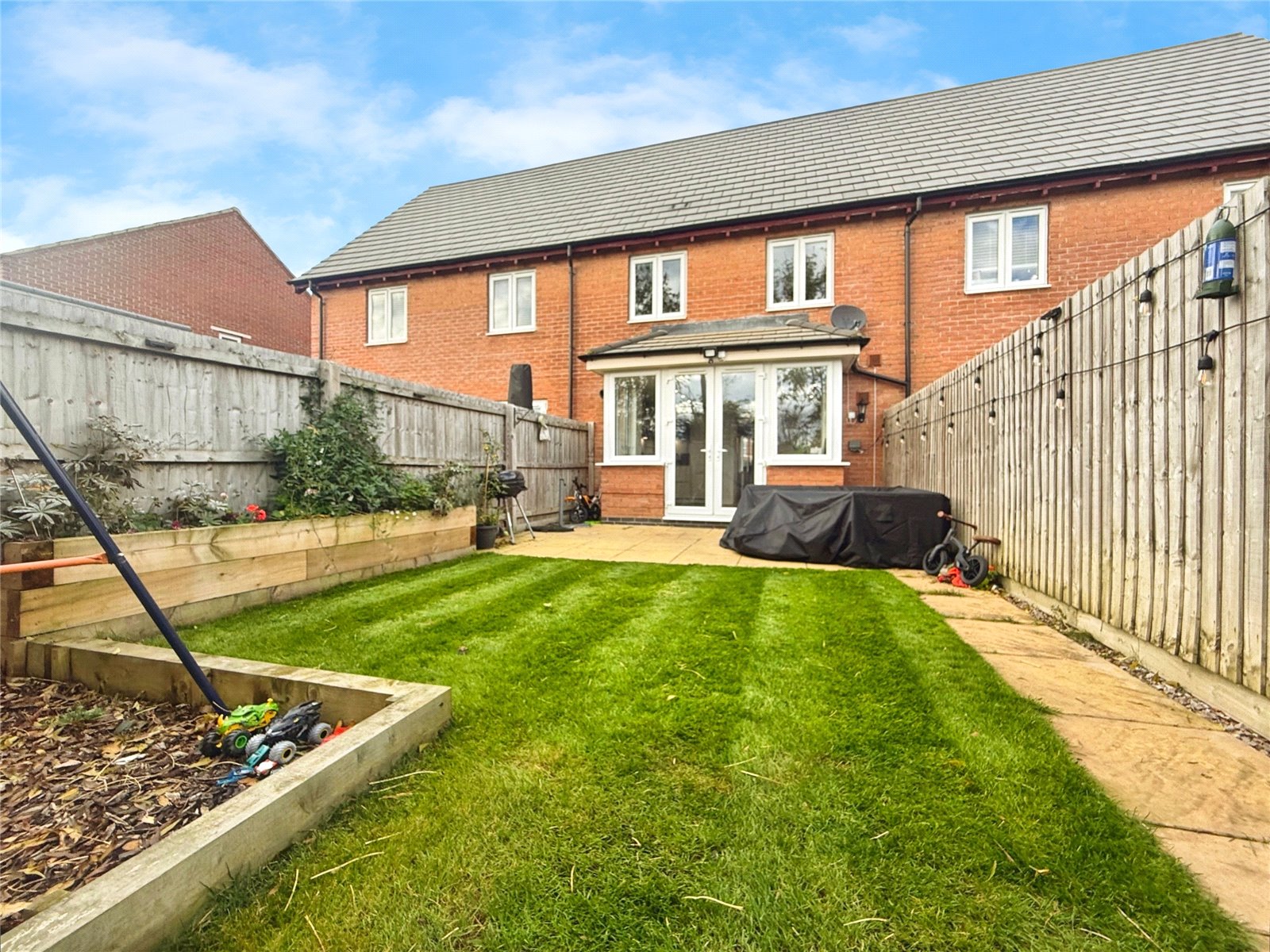 Outside, the garden is a real highlight — beautifully maintained, mainly laid to lawn, with a paved patio and raised planting beds, creating a perfect setting for outdoor dining and relaxation. The home also benefits from an enclosed side area offering additional space for storage or play, and allocated parking is available nearby.