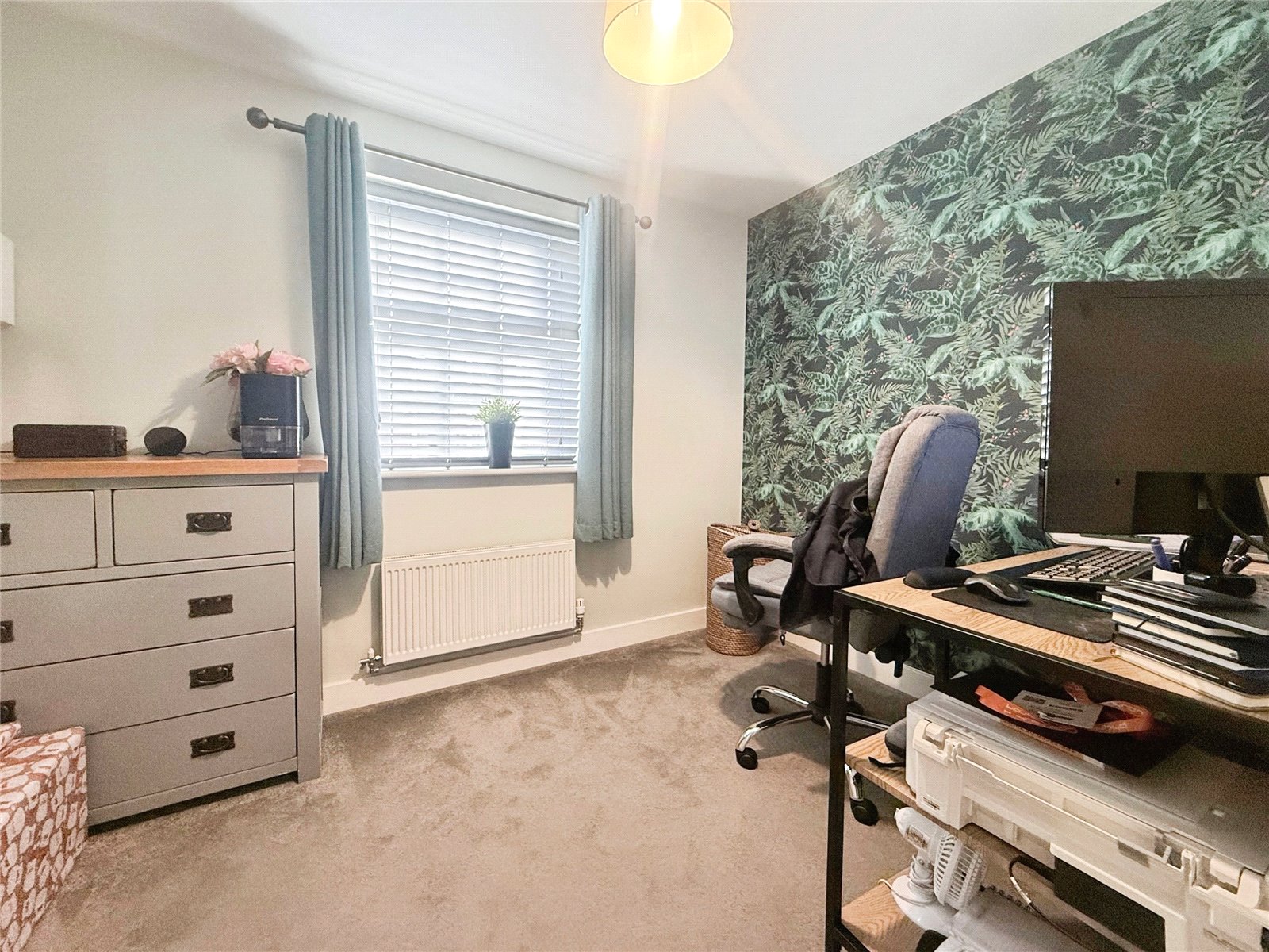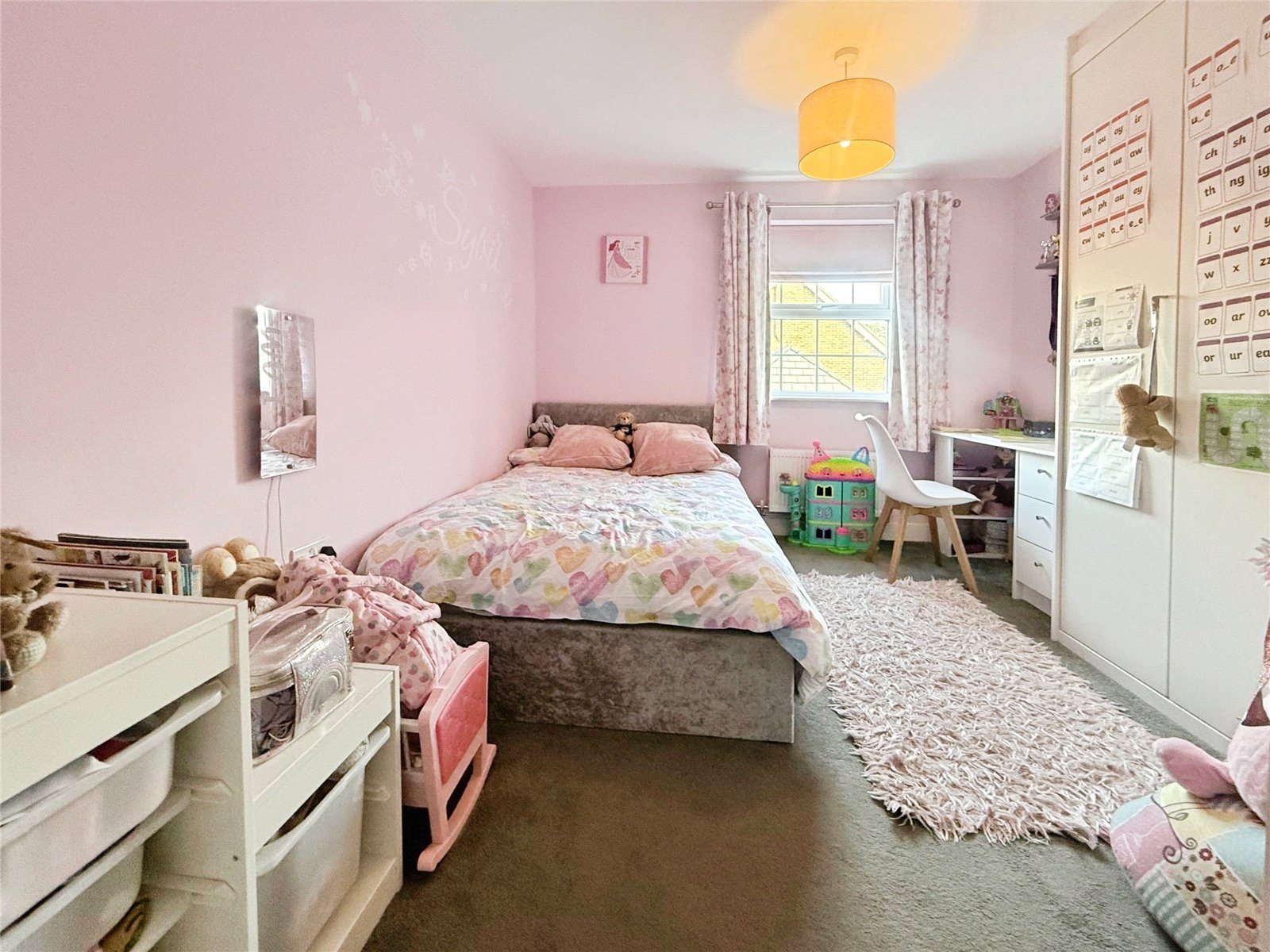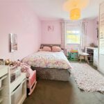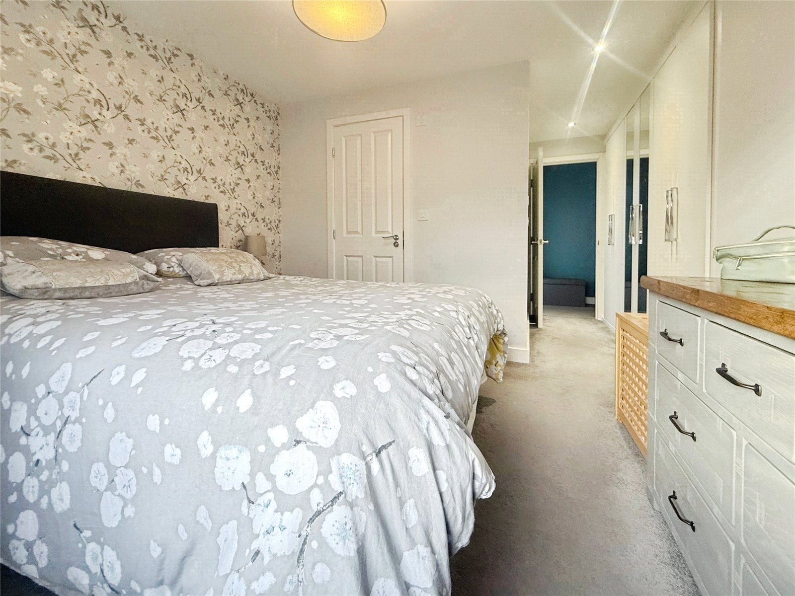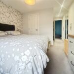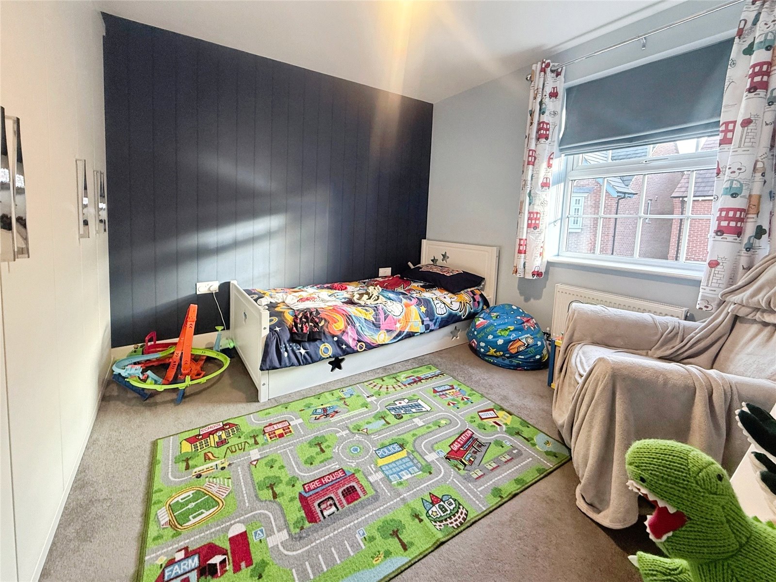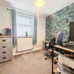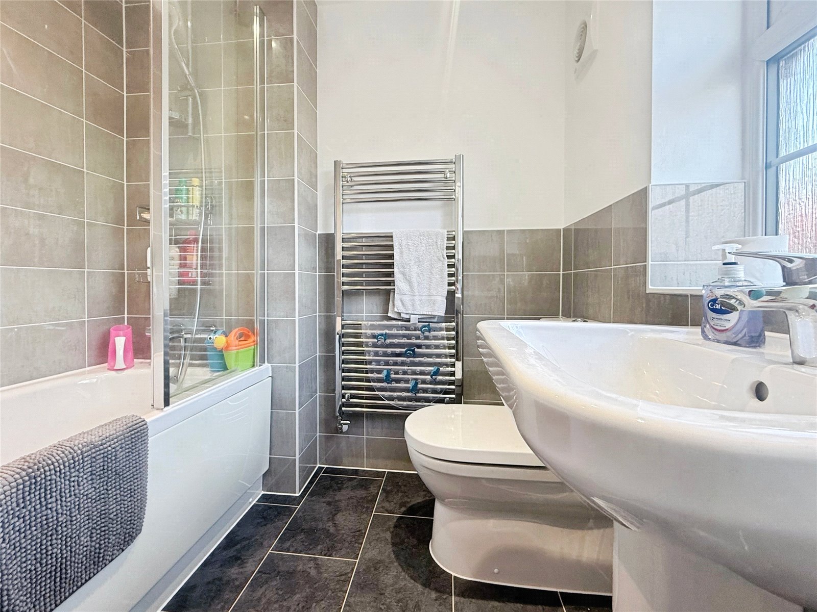 Upstairs, the property continues to impress with three well-proportioned bedrooms. The principal bedroom is generously sized, with room for wardrobes and additional furniture. The second bedroom is bright and spacious, ideal for children or guests, while the third bedroom is currently used as a child’s room but would also serve perfectly as a home office. The family bathroom is modern and immaculate, featuring a full three-piece suite with shower-over-bath, contemporary tiling and chrome fittings.