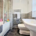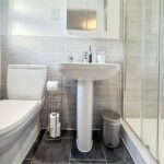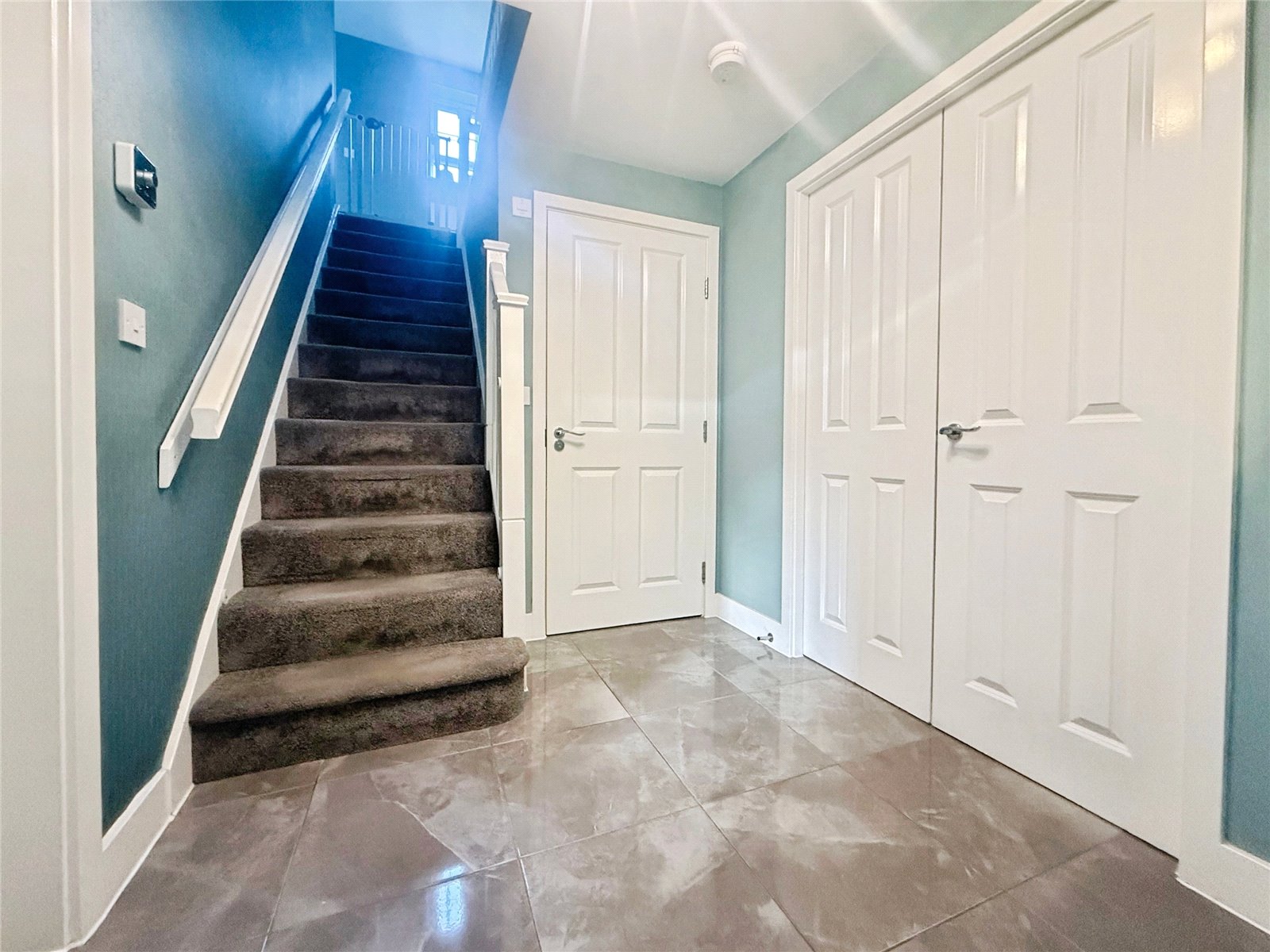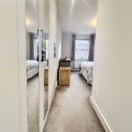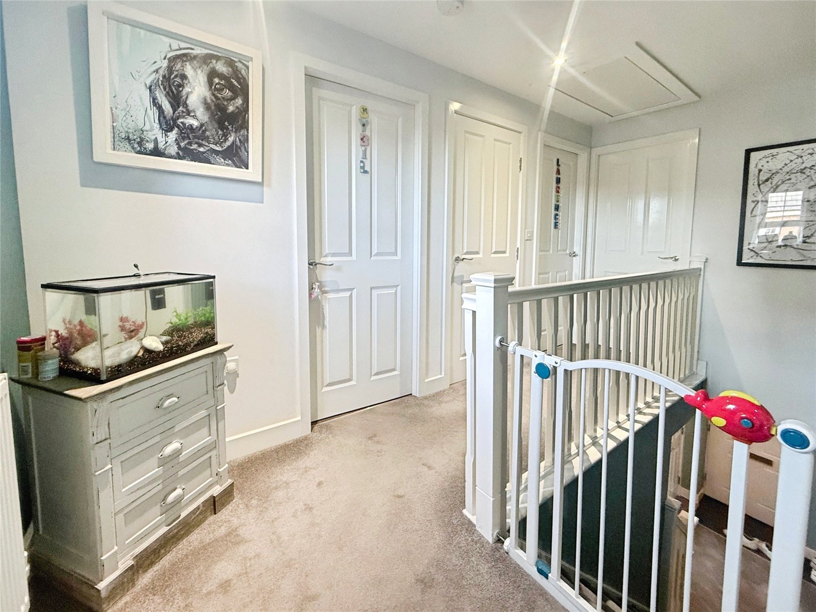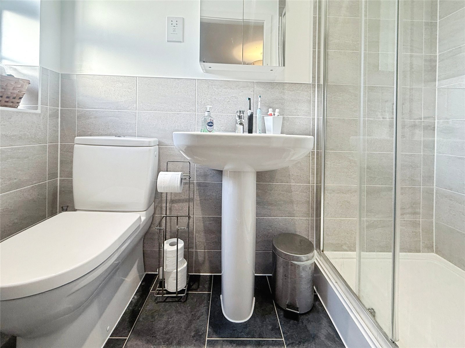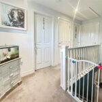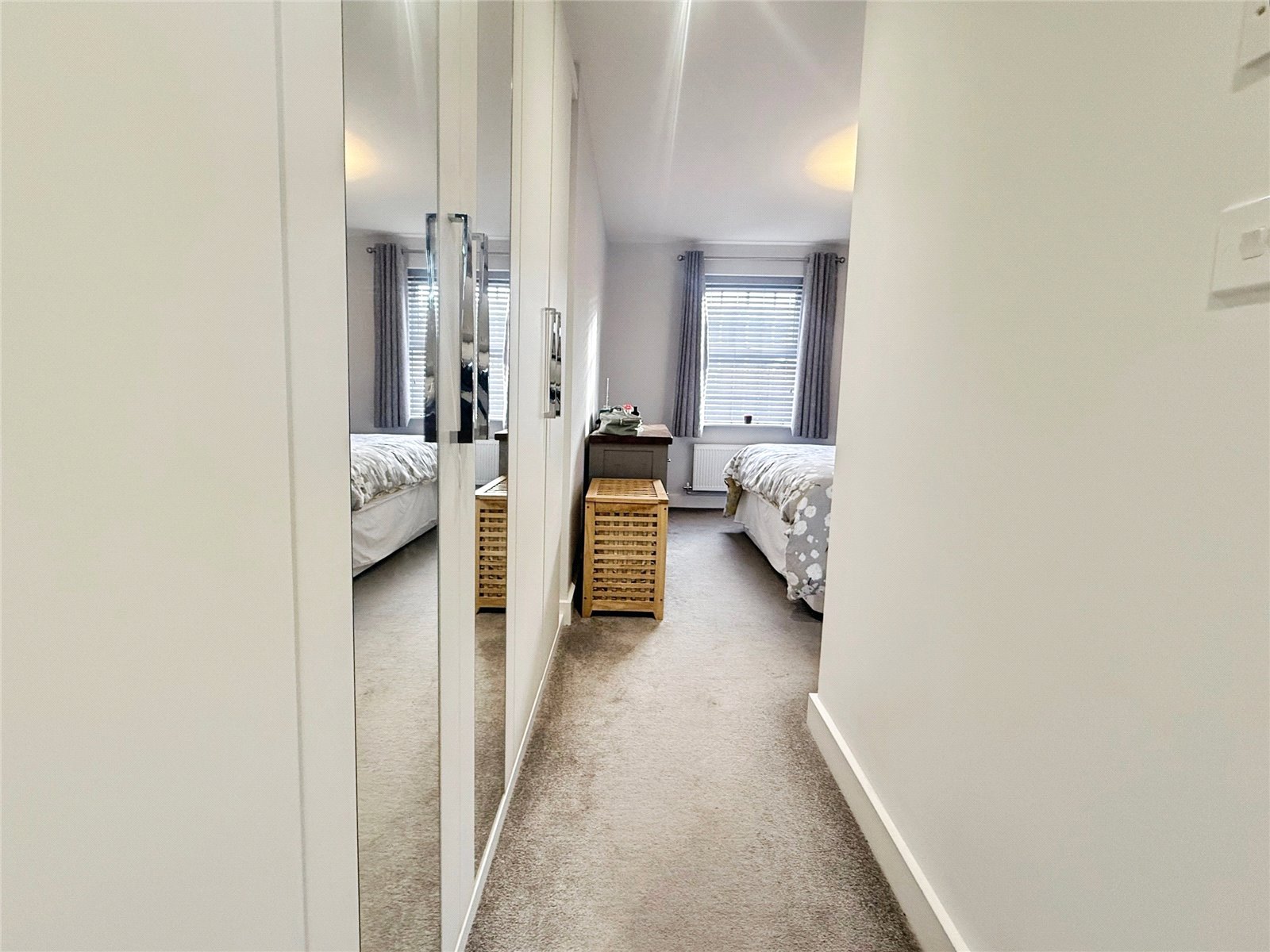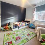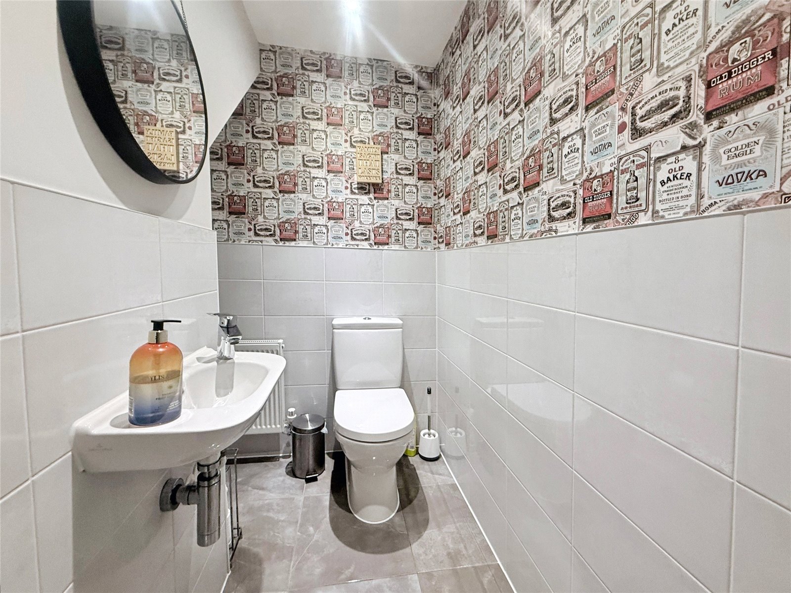 Upstairs, the property continues to impress with three well-proportioned bedrooms. The principal bedroom is generously sized, with room for wardrobes and additional furniture. The second bedroom is bright and spacious, ideal for children or guests, while the third bedroom is currently used as a child’s room but would also serve perfectly as a home office. The family bathroom is modern and immaculate, featuring a full three-piece suite with shower-over-bath, contemporary tiling and chrome fittings.