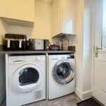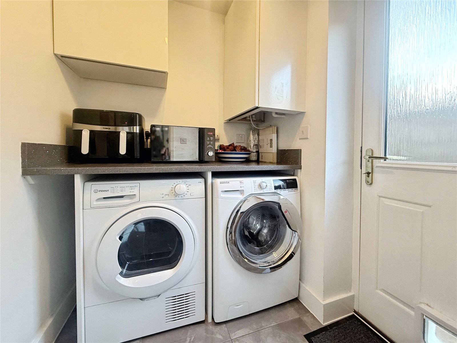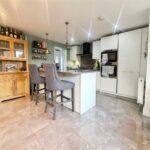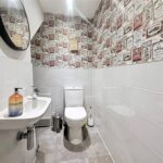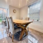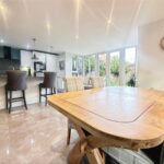 The ground floor continues with a stylish WC featuring contemporary tiling and playful wallpaper, before opening into the heart of the home — a stunning open-plan kitchen, dining and family space. This area has been designed with both functionality and sociability in mind. The kitchen includes sleek gloss cabinetry, integrated appliances, a central island with breakfast bar seating and plenty of worktop space for cooking and entertaining. The dining area sits beautifully alongside, with views out to the garden and French doors that flood the room with light.