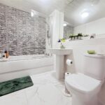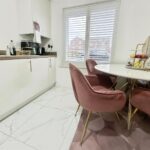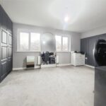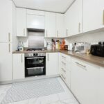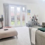 Upon entering, a welcoming hallway leads past a convenient ground-floor cloakroom to a generous living room. This relaxing space features neutral décor and French doors that open directly onto the garden, filling the room with natural light and creating a seamless connection to the outdoors. At the front of the house, the stylish kitchen diner is fitted with sleek white cabinetry, integrated appliances, a gas hob and double oven, complemented by wooden worktops and space for dining.