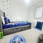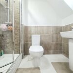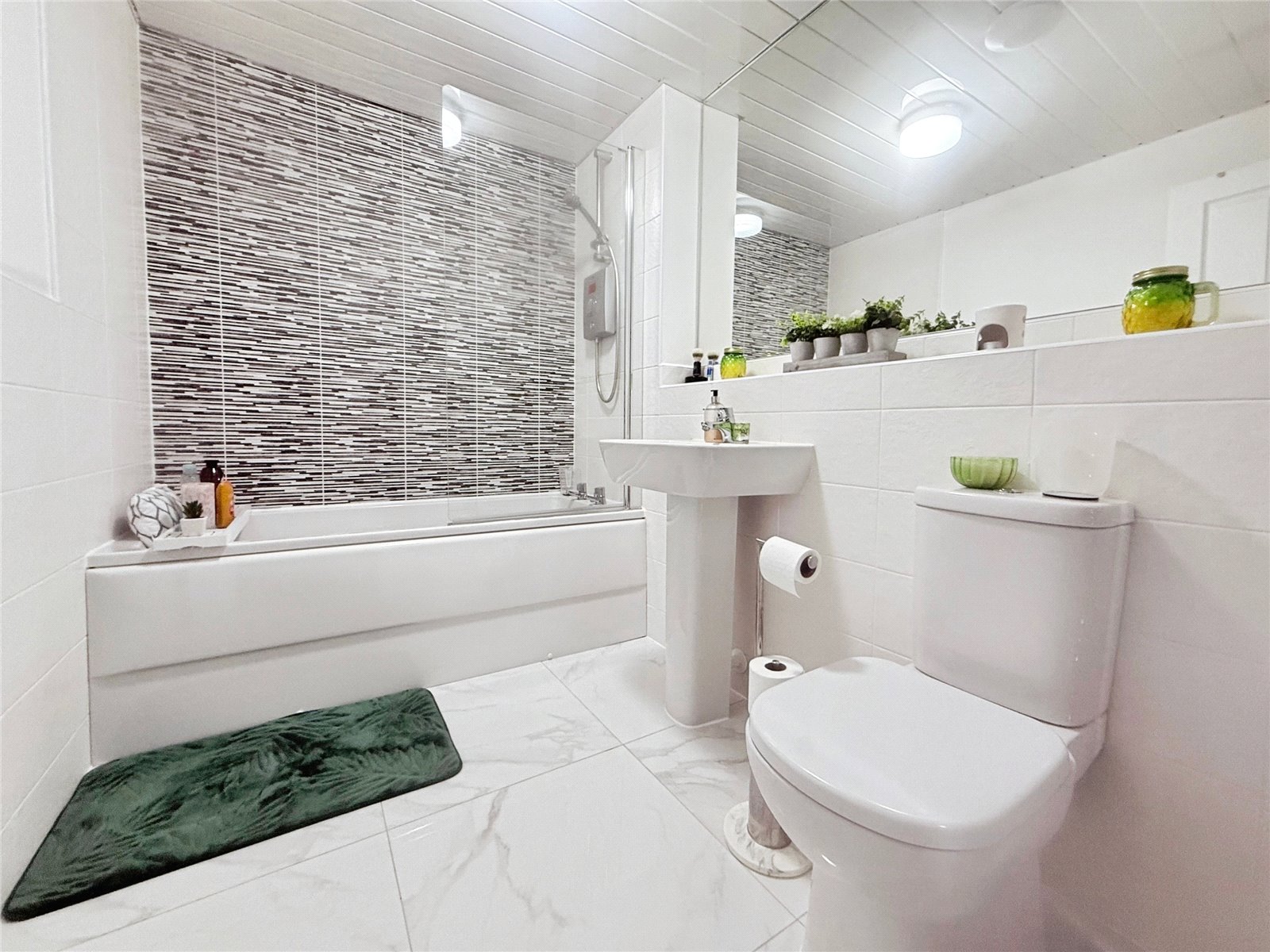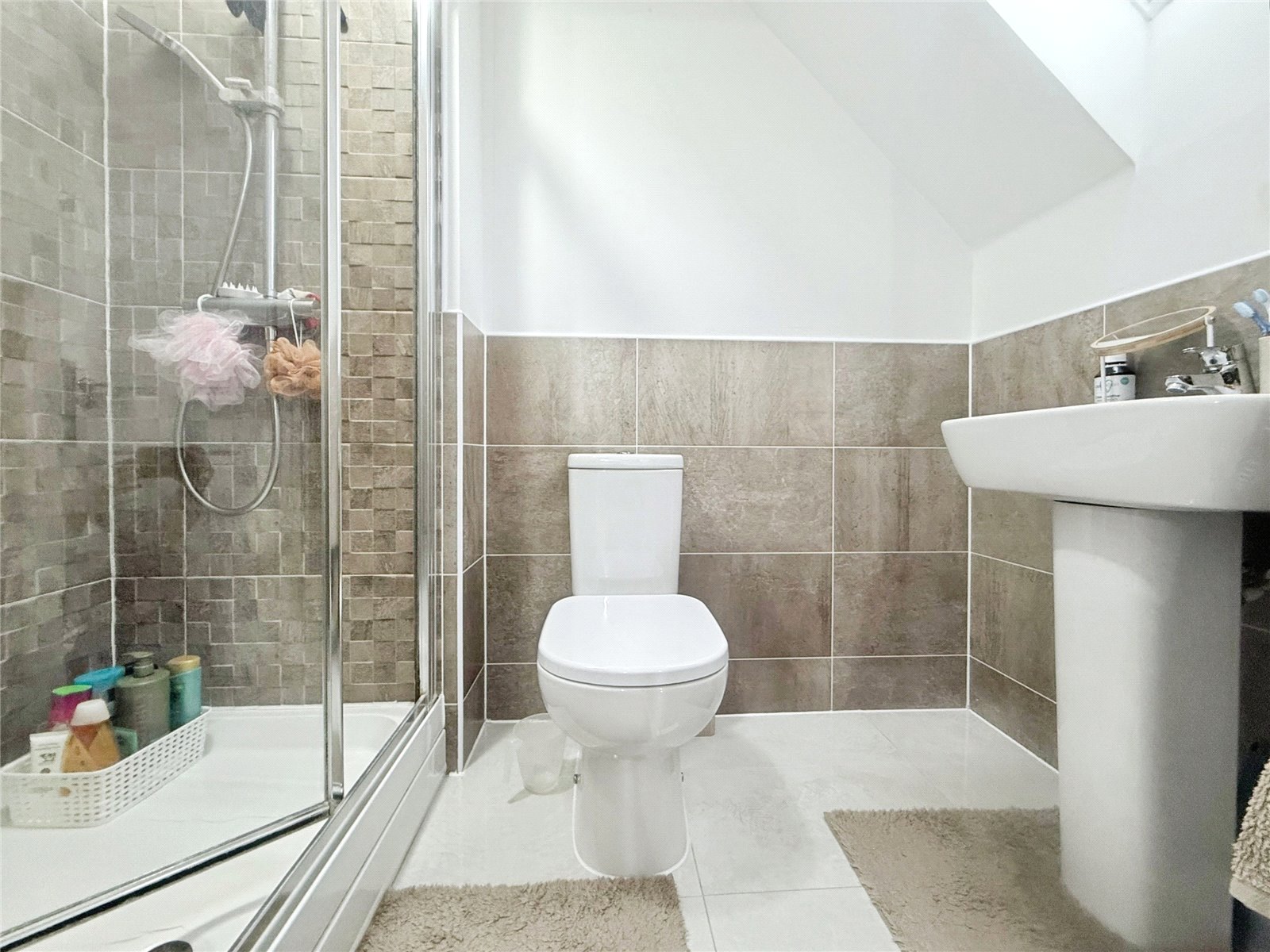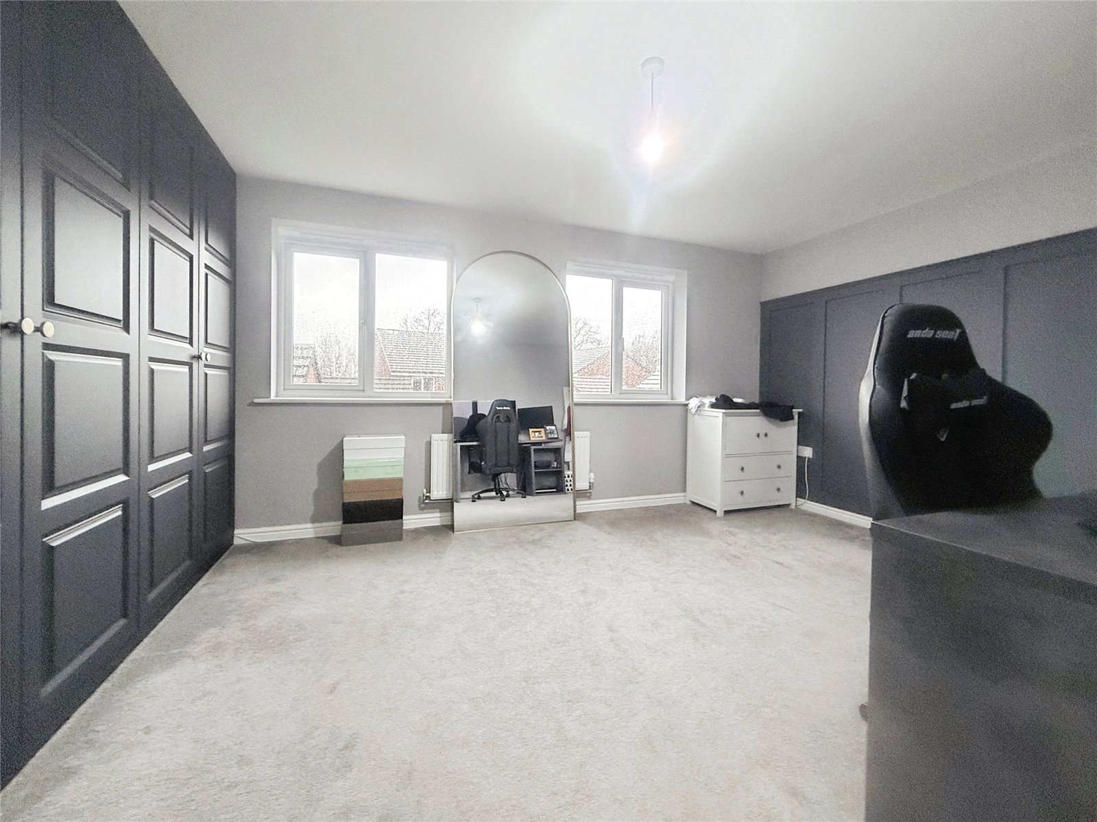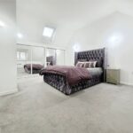 The first floor offers two good-sized bedrooms, with the larger currently used as a bedroom/home office and featuring ample fitted wardrobes. A contemporary family bathroom serves this level, incorporating a white three-piece suite with an over-bath shower, modern tiling and a mirrored wall to enhance light and space. Occupying the entire top floor, the principal bedroom is an impressive retreat with built-in mirrored wardrobes running along one wall, dormer and skylight windows, and a private en-suite shower room.