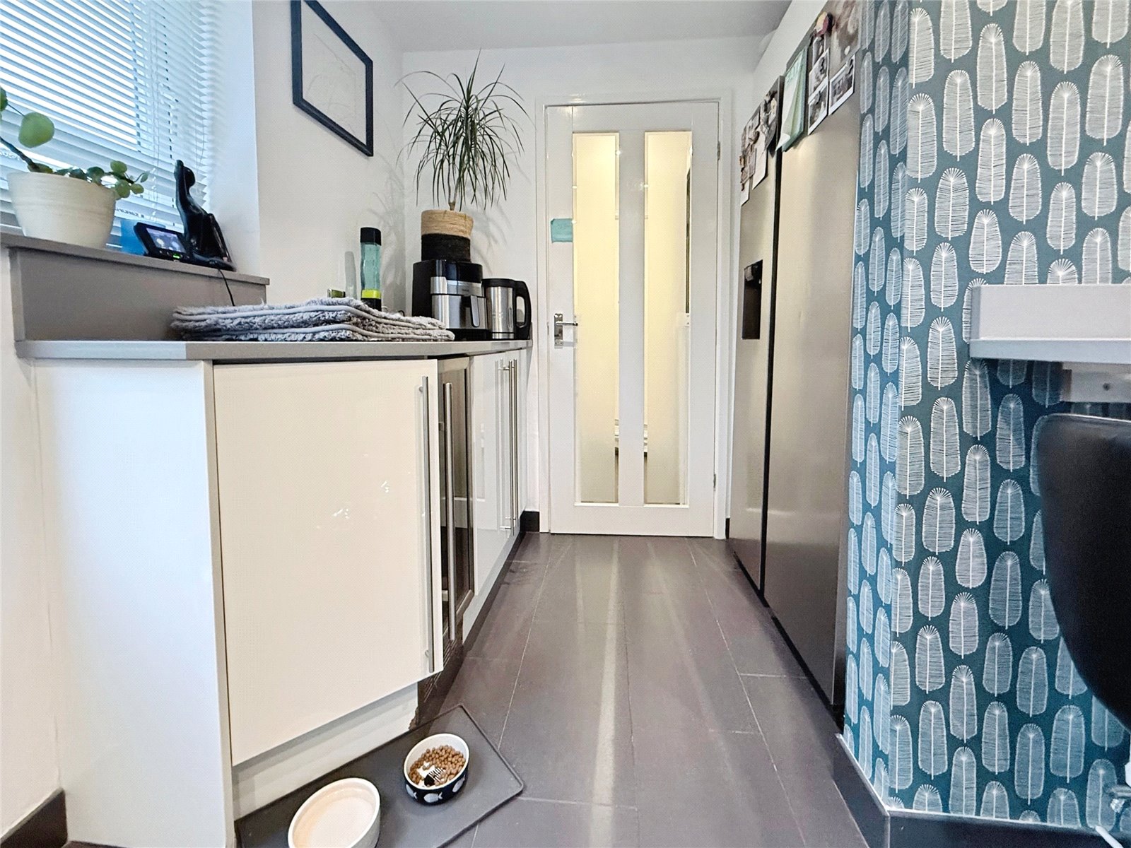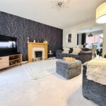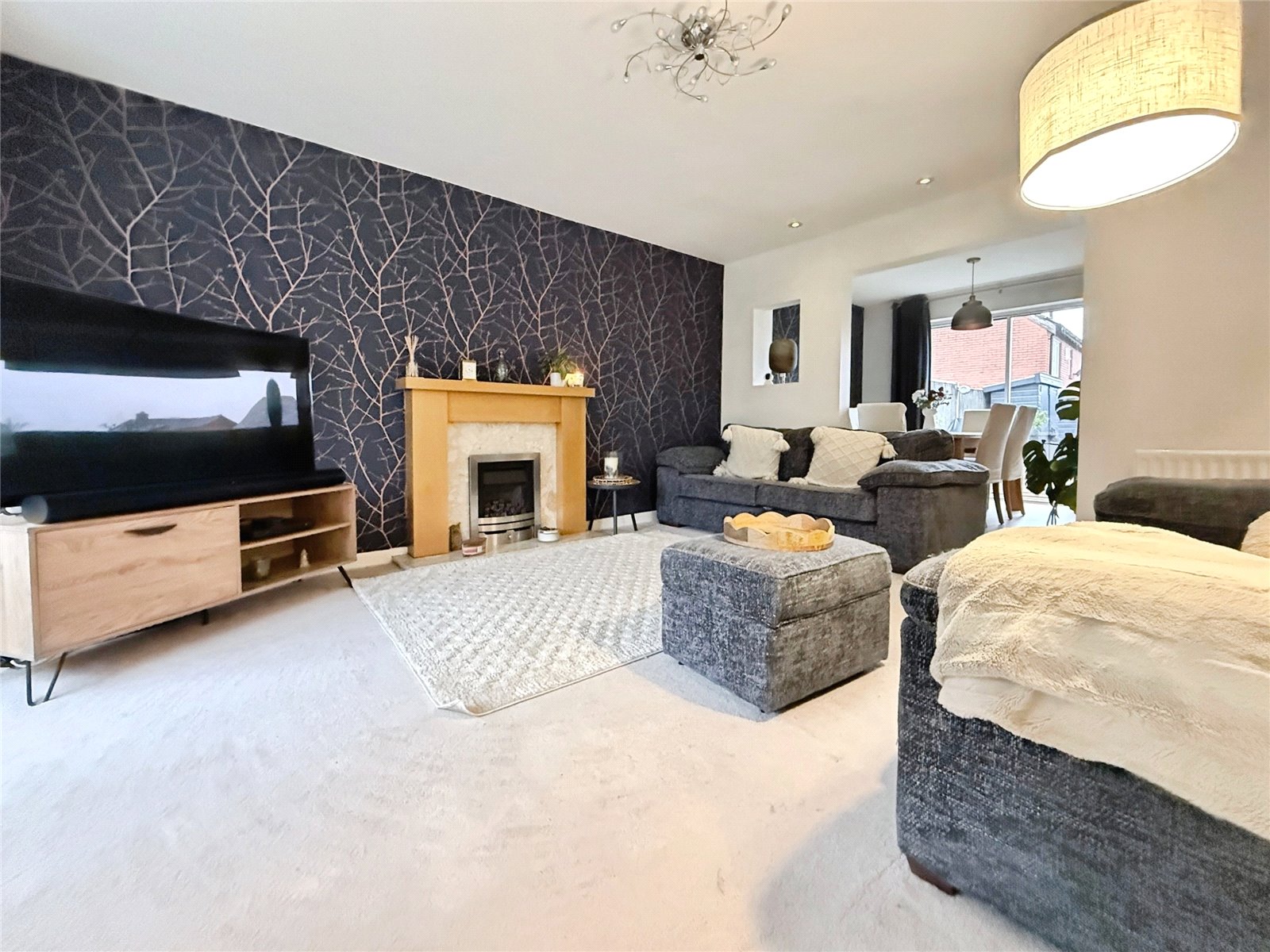 The property immediately impresses with its attractive frontage, ample off-road parking and integral garage. Upon entering, a welcoming hallway leads through to a spacious living room featuring a bay window and a stylish focal fireplace, creating a warm and comfortable space to relax. Double doors open through to a separate dining area, perfect for family meals or entertaining, which in turn connects seamlessly to the contemporary kitchen/breakfast room. The kitchen has been thoughtfully designed with modern cabinetry, quality work surfaces and integrated appliances, offering excellent storage and preparation space, with direct access to the rear garden. A useful utility room, ground floor WC and additional store room complete the ground floor layout, adding to the practicality of the home.