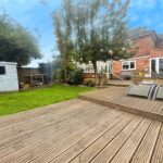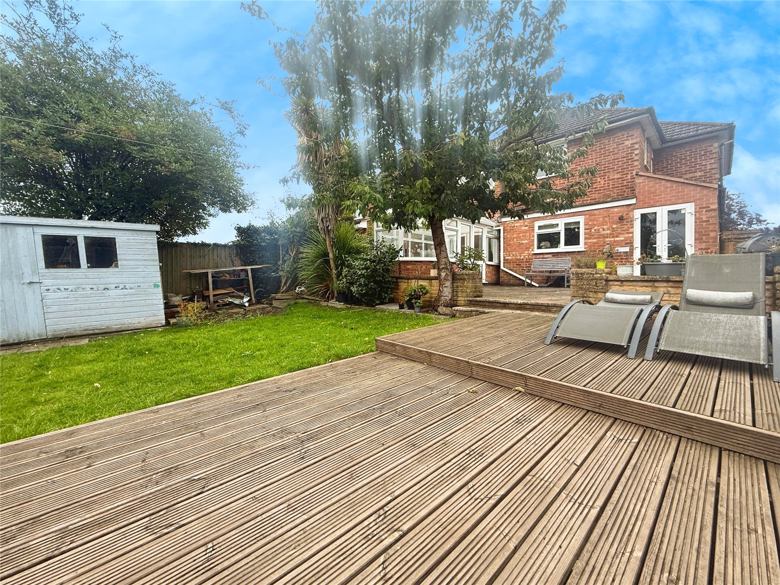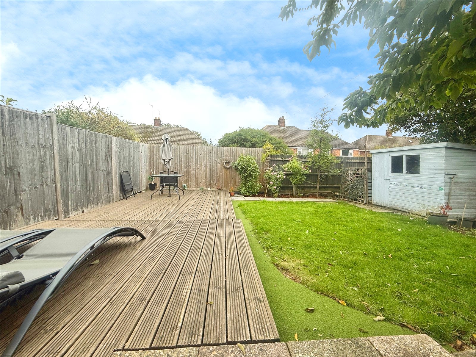 The outdoor space adds another layer of appeal, with a landscaped garden that combines a decked seating area, lawn, and mature planting – perfect for summer gatherings. A timber shed and side access add practicality, while the integral garage and driveway provide off-road parking.
