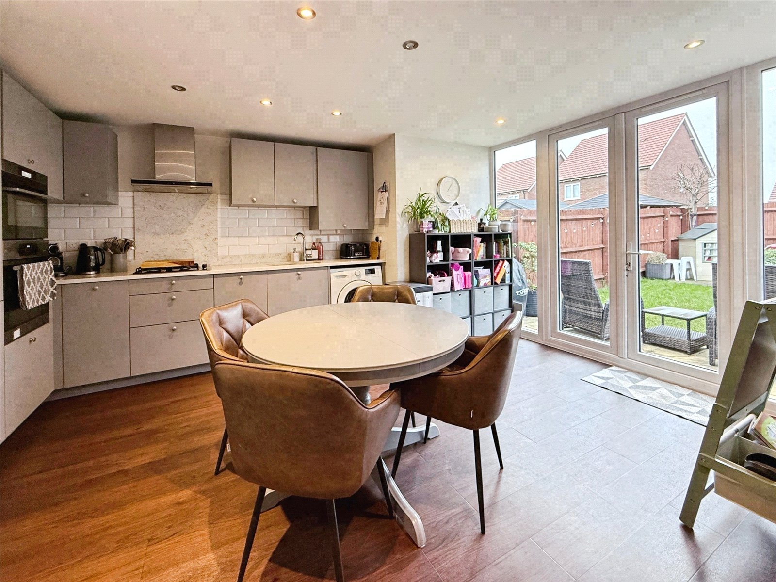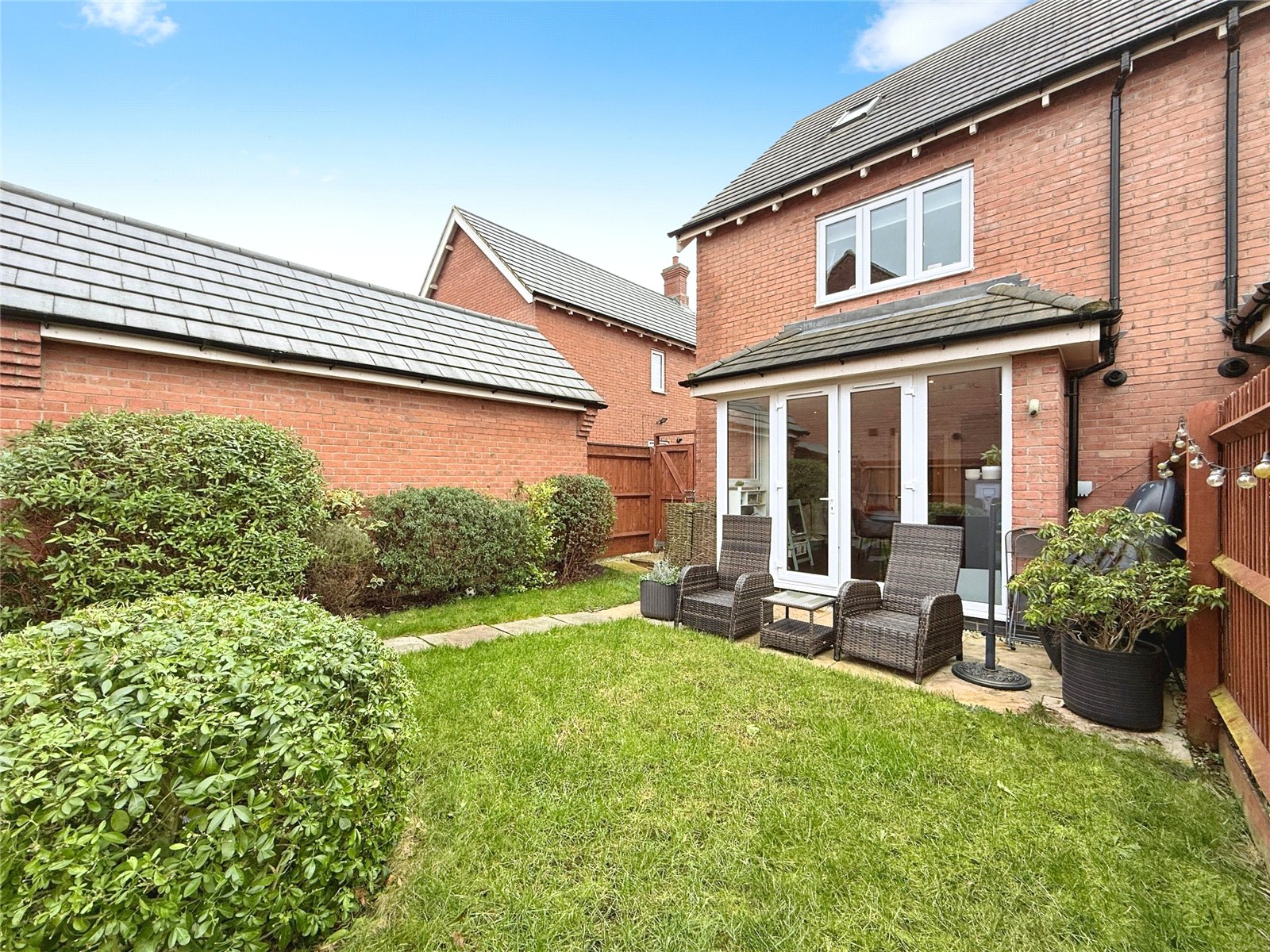 Externally, the rear garden is well maintained and designed for both relaxation and family use, featuring a lawn, patio seating area and planted borders. The frontage offers off-road parking and the property sits within a popular residential development, conveniently located for local amenities, schools and transport links.