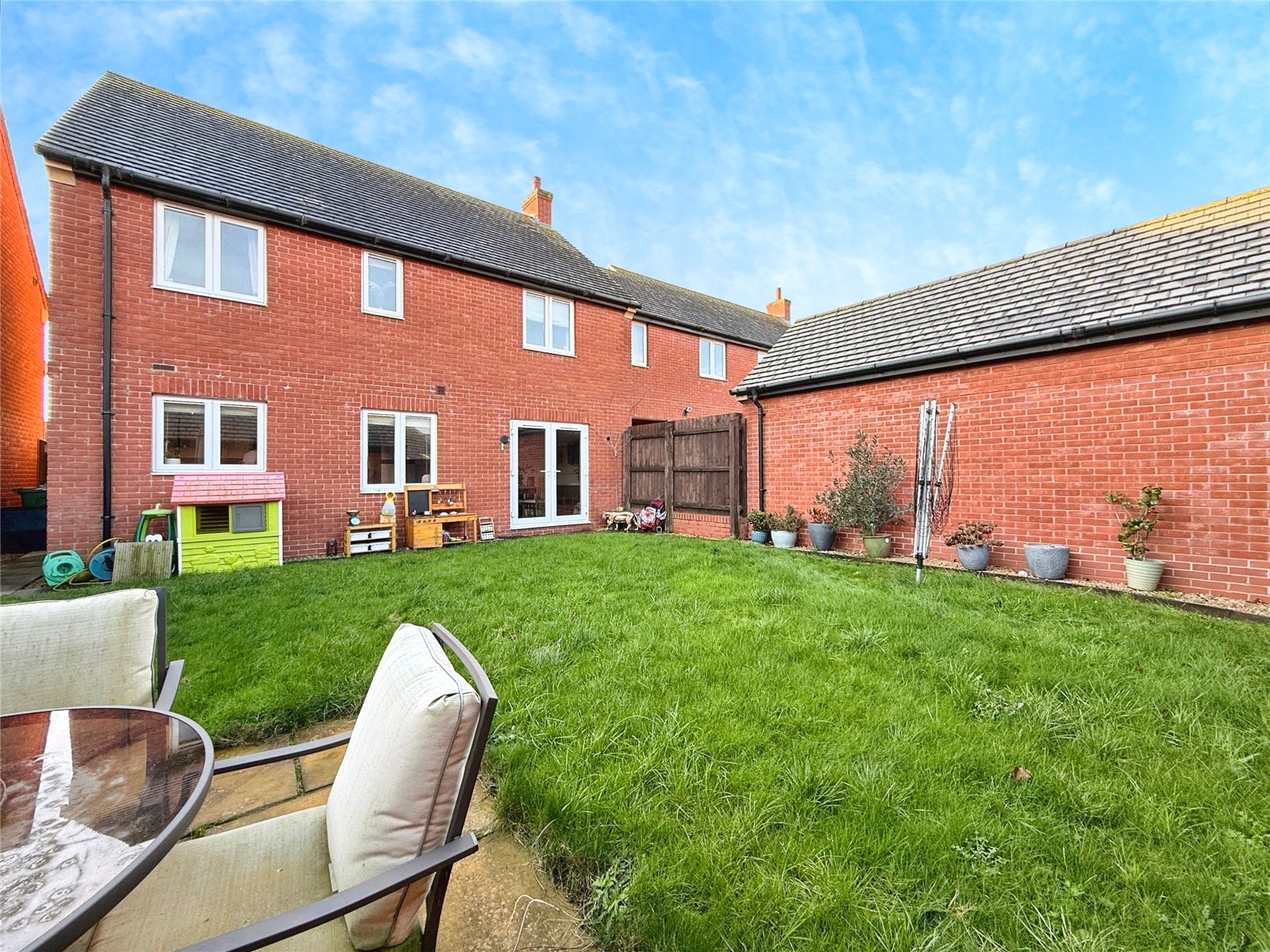 The property is approached via a welcoming entrance hall which provides access to the principal ground floor rooms. To the front of the home is a well-proportioned living room, offering a comfortable and inviting space to relax. Moving through the hallway, there is a convenient ground floor WC and a versatile playroom, ideal for use as a home office, snug or additional reception space. To the rear of the property is the impressive open-plan kitchen and dining room, which forms the heart of the home.