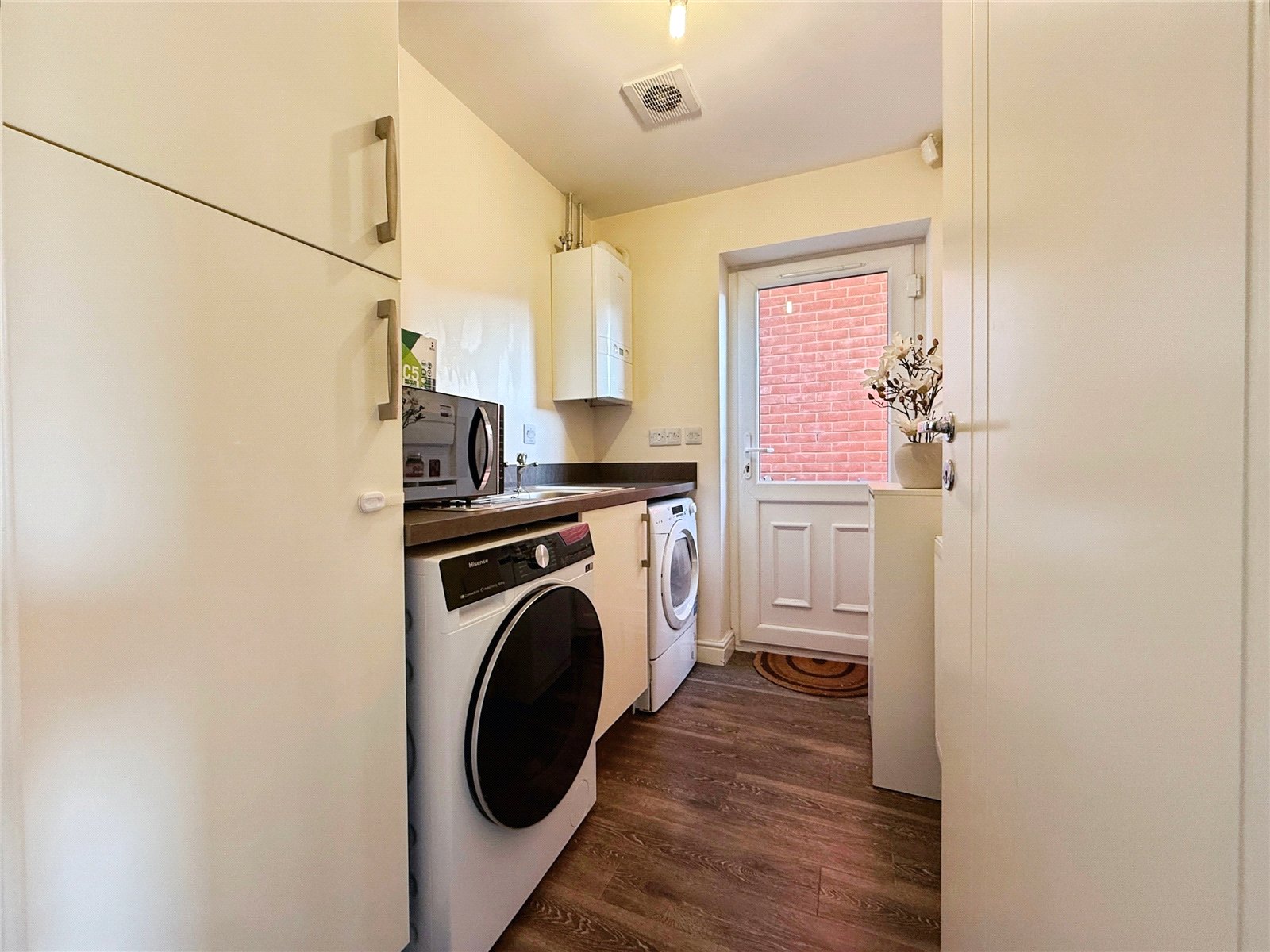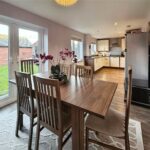 The kitchen is fitted with a range of modern units and integrated appliances, with ample worktop space and room for freestanding appliances. The dining area enjoys plenty of natural light and has direct access via French doors to the rear garden, making it perfect for both everyday family life and entertaining. A separate utility room is located off the kitchen and provides additional storage and external access.