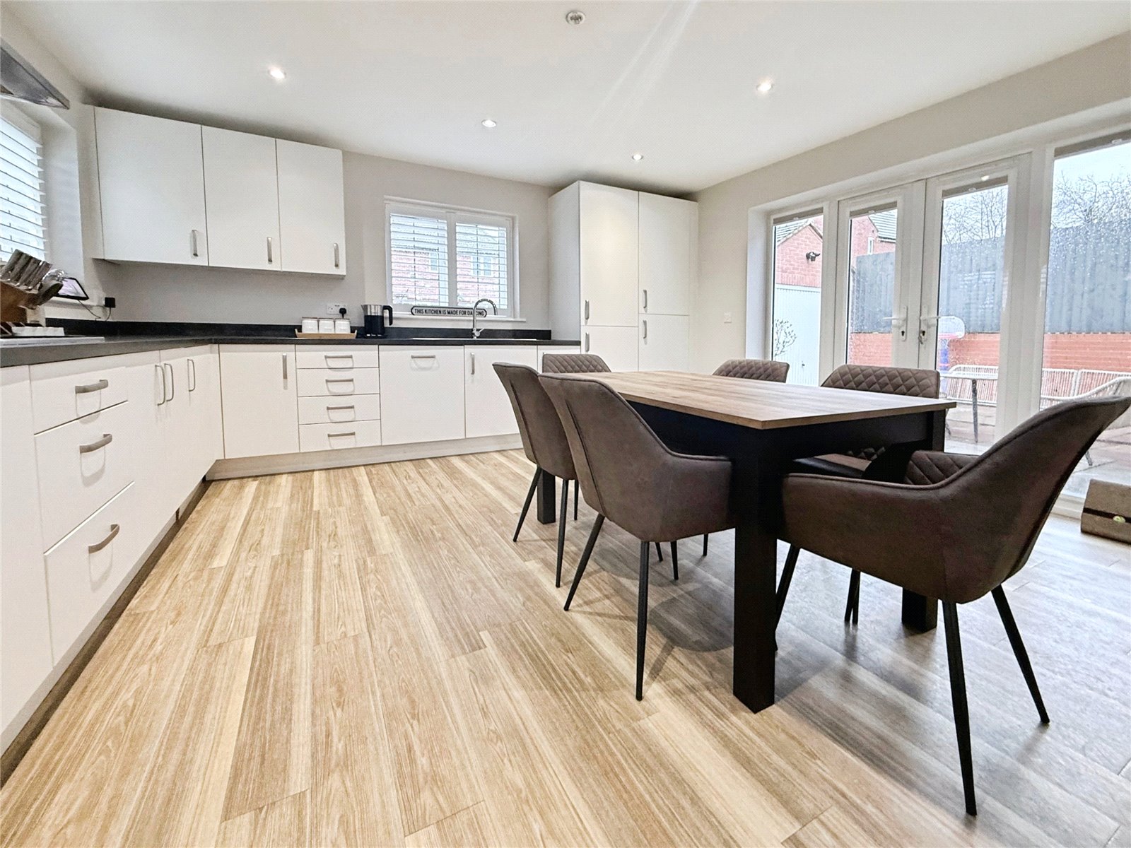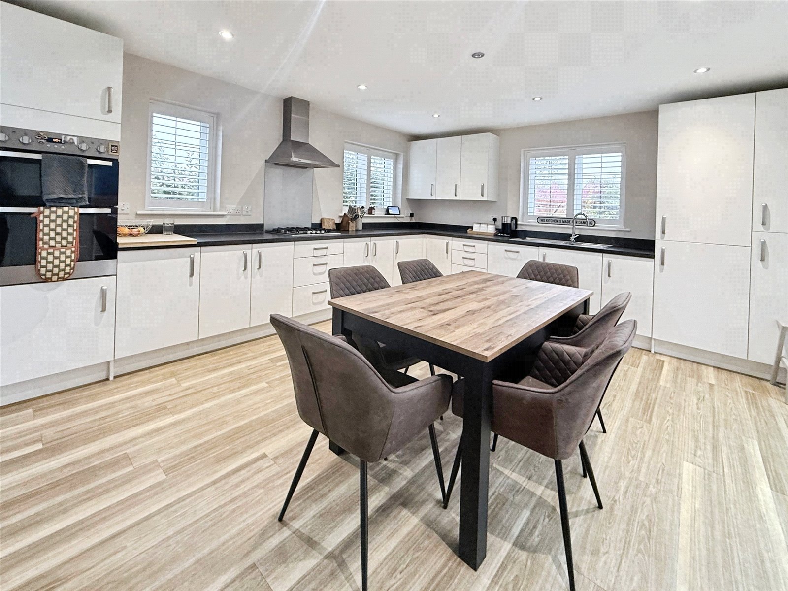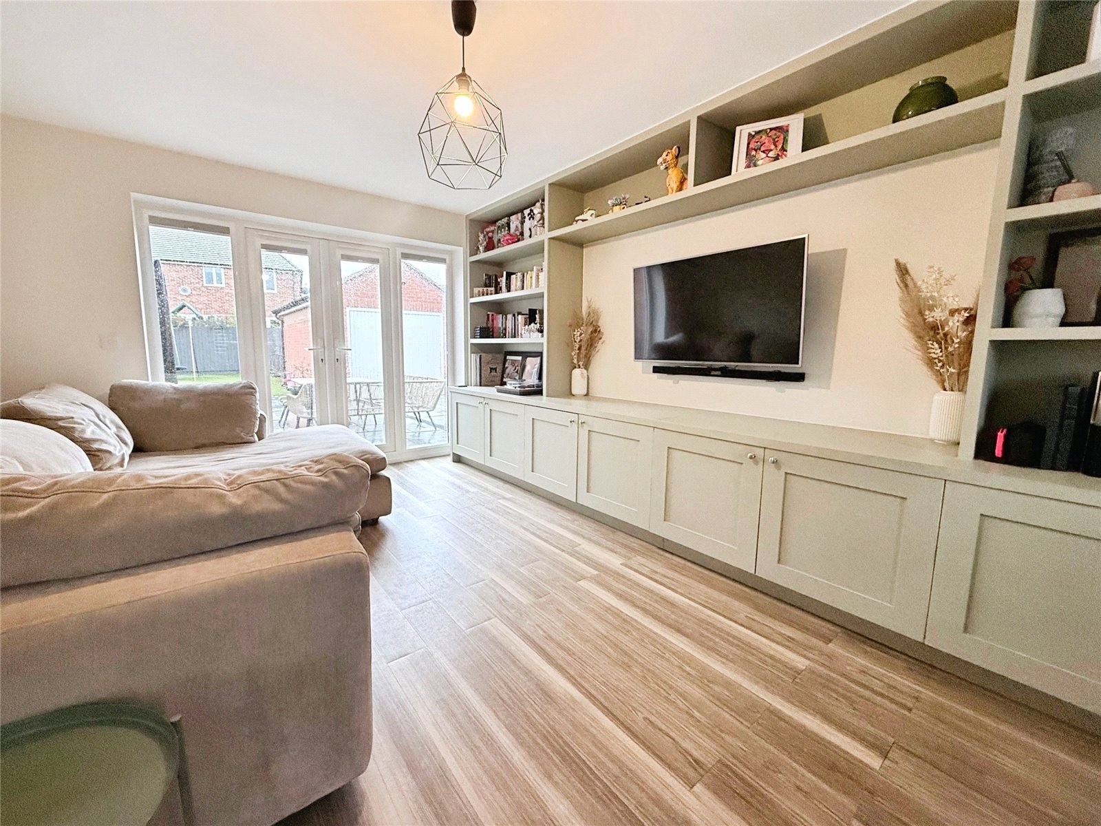 This attractive four bedroom detached home on Moore Gardens Close offers generous family living in a sought-after part of Rothley. A welcoming entrance hall leads to a versatile snug or playroom at the front, alongside a useful cloakroom and separate utility room. At the rear, the broad living room provides a comfortable space to relax with bespoke builtin cabinetry and French doors opening to the garden. Opposite, an impressive kitchen diner spans the depth of the house and features sleek white cabinetry, ample workspace, integrated double oven and gas hob, and plenty of room for dining; French doors here also open directly onto the patio to create an easy flow for entertaining.