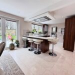 To the rear, the heart of the home is the impressive open plan kitchen dining room, spanning the width of the property. Fitted with a modern range of wall and base units complemented by ample work surfaces and a central island with breakfast seating, the space is perfectly designed for both day-to-day family life and entertaining. French doors open directly onto the patio and rear garden, creating a seamless connection between indoor and outdoor living.