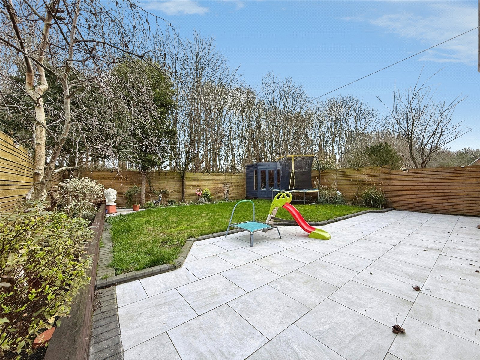 Outside, the property enjoys a well maintained rear garden featuring a paved patio seating area and lawn, offering an excellent space for families and outdoor entertaining. To the front is a driveway providing off road parking.
