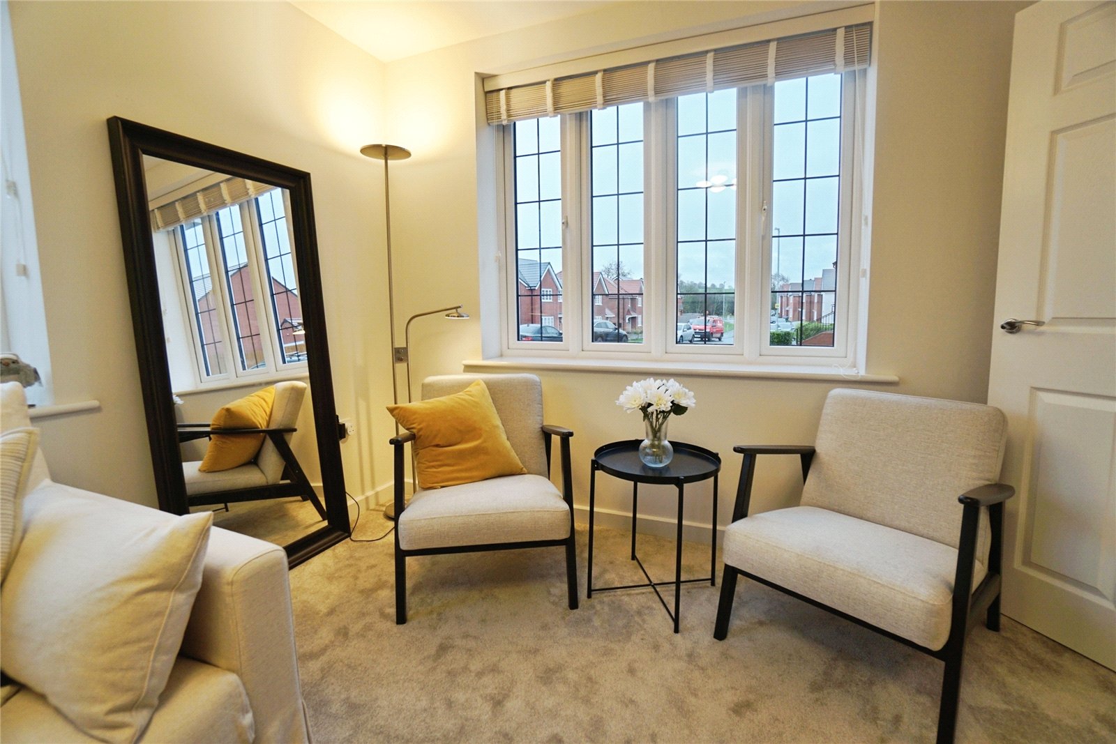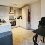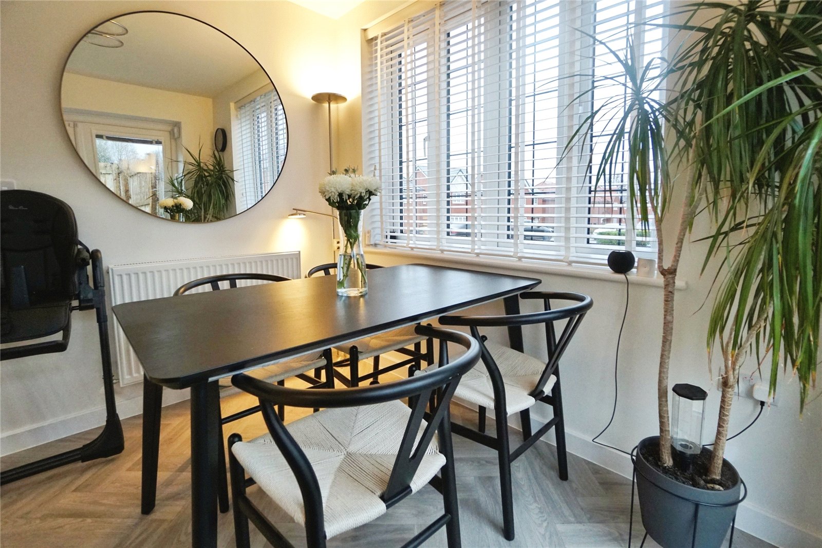 The ground floor comprises a welcoming entrance hall with access to the guest WC, leading through to a generous lounge filled with natural light from dual-aspect windows. The room offers ample space for comfortable seating and is thoughtfully arranged to create a warm, inviting atmosphere. To the rear sits a contemporary kitchen/diner, complete with integrated appliances, sleek cabinetry and plenty of space for a family dining table. French doors open directly onto the garden, making this an ideal spot for entertaining or everyday family living.