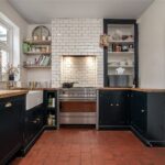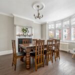 To the front, a bay fronted reception room is currently arranged as a formal dining space, complete with stripped timber flooring, decorative coving, bespoke alcove shelving and a feature fireplace, all of which retain the charm expected of a 1930s home. To the rear, the principal living room enjoys a seamless connection to the garden via glazed doors, allowing natural light to flood the space. Beautiful parquet flooring and a log-burning stove set against metro-tiled detailing create a cosy yet refined focal point.