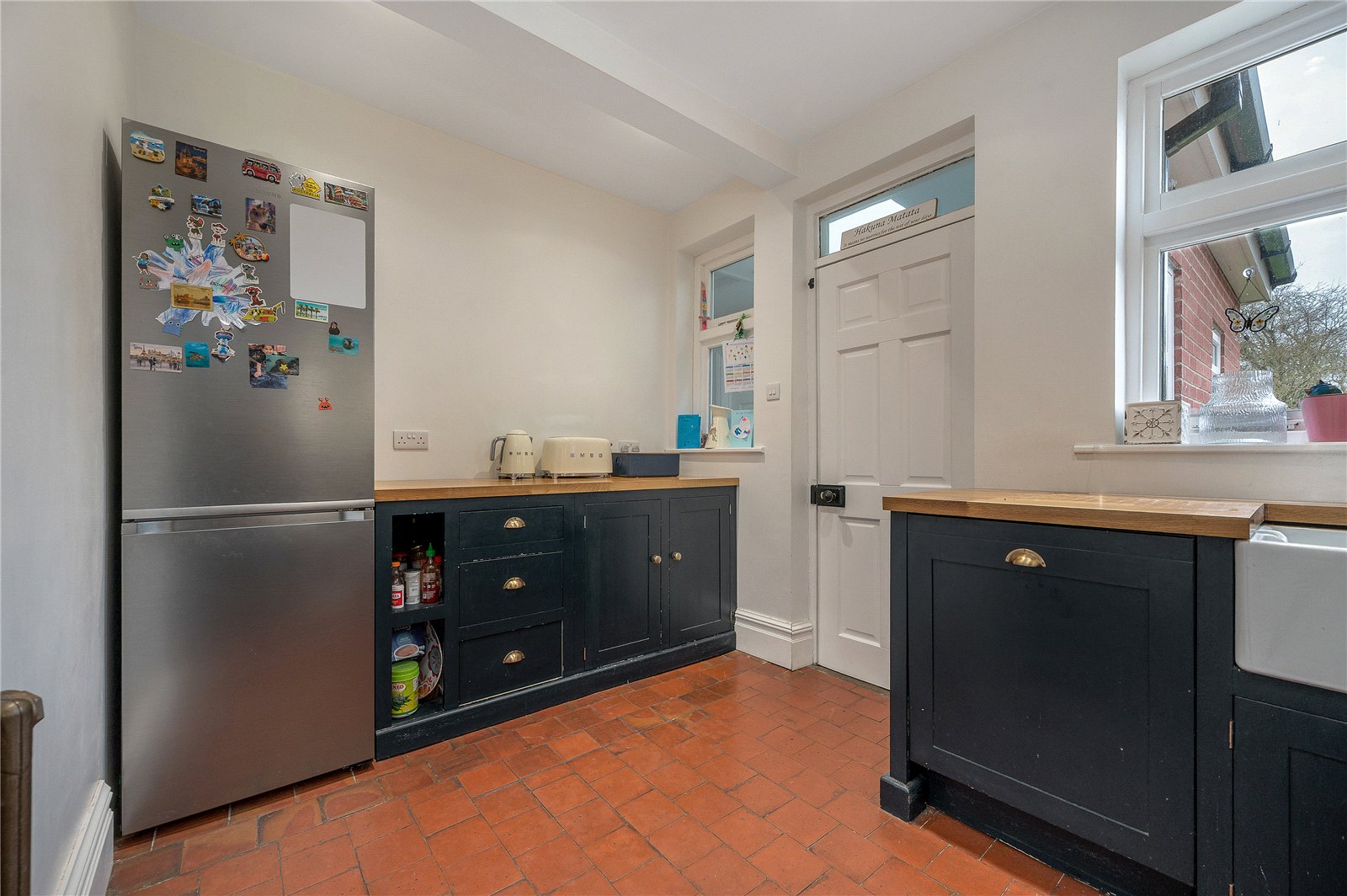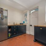 The kitchen overlooks the rear garden and has been fitted with bespoke shaker-style cabinetry, solid wooden work surfaces and a range-style cooker, complemented by a Belfast sink and excellent storage. The layout offers both practicality and character, with access through to the garage and additional outbuildings beyond.
