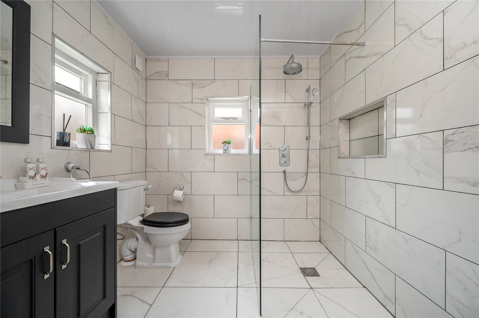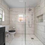A significant addition by the current sellers is the newly installed ground floor shower room, finished in a sleek and contemporary style with large-format tiling, walk-in rainfall shower, vanity storage and WC. This thoughtfully designed space adds both flexibility and convenience.