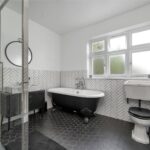 The principal family bathroom is a true statement space, featuring a striking clawfoot freestanding bath, oversized walk-in shower with rainfall fittings, stylish herringbone tiling and quality sanitaryware, creating a luxurious yet timeless finish that perfectly complements the age of the property.