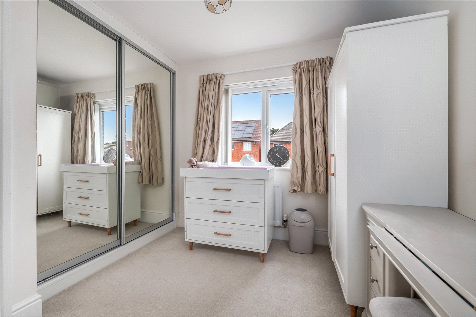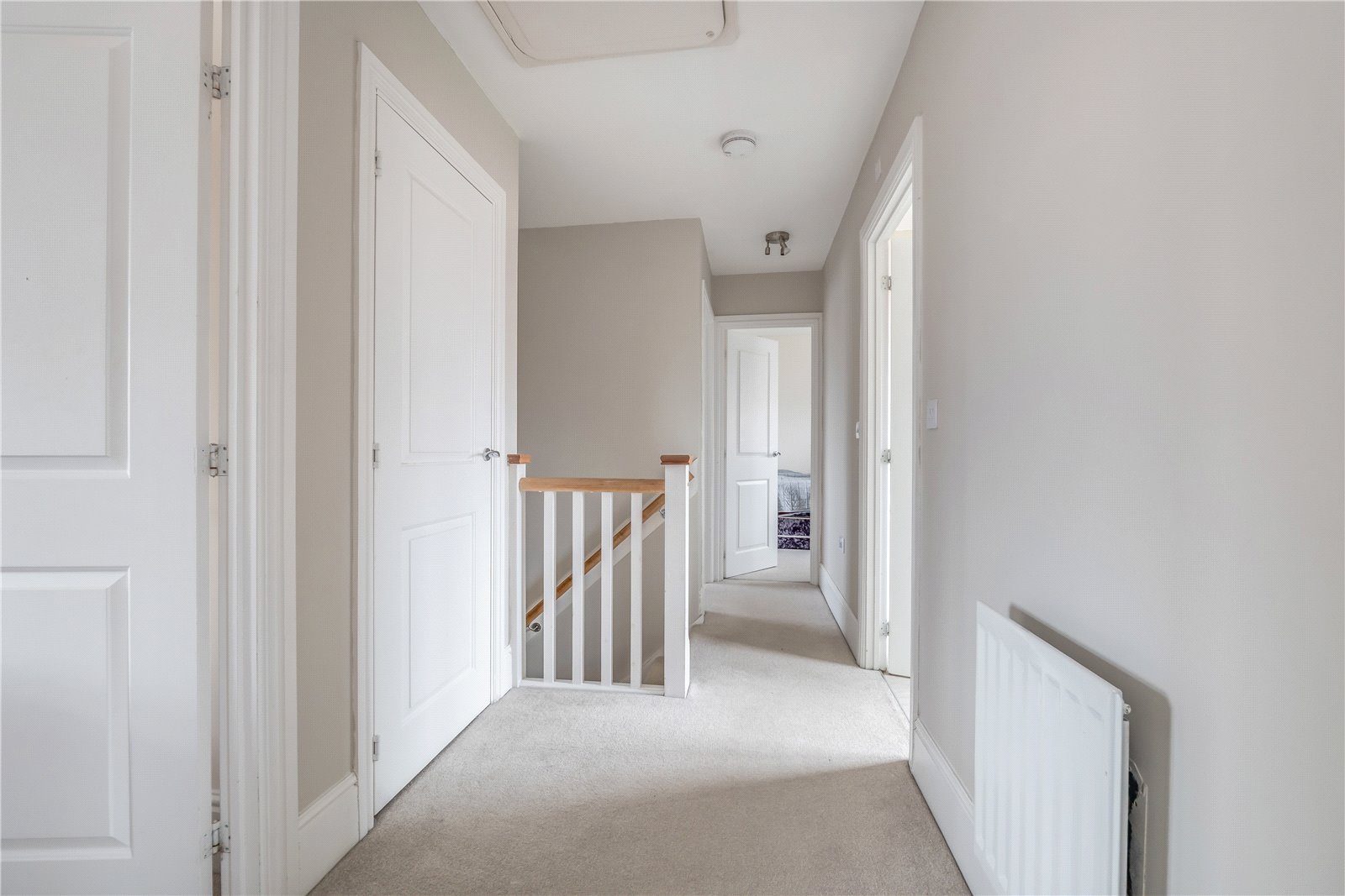 Upstairs, the landing opens out centrally, giving access to all four bedrooms without wasted space. The principal bedroom benefits from fitted storage and a dedicated en-suite, creating a sense of privacy away from the rest of the house. The remaining bedrooms are all well proportioned, easily accommodating double beds and storage, and served by the family bathroom, which sits centrally for convenience.