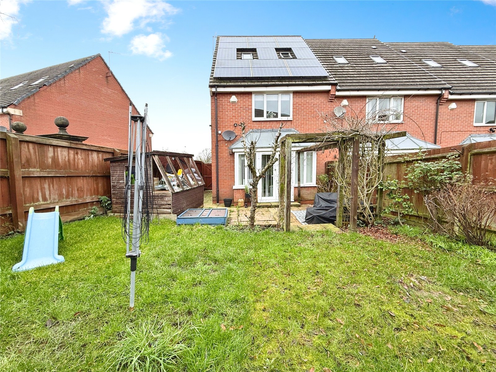 Outside, the property enjoys an enclosed rear garden with lawn and patio areas, along with a greenhouse, offering a usable outdoor space for families and keen gardeners. As an end of terrace home, it benefits from additional privacy. The property also offers driveway parking and features solar panels, contributing towards improved energy efficiency.