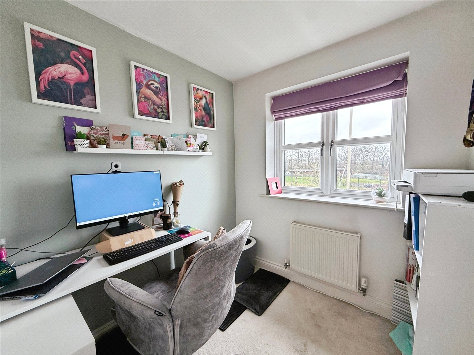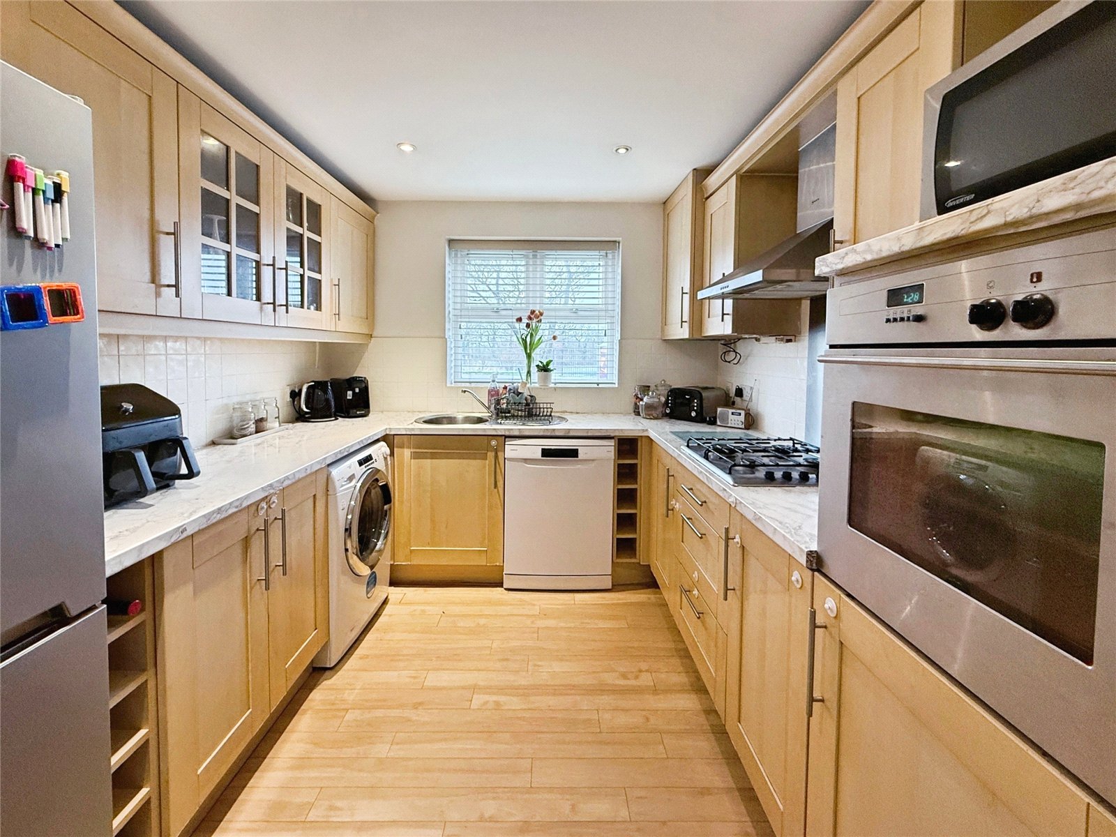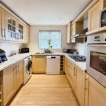 Upon entering, a welcoming hallway provides access to a ground floor cloakroom and leads through to the living room positioned at the rear of the property. This comfortable space enjoys a pleasant outlook over the garden, with doors opening directly outside, allowing plenty of natural light and creating a good connection between indoor and outdoor living. To the front, the fitted kitchen offers a range of wall and base units with integrated appliances and opens into a separate dining area, making it a practical space for everyday use and entertaining.