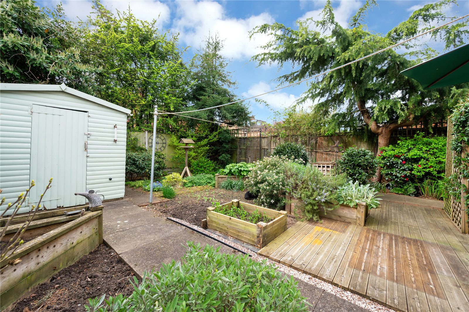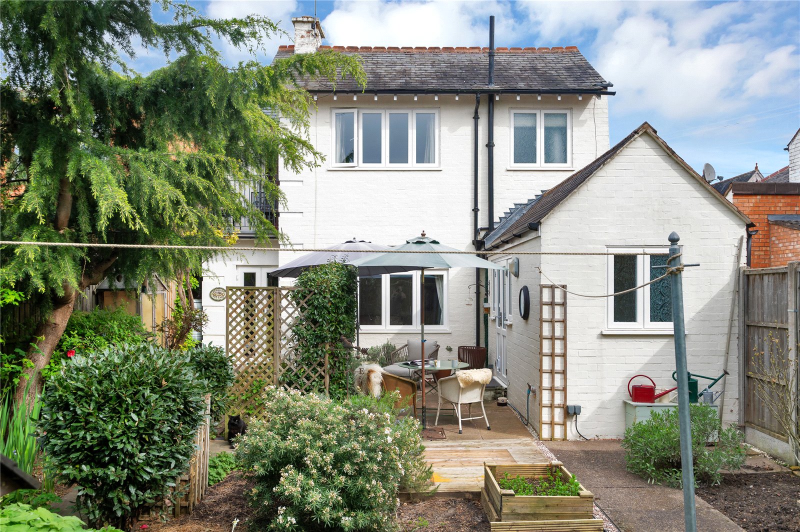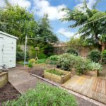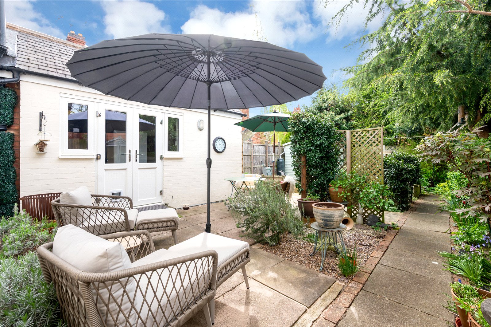 Externally, the south-facing rear garden has been thoughtfully arranged with a paved terrace, established planting and a variety of seating areas, creating a private and usable outdoor space throughout the year. A timber shed and mature borders further enhance the setting.