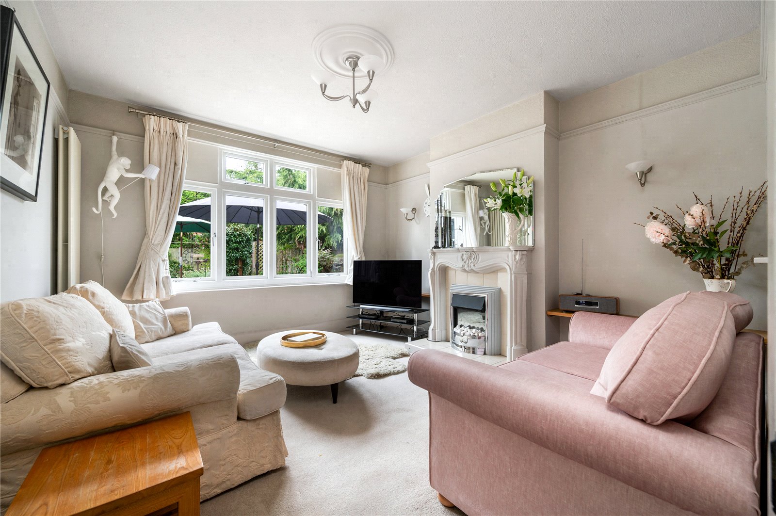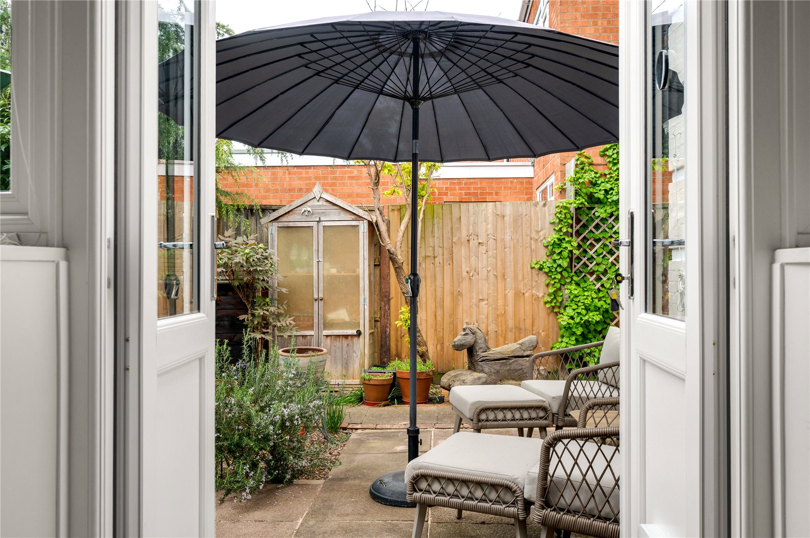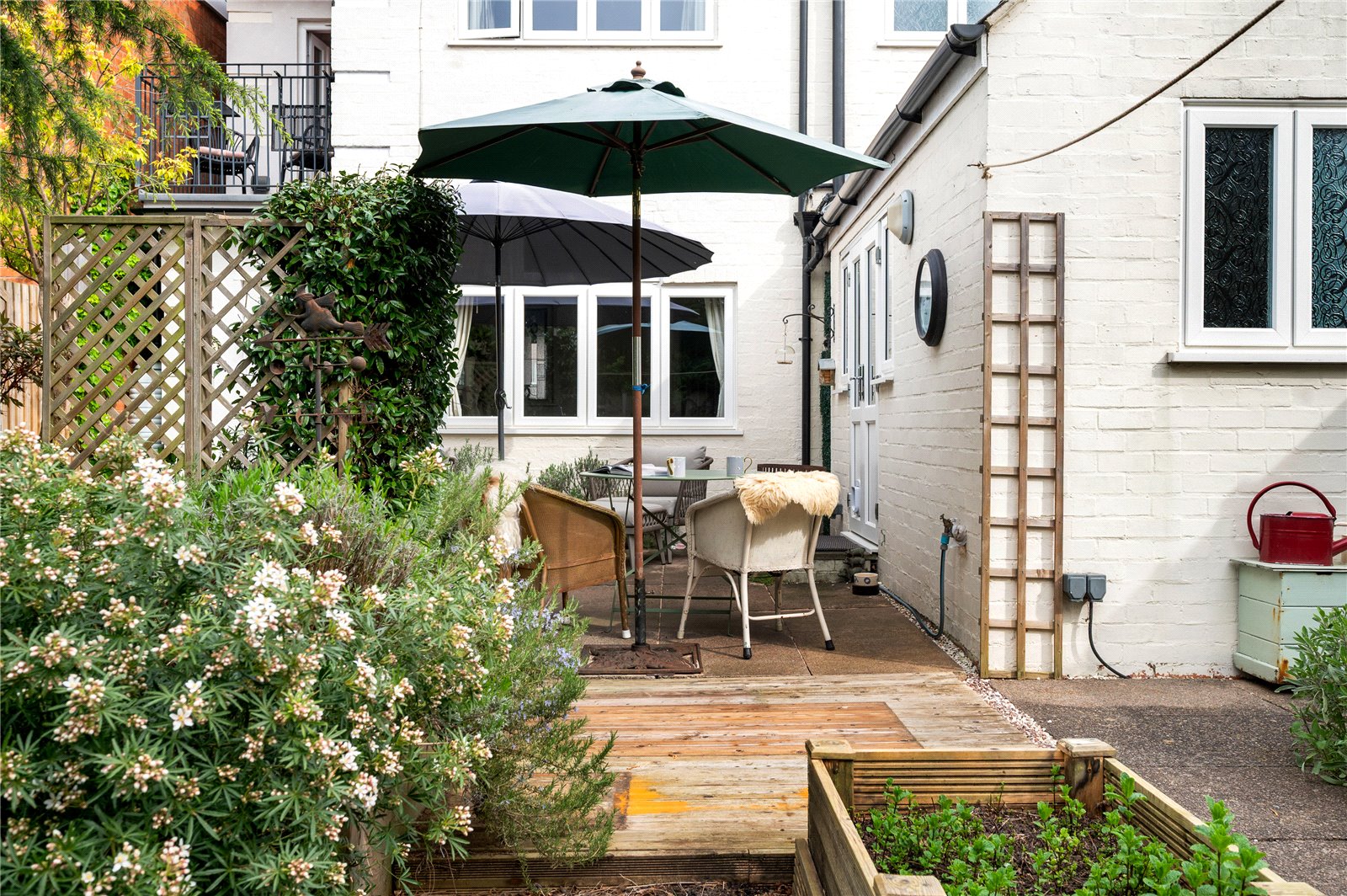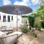 Externally, the south-facing rear garden has been thoughtfully arranged with a paved terrace, established planting and a variety of seating areas, creating a private and usable outdoor space throughout the year. A timber shed and mature borders further enhance the setting.