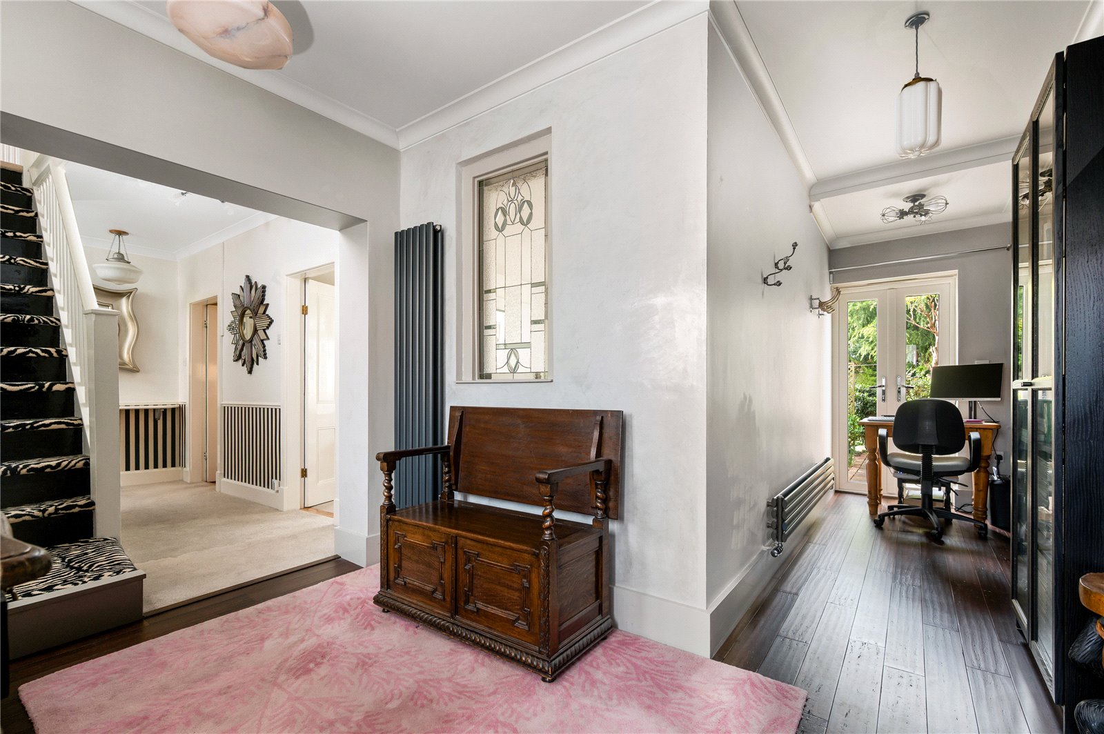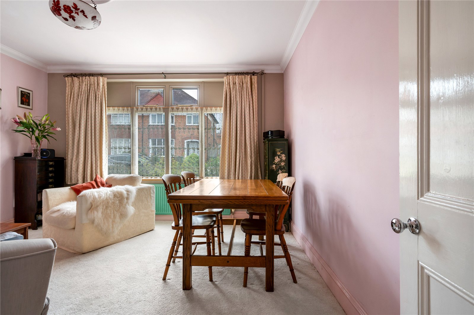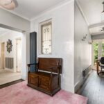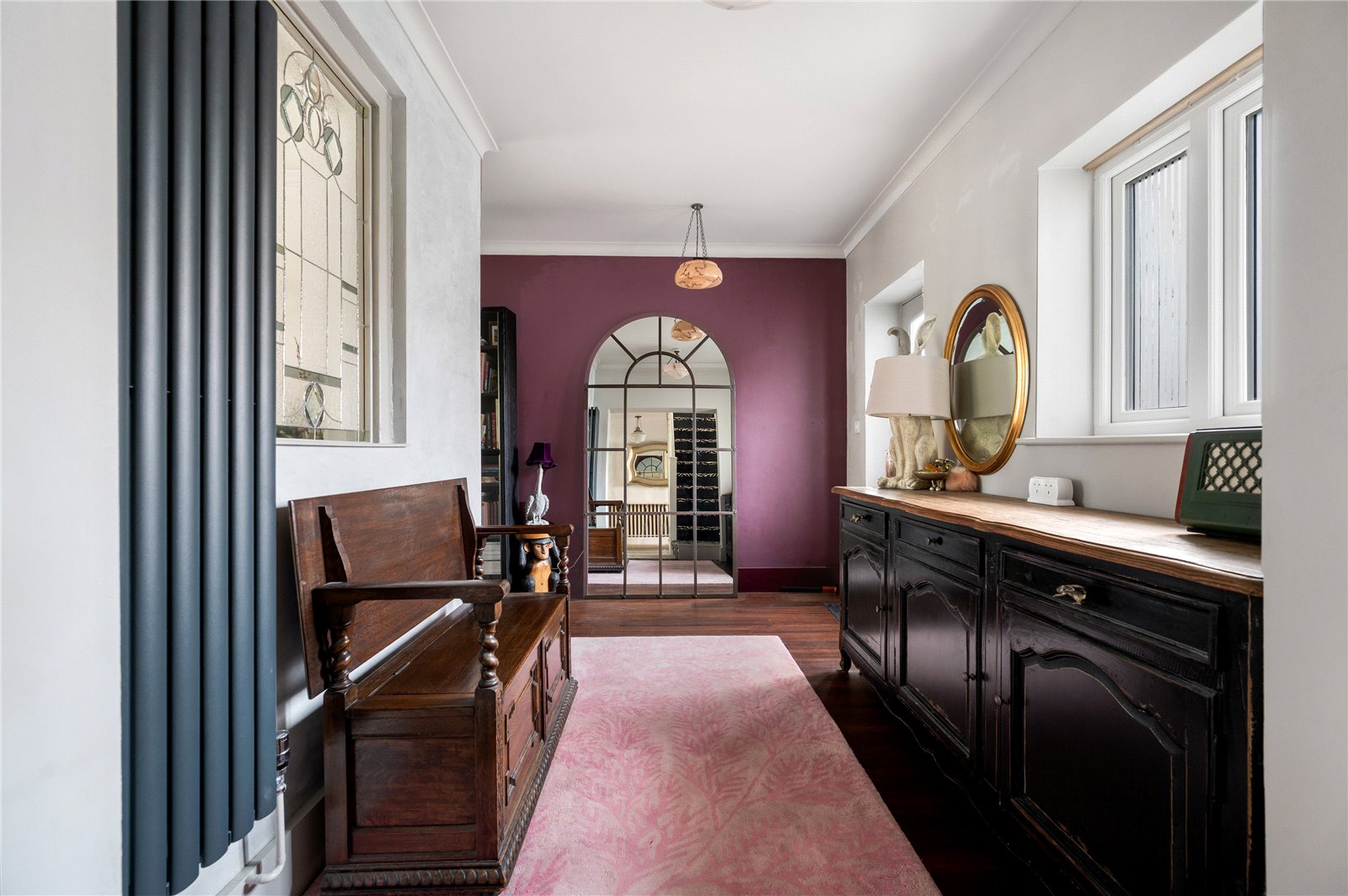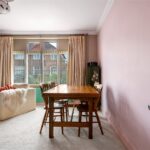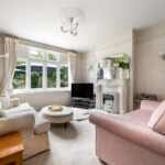 The approach is discreet, with off-road parking and a traditional frontage framed by a low picket fence and planting. The double-fronted façade reflects the original form of the house, while inside, a broad entrance hall provides a strong sense of arrival, enhanced by natural light and a bespoke stained glass panel set within Venetian plaster. The principal reception room sits to one side, centred around a feature fireplace and defined by generous ceiling heights and a wide bay-style window overlooking the rear garden, drawing in excellent natural light. Original detailing, including coving and proportions typical of the period, remain intact, giving the room a strong architectural presence. Opposite, the dining room provides a well-balanced second reception space, ideal for formal dining, with a large window to the front elevation and ample room for a full dining suite.