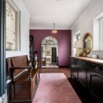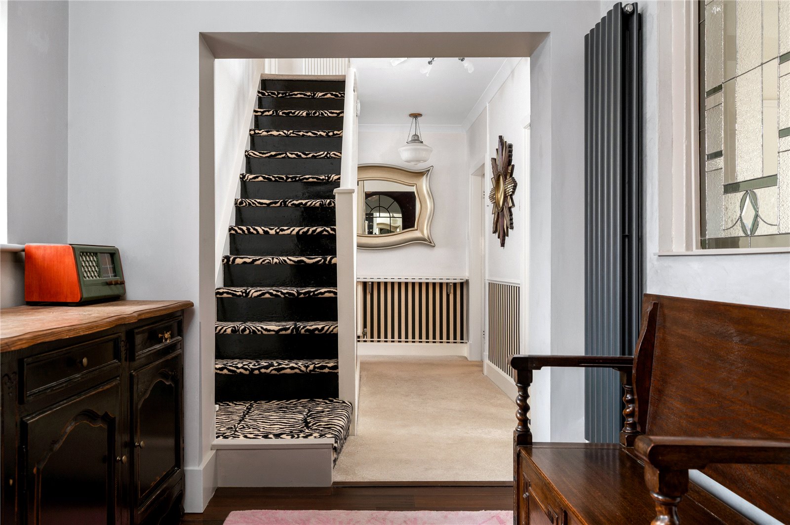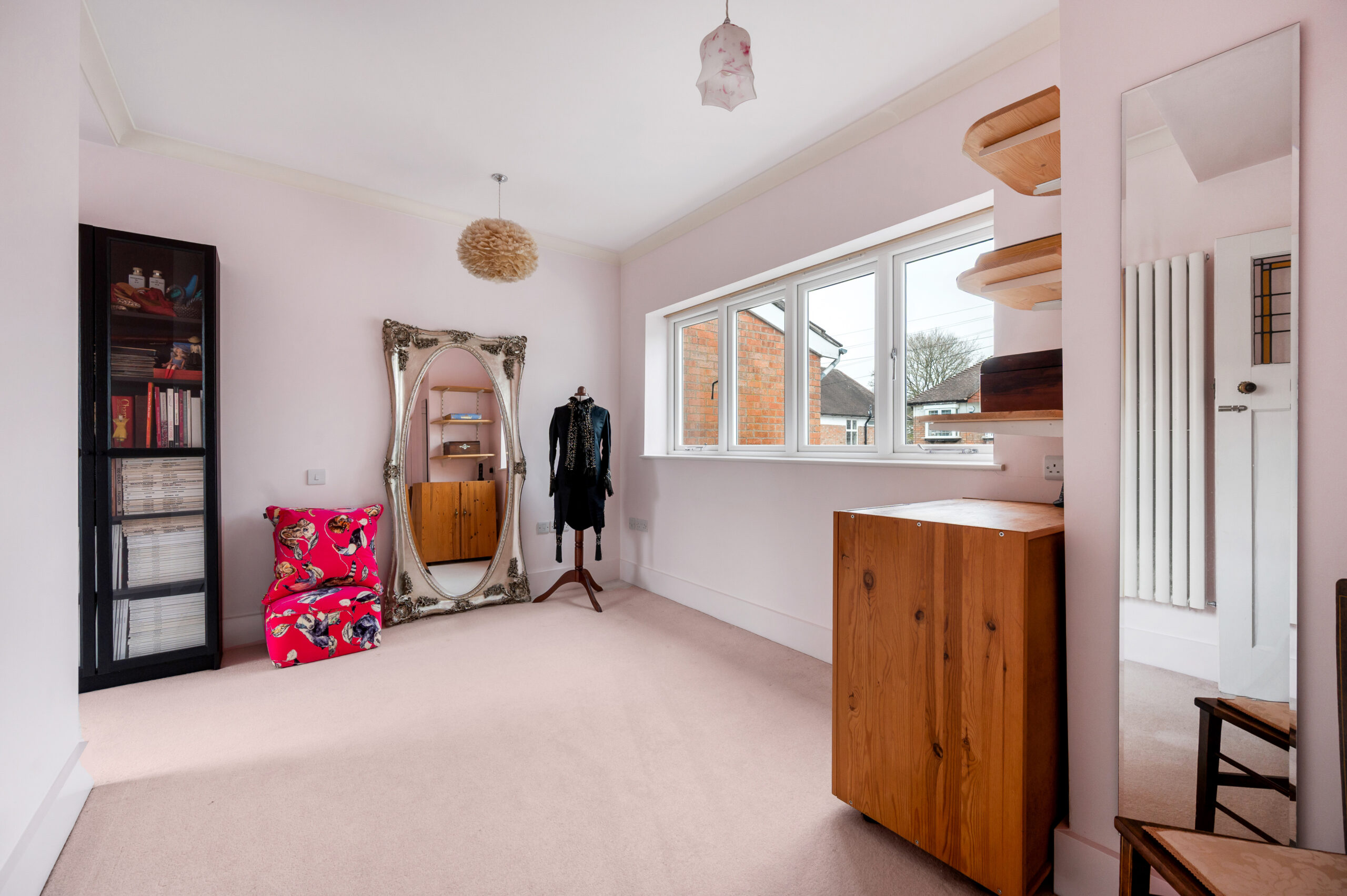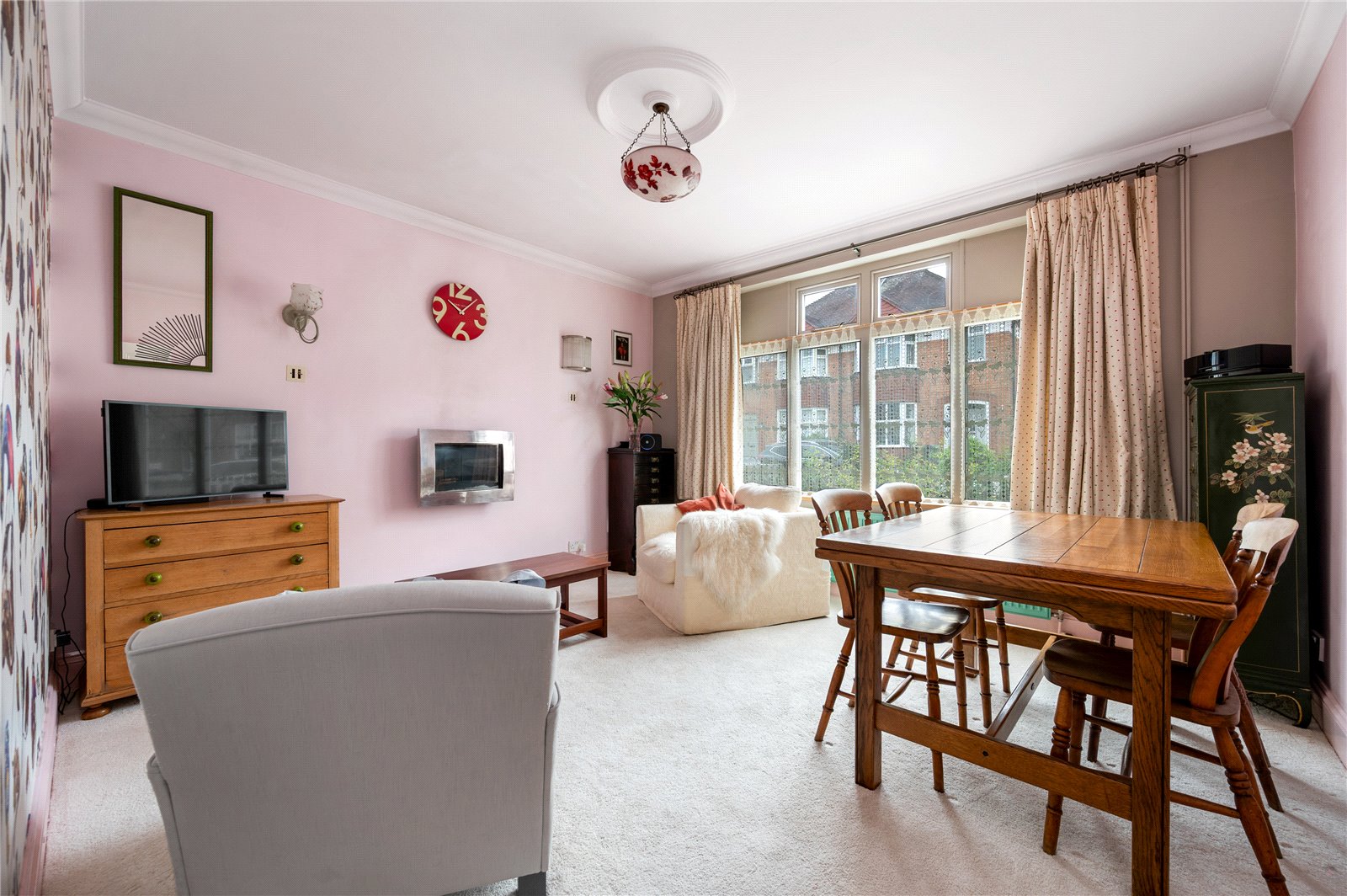 The approach is discreet, with off-road parking and a traditional frontage framed by a low picket fence and planting. The double-fronted façade reflects the original form of the house, while inside, a broad entrance hall provides a strong sense of arrival, enhanced by natural light and a bespoke stained glass panel set within Venetian plaster. The principal reception room sits to one side, centred around a feature fireplace and defined by generous ceiling heights and a wide bay-style window overlooking the rear garden, drawing in excellent natural light. Original detailing, including coving and proportions typical of the period, remain intact, giving the room a strong architectural presence. Opposite, the dining room provides a well-balanced second reception space, ideal for formal dining, with a large window to the front elevation and ample room for a full dining suite.