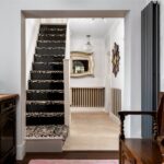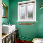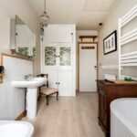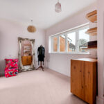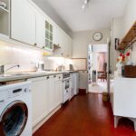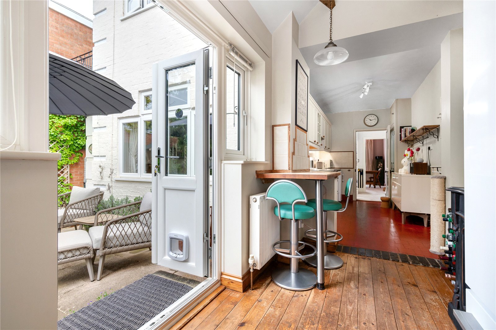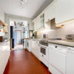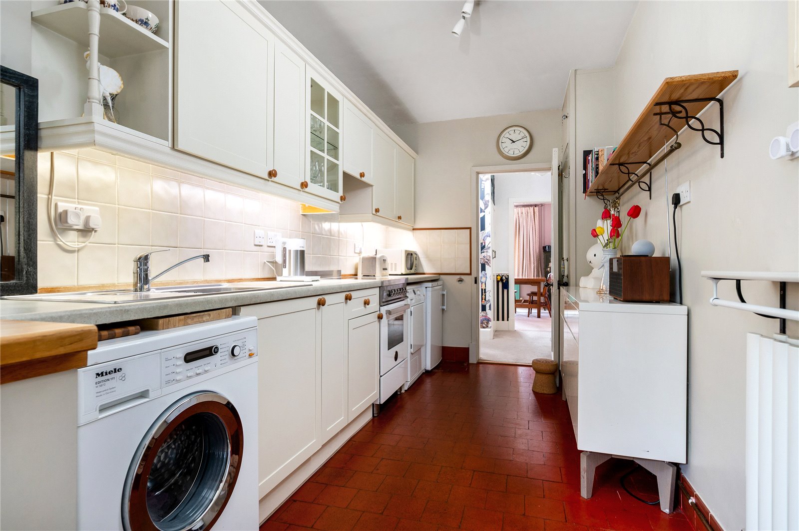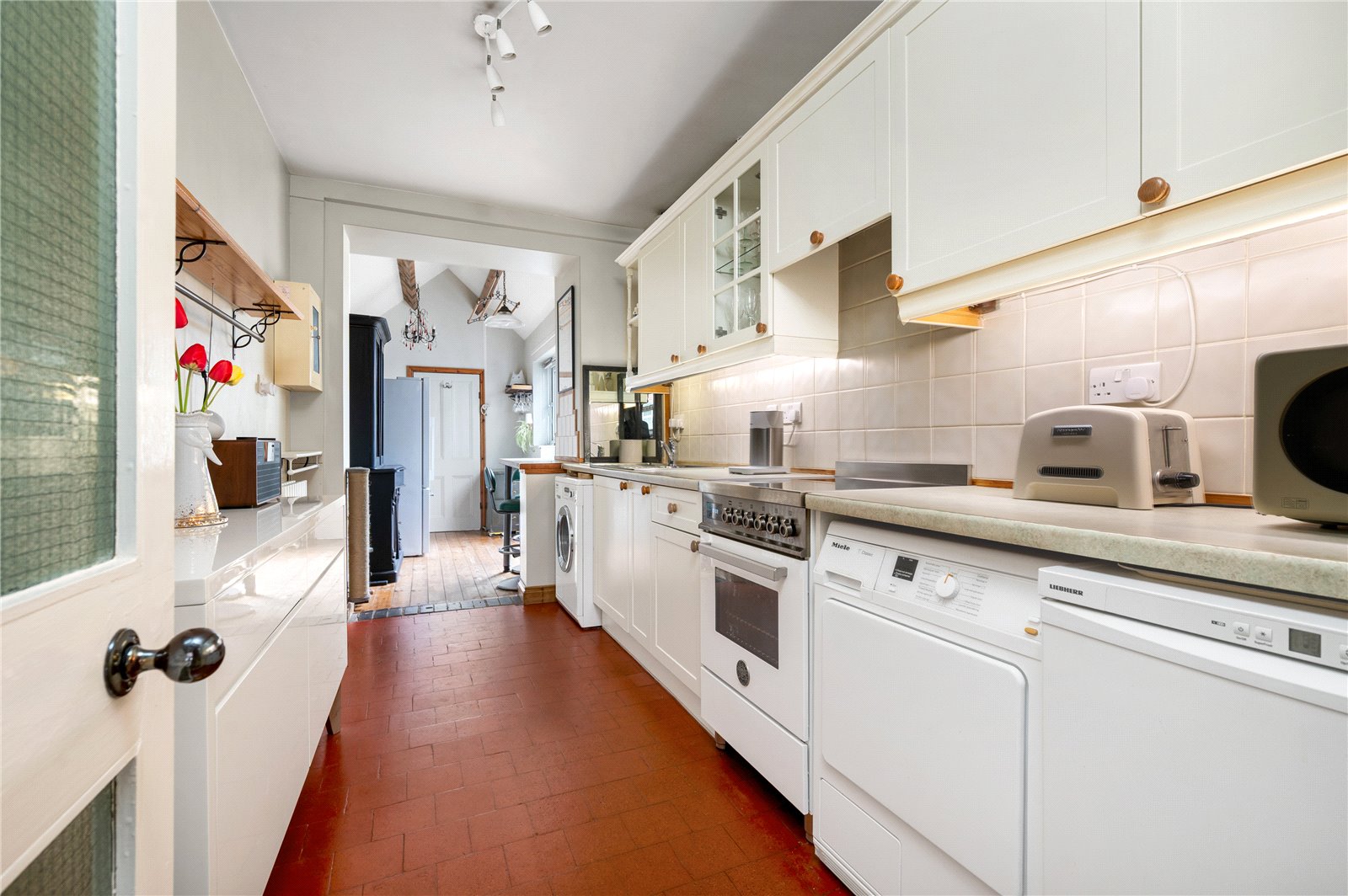 To the rear, the kitchen extends along the back of the home, forming a practical and well-connected space that links directly to the garden room beyond. Fitted with classic cabinetry, tiled flooring and extensive work surfaces, it offers space for freestanding appliances while maintaining a traditional feel. The original rear door has been retained internally as a character feature.