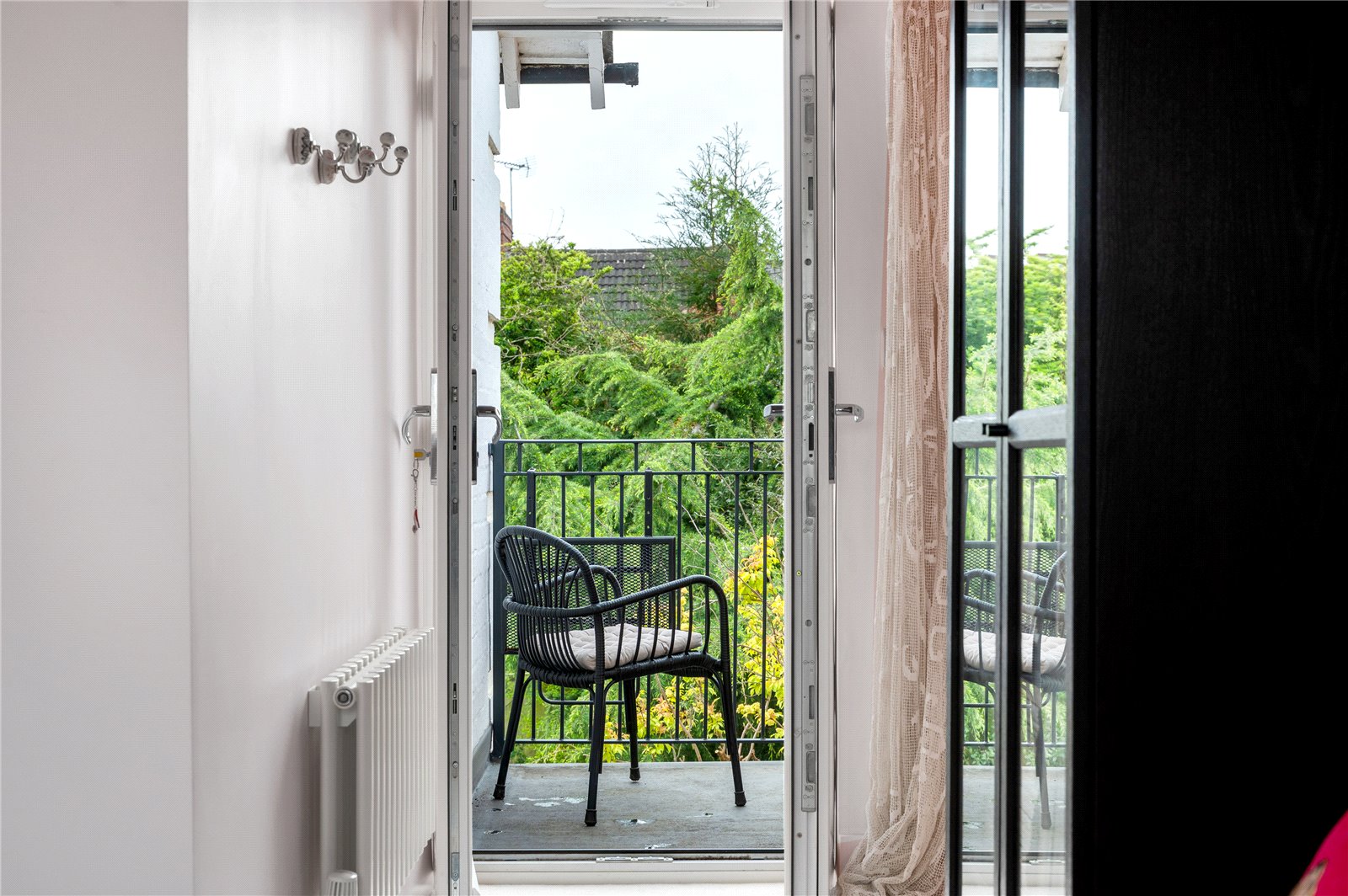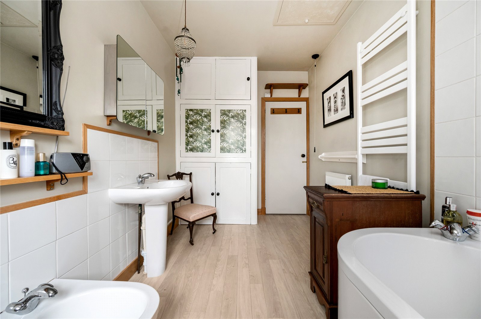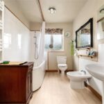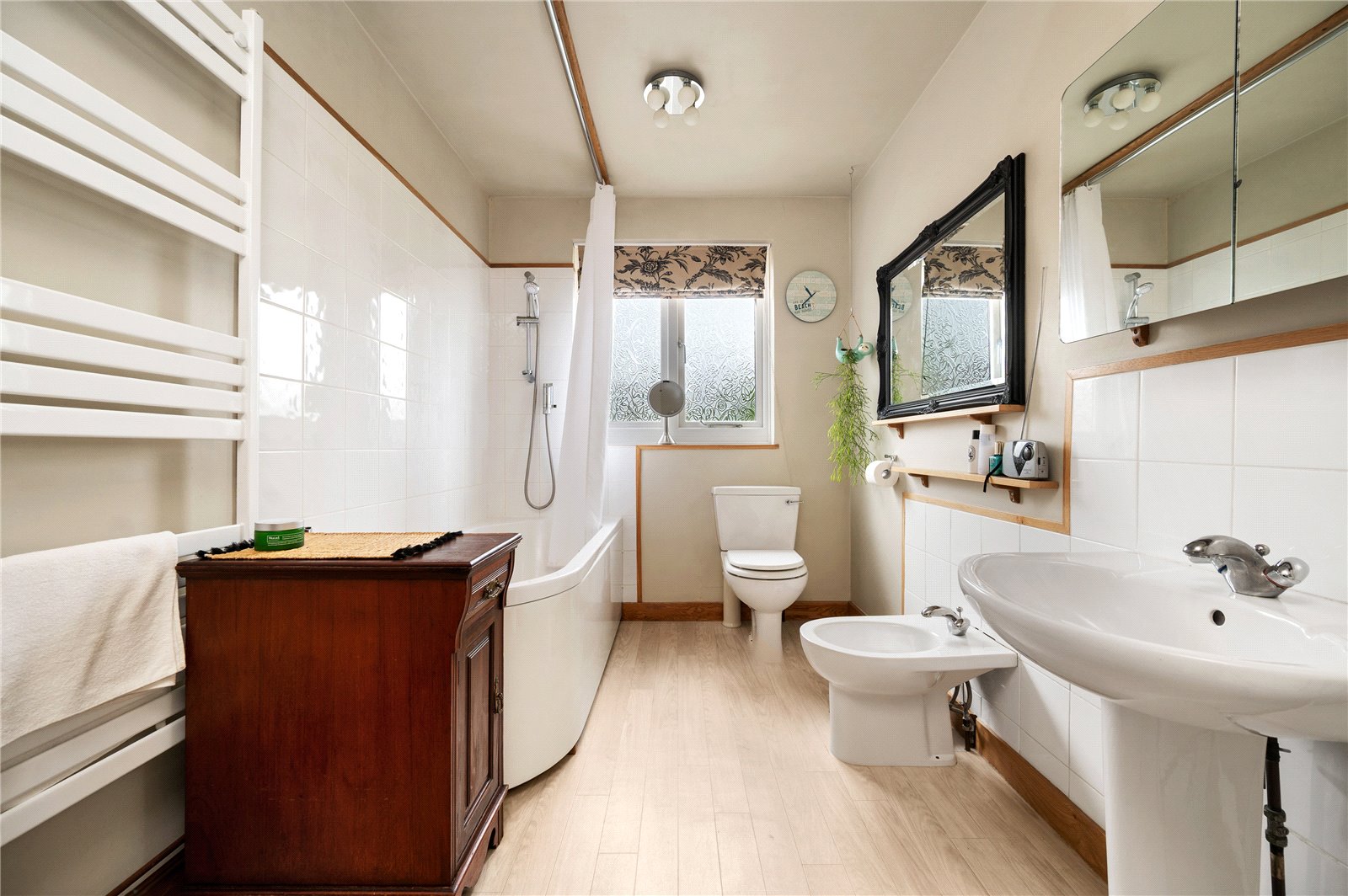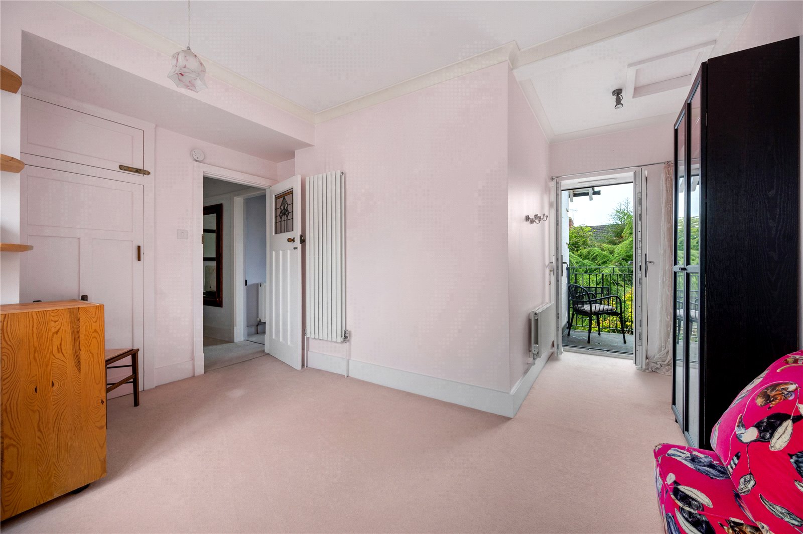 Upstairs, a wide landing leads to three well-proportioned double bedrooms. The principal bedroom is particularly generous and benefits from access to a private balcony overlooking the rear garden, offering an elevated outlook and space for seating. The remaining bedrooms are evenly sized and well-lit, providing flexible living. The family bathroom is spacious and fitted with a bath with shower over, WC, basin and a bidet.