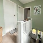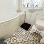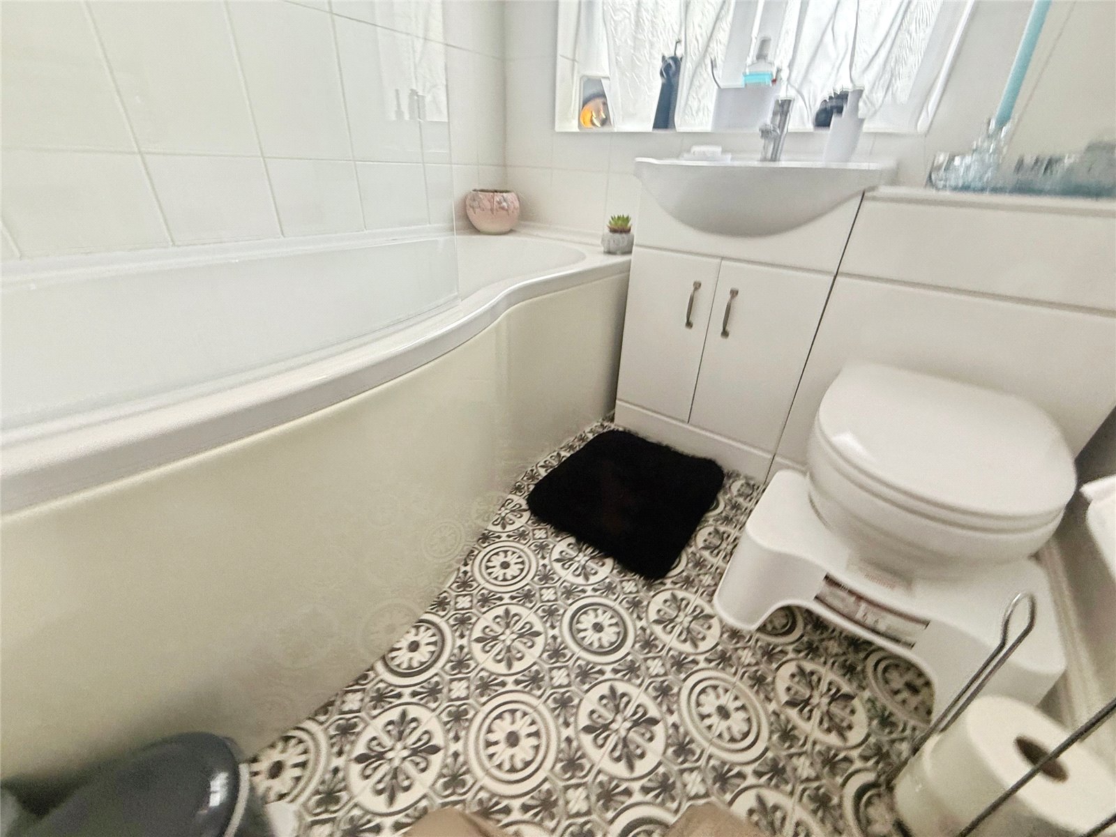 Upstairs, the home offers three comfortable bedrooms, each well proportioned and filled with natural light. The main bedroom benefits from generous dimensions and a pleasant outlook, while the further two bedrooms provide excellent space for children, guests, or a home office. The family bathroom has been updated with modern fittings, including a bath with shower over, a wash basin with built-in vanity storage, and a WC, all complemented by stylish tiling.
