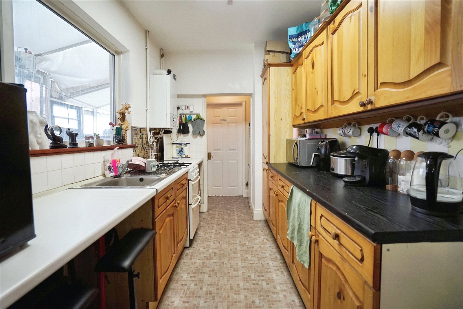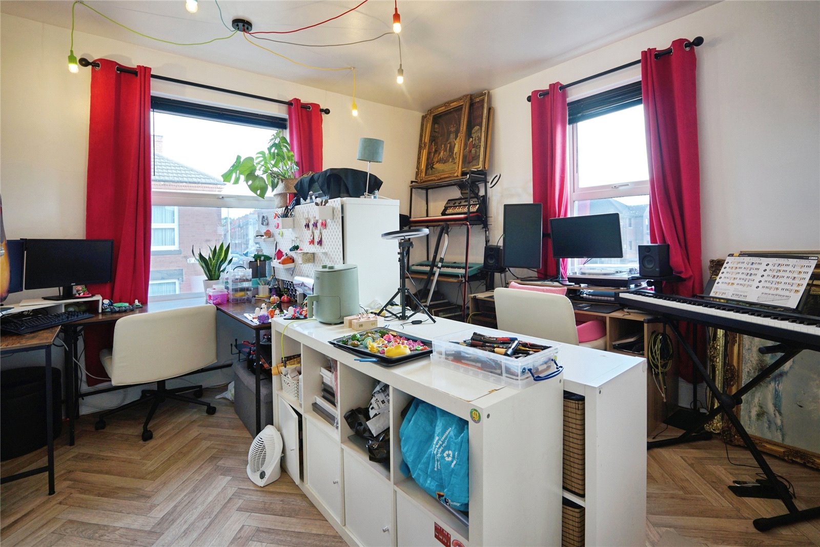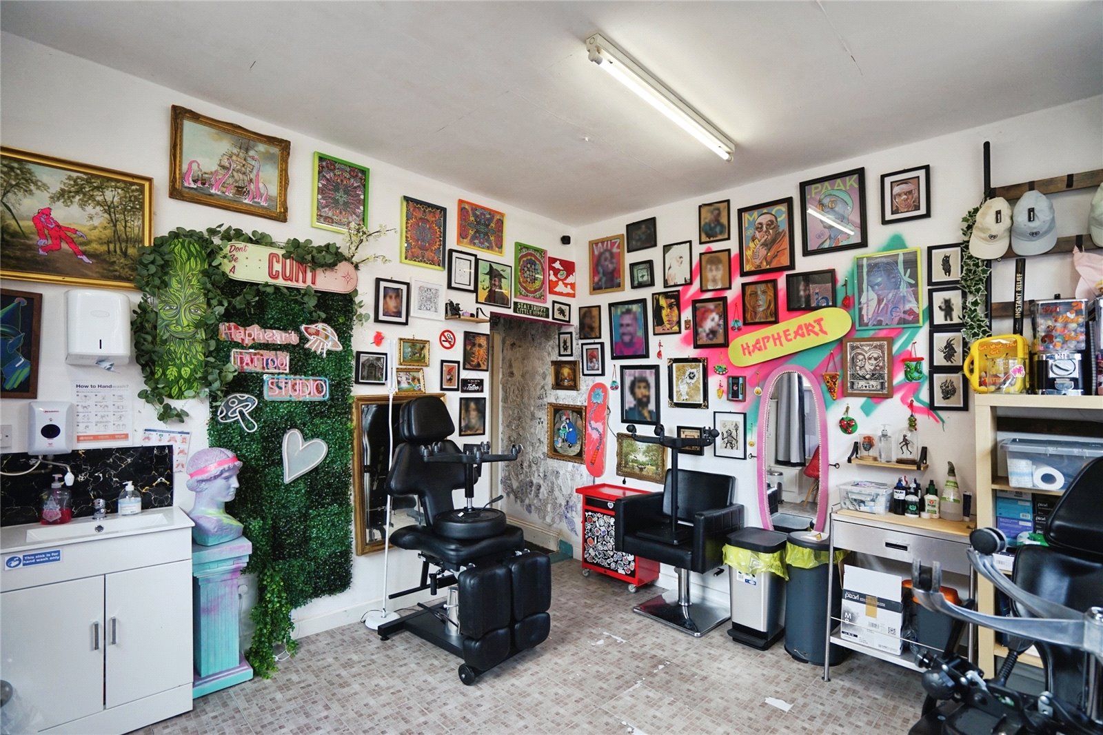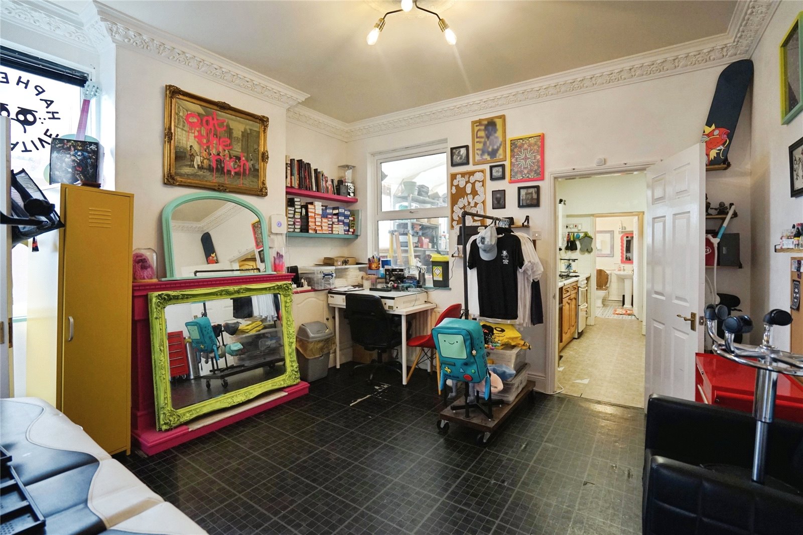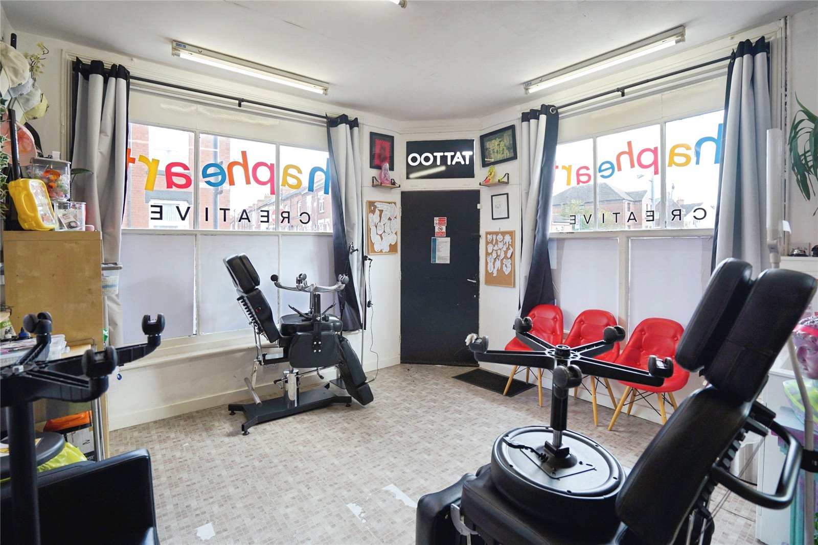 The ground floor comprises a spacious front unit, most recently used as a tattoo studio, which benefits from large display windows offering excellent street presence and footfall. This flexible space is suitable for a range of business purposes such as retail, salon, office, or studio space. To the rear, there is a dining area, fitted kitchen, and bathroom facilities, along with useful storage space.