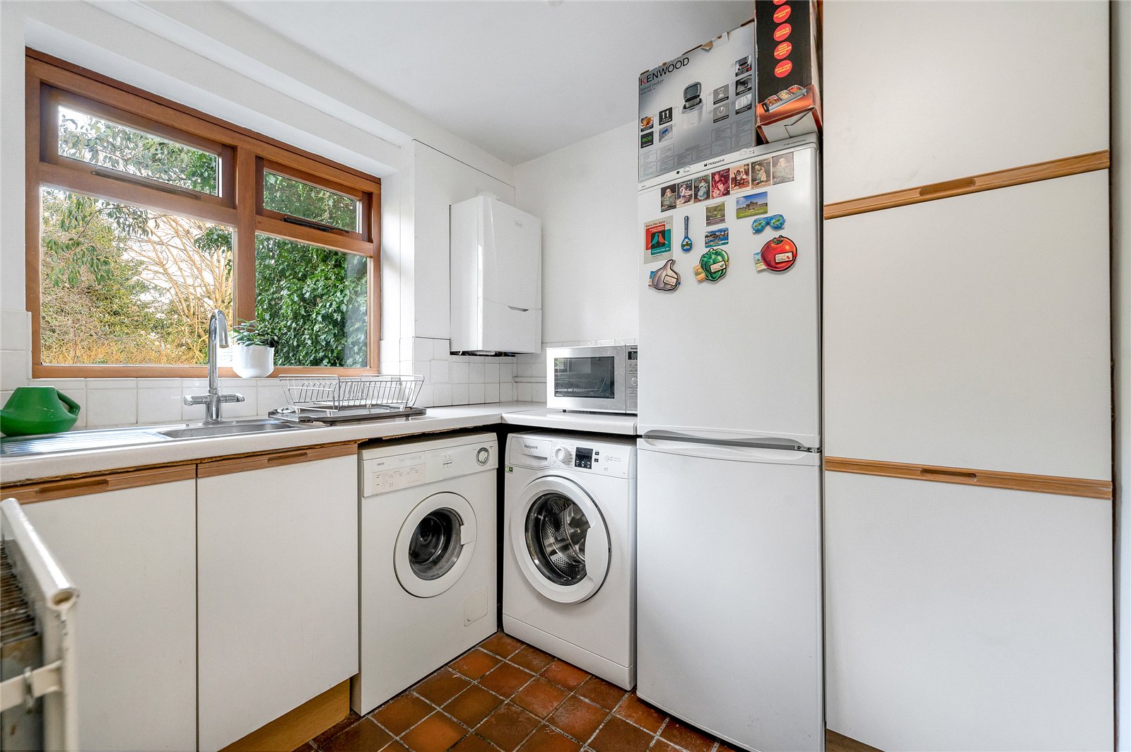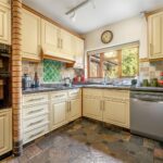 To the right of the sitting room and overlooking the gorgeous rear garden is the attractive and recently upgraded Country-style kitchen with pretty exposed brick and a decorative and colourful slate tiled floor. Beneath the window is a double drainer sink with a mixer tap and there is a range of wall, base and drawer units with composite work surfaces, upstands and part-tiled walls above, with concealed lighting under the wall cupboards. Integrated appliances include a double oven, a Halogen hob and an extractor hood above while there is also space for a dishwasher and an under-counter fridge. On one side is ample space for a breakfast table and chairs while a part-glazed door opens into a covered passageway that leads to the garage and to the utility room, which has a tiled floor, a single drainer stainless steel sink with a mixer tap below the window, base units providing ample storage, as well as space for a tumble dryer, a washing machine and a fridge/freezer.