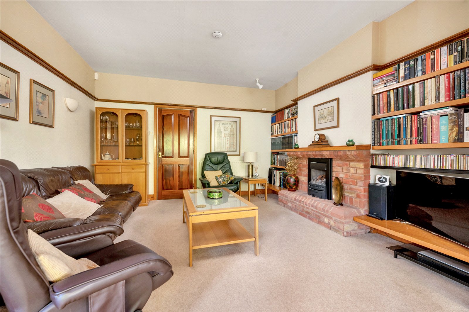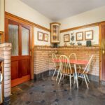 Back through the entrance porch is a part-glazed door with a beautiful stained glass window on one side that opens into a second inner entrance hall, which is carpeted with the turned staircase to the first floor. The hall offers plenty of space for sideboards and seating, and beneath the stairs is a large storage cupboard. From here is the elegant sitting room complete with a gas coal-effect fire set in a super red brick fireplace, adding an unmatched warmth and ambience to the room. The fire sits on a raised brick hearth with a brick surround and a wood mantel above. A square arch leads into the impressive dining room with a square bay window looking out over the garden. It has a solid oak boarded wood floor, exposed brickwork and a truly magnificent wood-panelled vaulted ceiling a fabulous setting for entertaining and family gatherings.