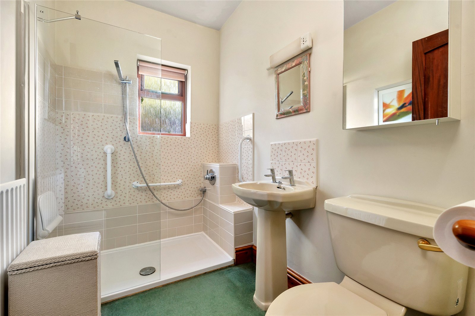 The carpeted stairs from the hall split to the left and right at a half landing. Off the left staircase, which leads onto a landing with a large storage cupboard, are two double bedrooms and a part-tiled bathroom with a wood floor, which has a four-piece suite incorporating a corner panelled bath with a mixer tap, a low-level WC, a bidet and a wall-mounted wash hand basin with a mirror above. Adjacent is an independent shower cubicle with an electric shower and a glass shower screen.