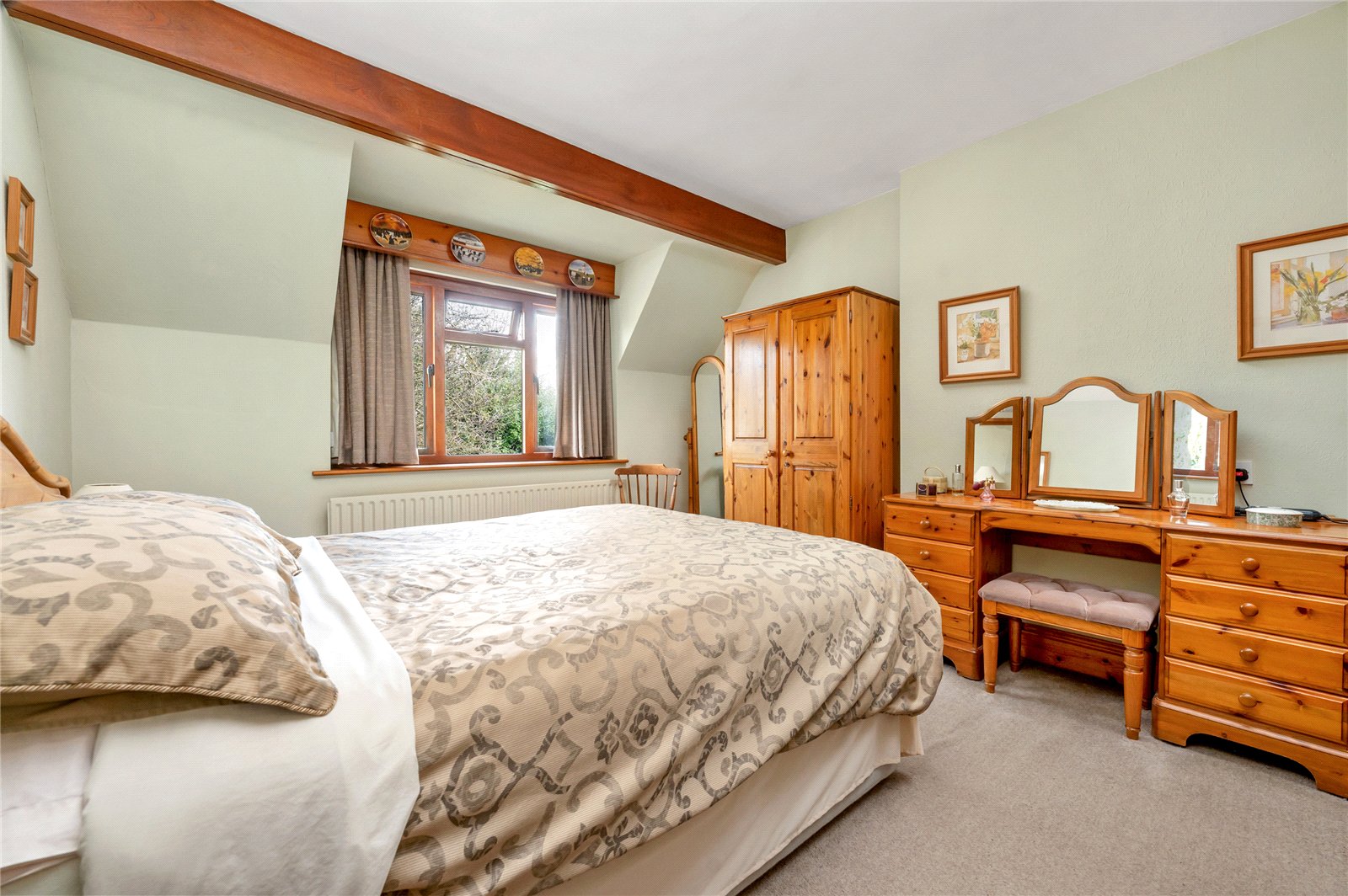 There is generous living accommodation with impressive vaulted ceilings, adding to the feeling of space surrounding you. Beautiful exposed brick walls and feature fireplaces provide a warm and inviting environment that you won’t be able to resist. Outside are mature south-facing landscaped gardens to the front and a rear garden that offers a high level of seclusion.