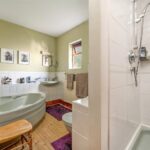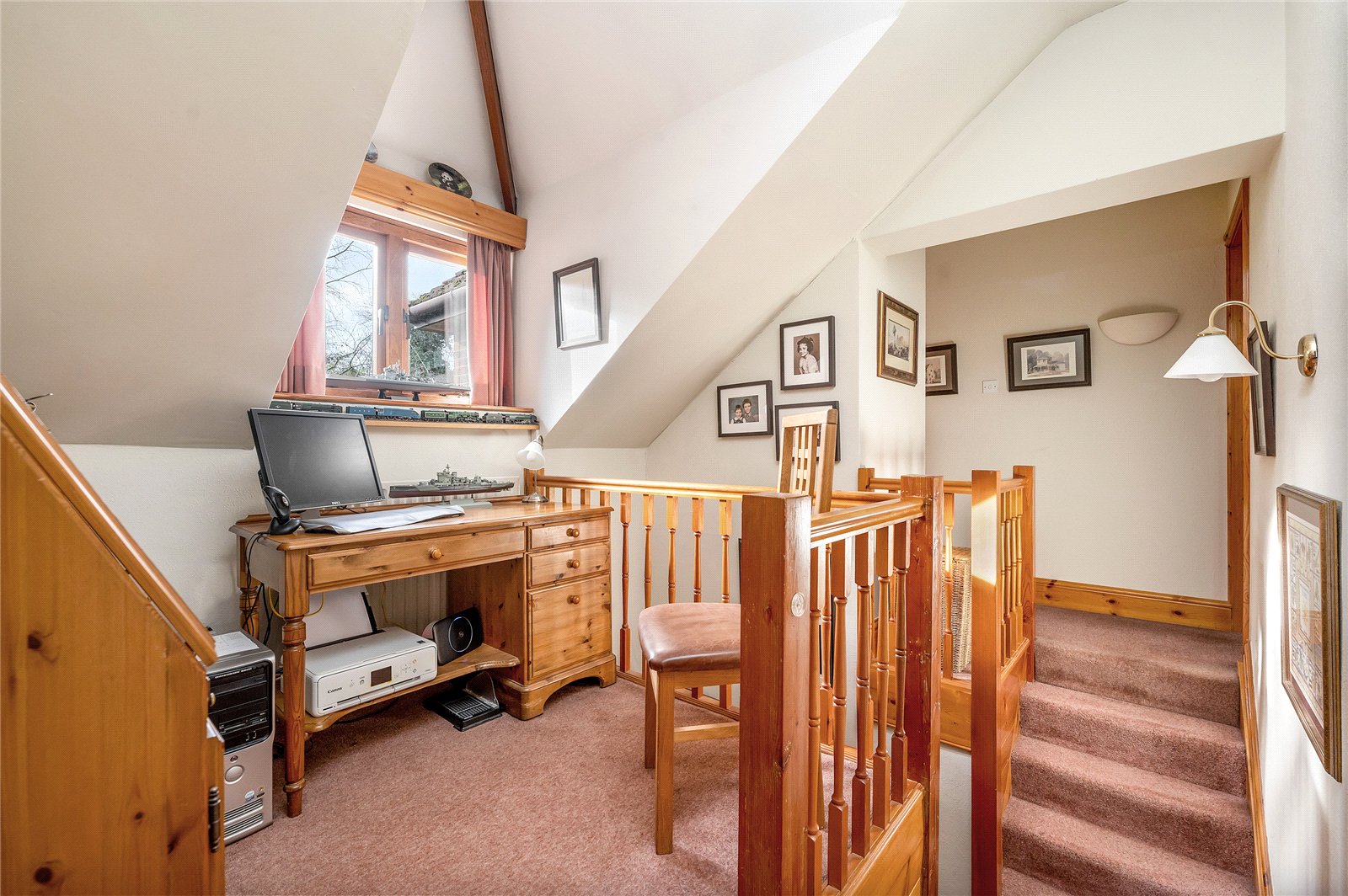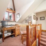 Off the right staircase is a galleried landing with a large facing window and vaulted ceiling, which is a lovely, light and plentiful space that’s perfect for use as an office/study area. From here there are three double bedrooms and a second part-tiled bathroom, which has a coloured suite with a wood-panelled bath that has a mixer tap, a low-level WC and a pedestal wash hand basin with twin taps.