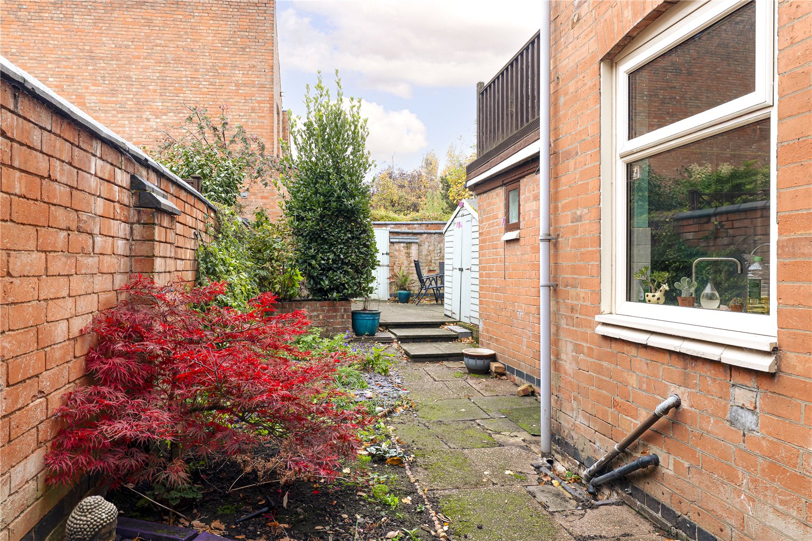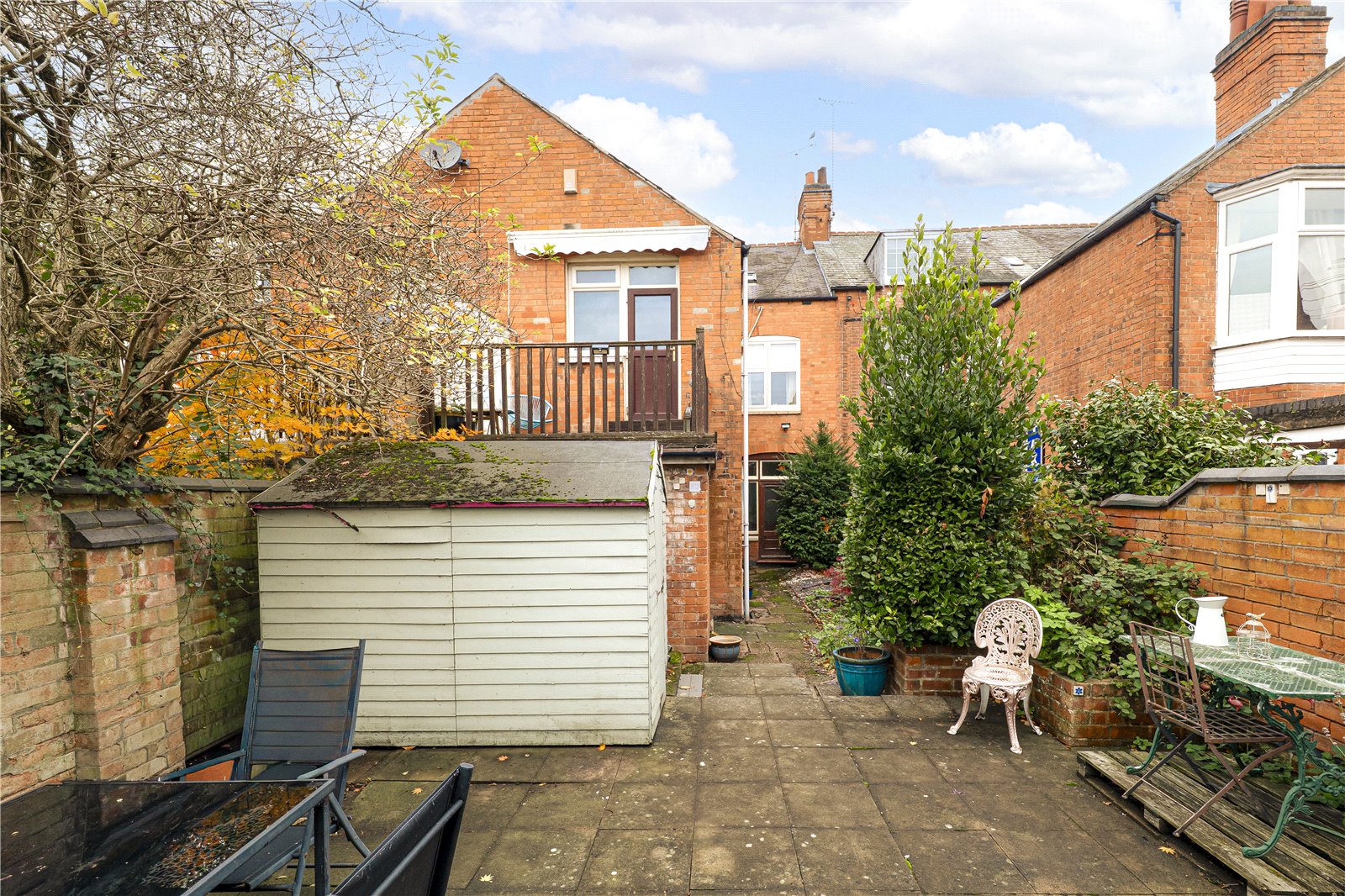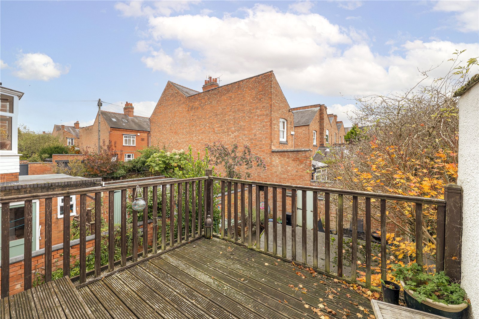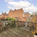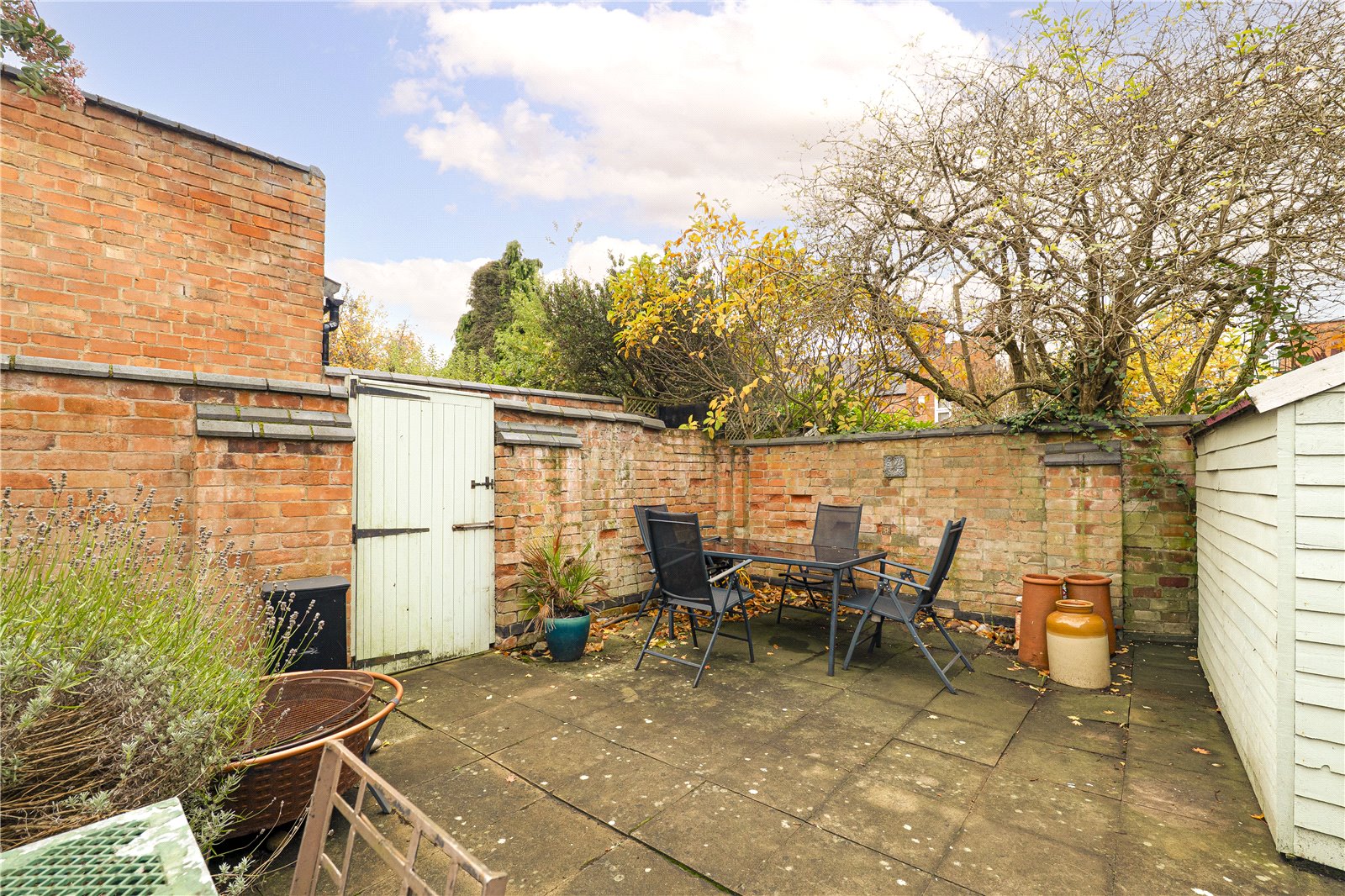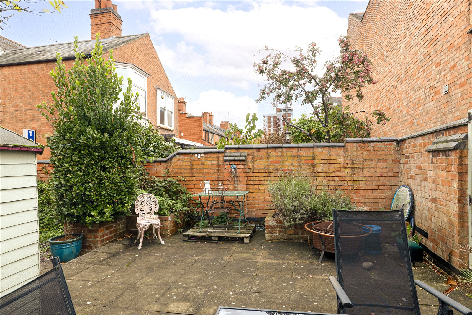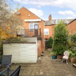 Outside, the rear garden is a peaceful and private courtyard-style space, enclosed by brick walls and mature greenery. It’s largely paved for easy upkeep, with established borders softening the edges and providing a splash of colour through the seasons. There’s plenty of room for outdoor seating and dining, making it a lovely area for entertaining. The first floor balcony above enjoys an attractive outlook across the garden and neighbouring rooftops, adding another pleasant outdoor spot. At the front, the house is set back from the road behind neat hedging and a low brick wall, giving both privacy and a welcoming approach from Victoria Park Road.
